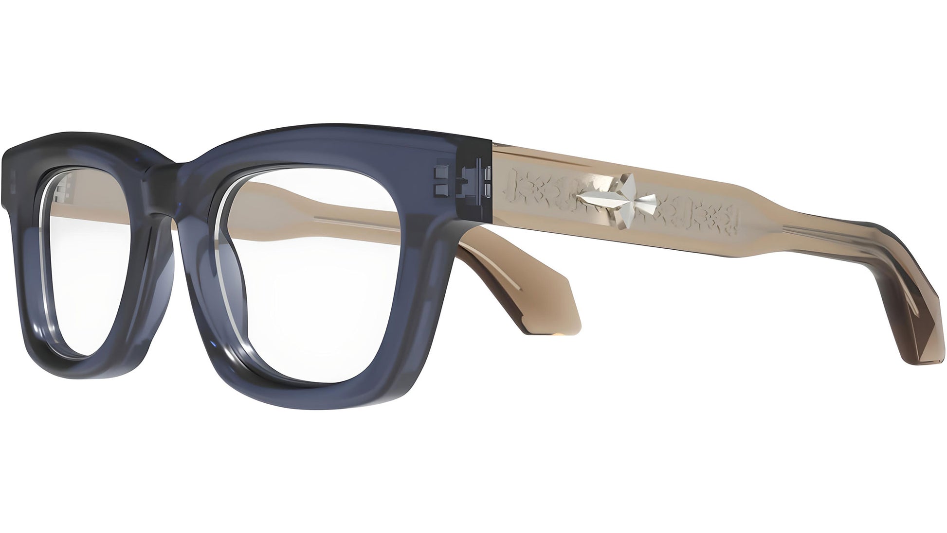 Pugnale Eyewear optical model N474V Relation color code 34 in blue / brown. Full rim square acetate frame with demo lens. The brand's identifying logo proudly marks the Priscilla line of Pugnale Eyewear. The woman is a diamond, multifaceted in every aspect. She embodies strength and sweetness, tenacity and courage, perseverance and charisma - adjectives that converge to form a singular expression of beauty. Vivid and radiant colors blend with femininity in iconic shapes, reimagined in the way Pugnale Eyewear uniquely appreciates, characterized by boldness and high design content.