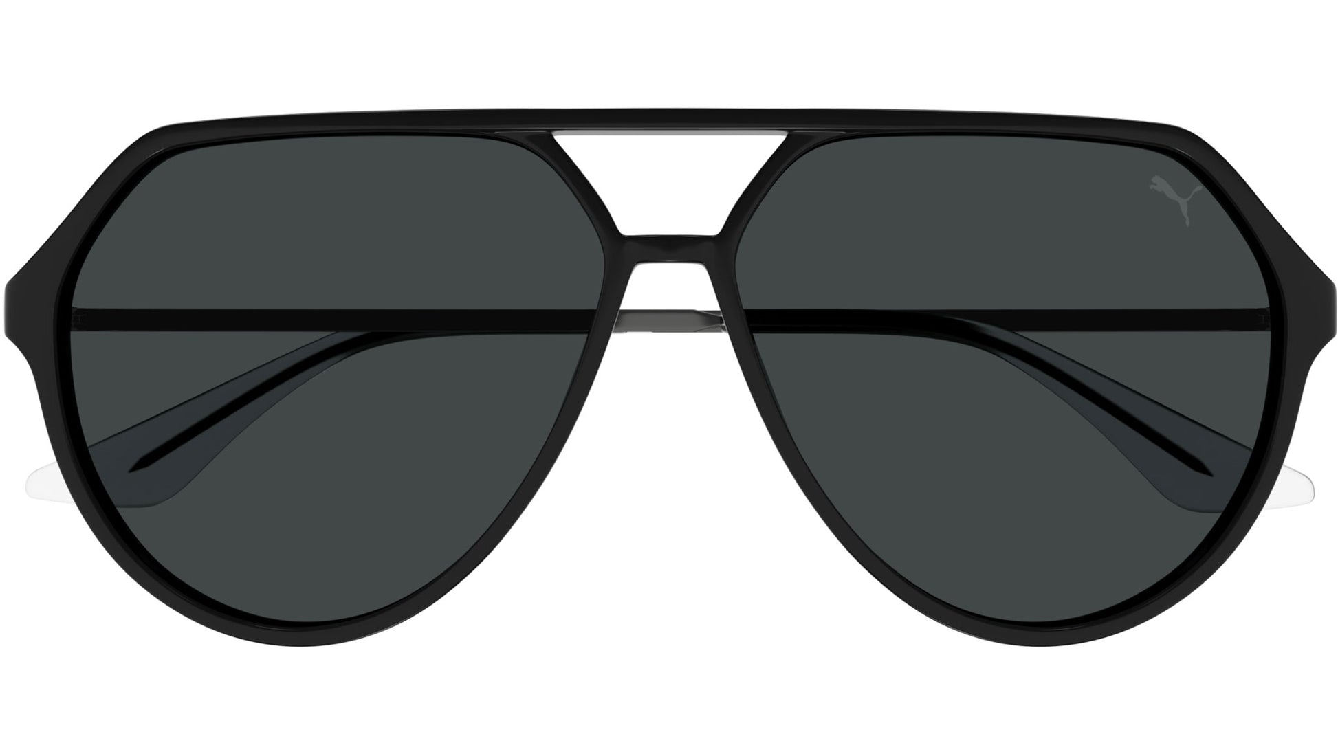 Puma Nostalgia line sunglasses model PU0459S, aviator injection frame, color code 001 featuring shiny black front with ruthenium temple and solid smoke lenses. Authorized Puma online reseller. Your glasses will come with the original case and accessories and will be covered by a 12-month global warranty.