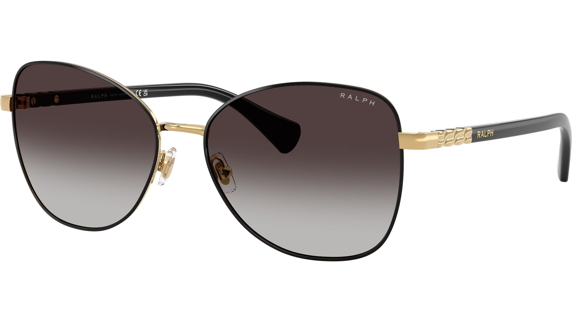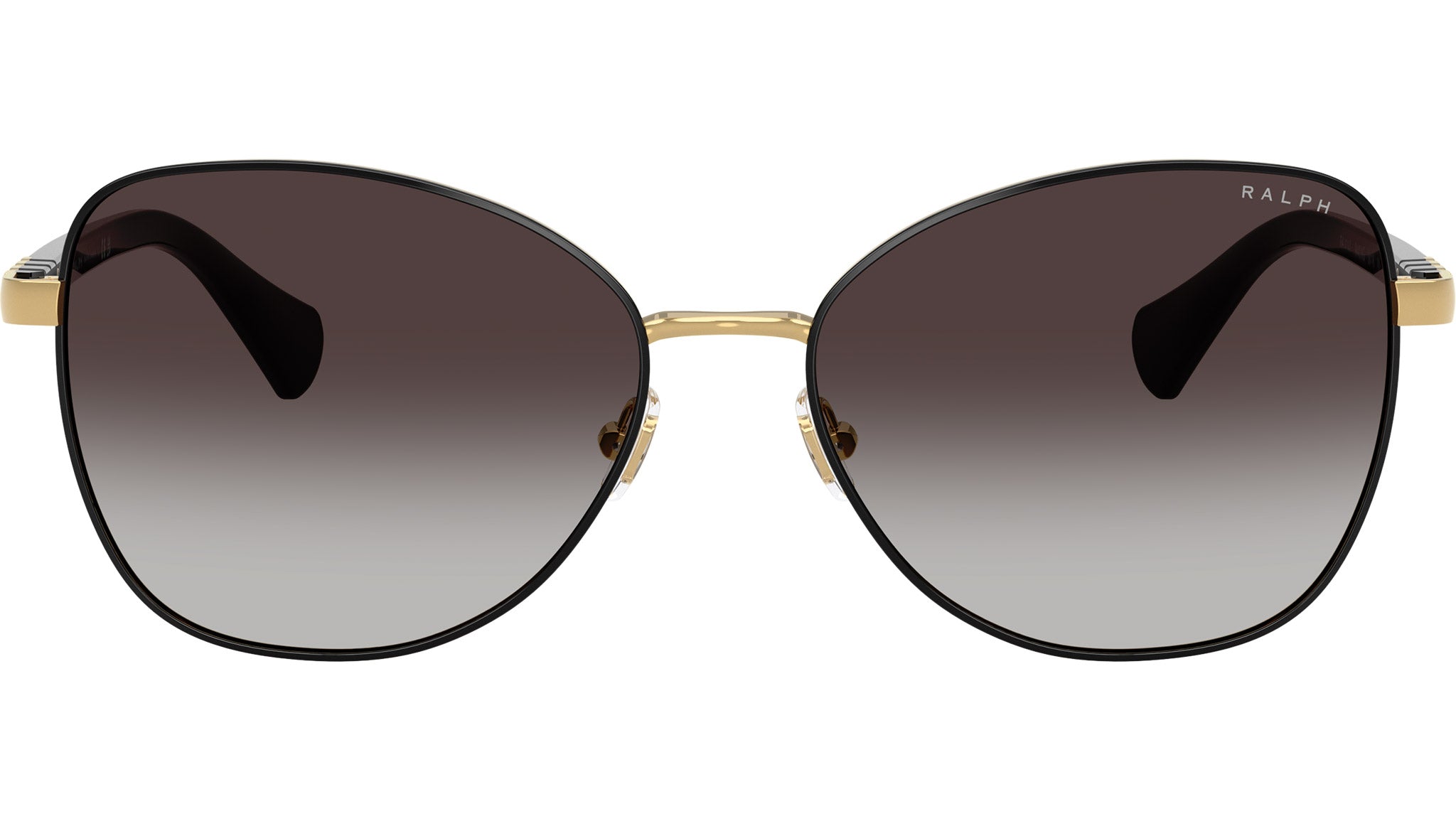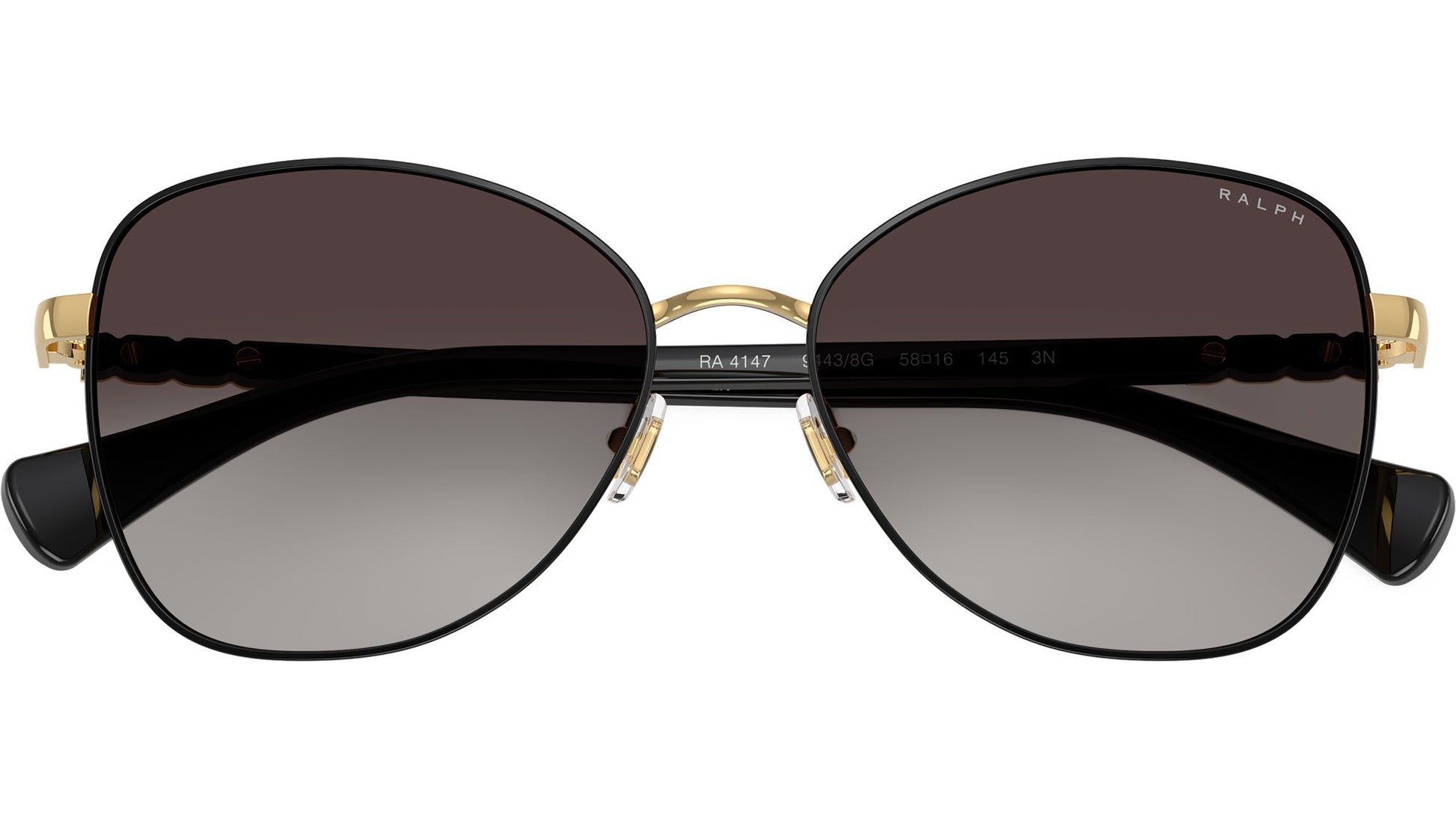 Ralph RA4147 94438G sunglasses, featuring shiny black butterfly metal frame and grey gradient polyamide lenses. Adjustable nosepads. Brand line: Glamour. Style code: 0RA4147. Color code: 94438G. Authorized Ralph online reseller. Your glasses will include the original case and accessories and are covered by a 12-month global warranty.