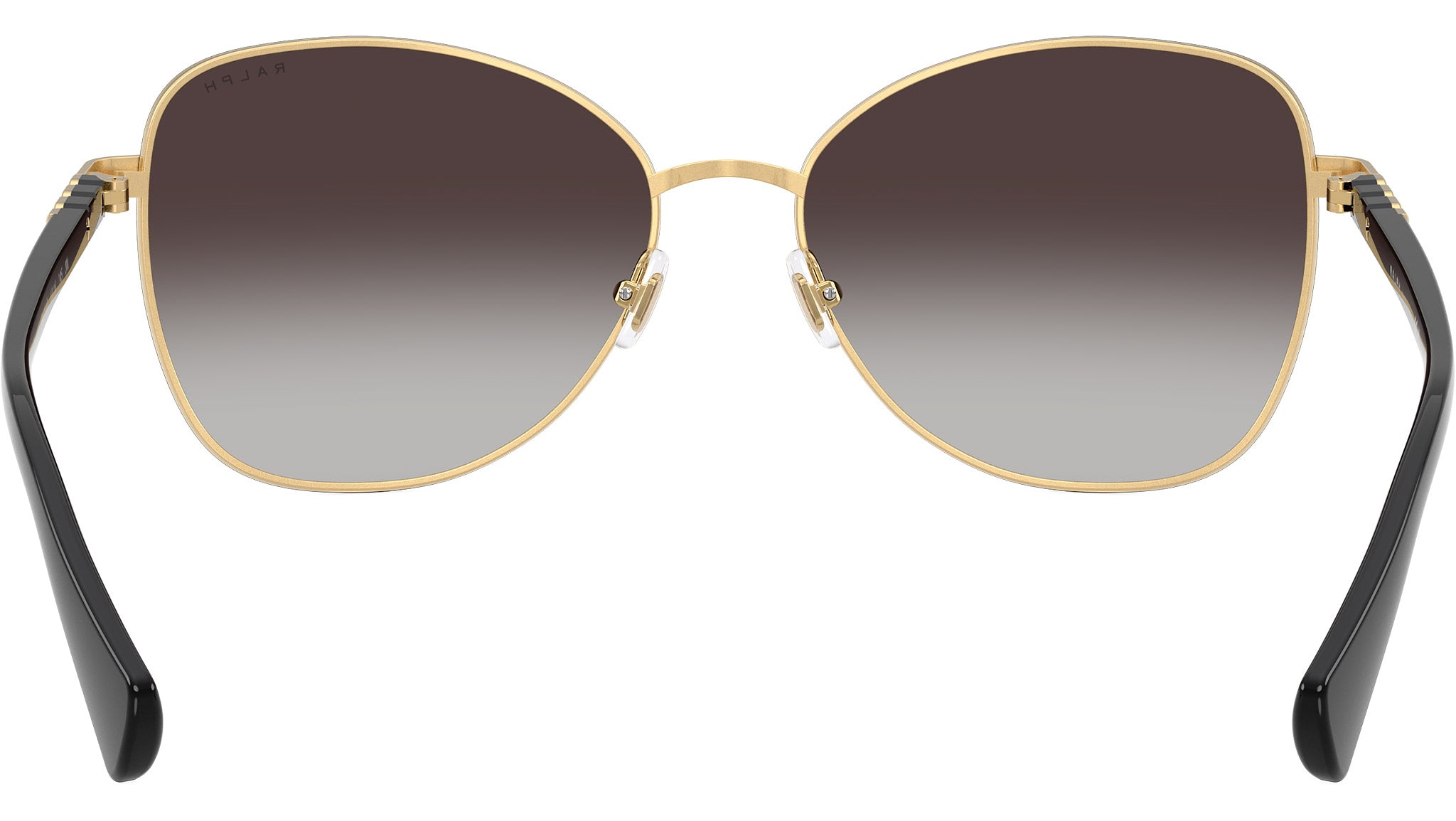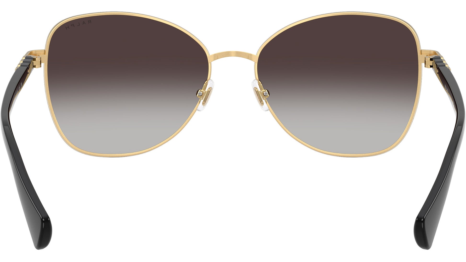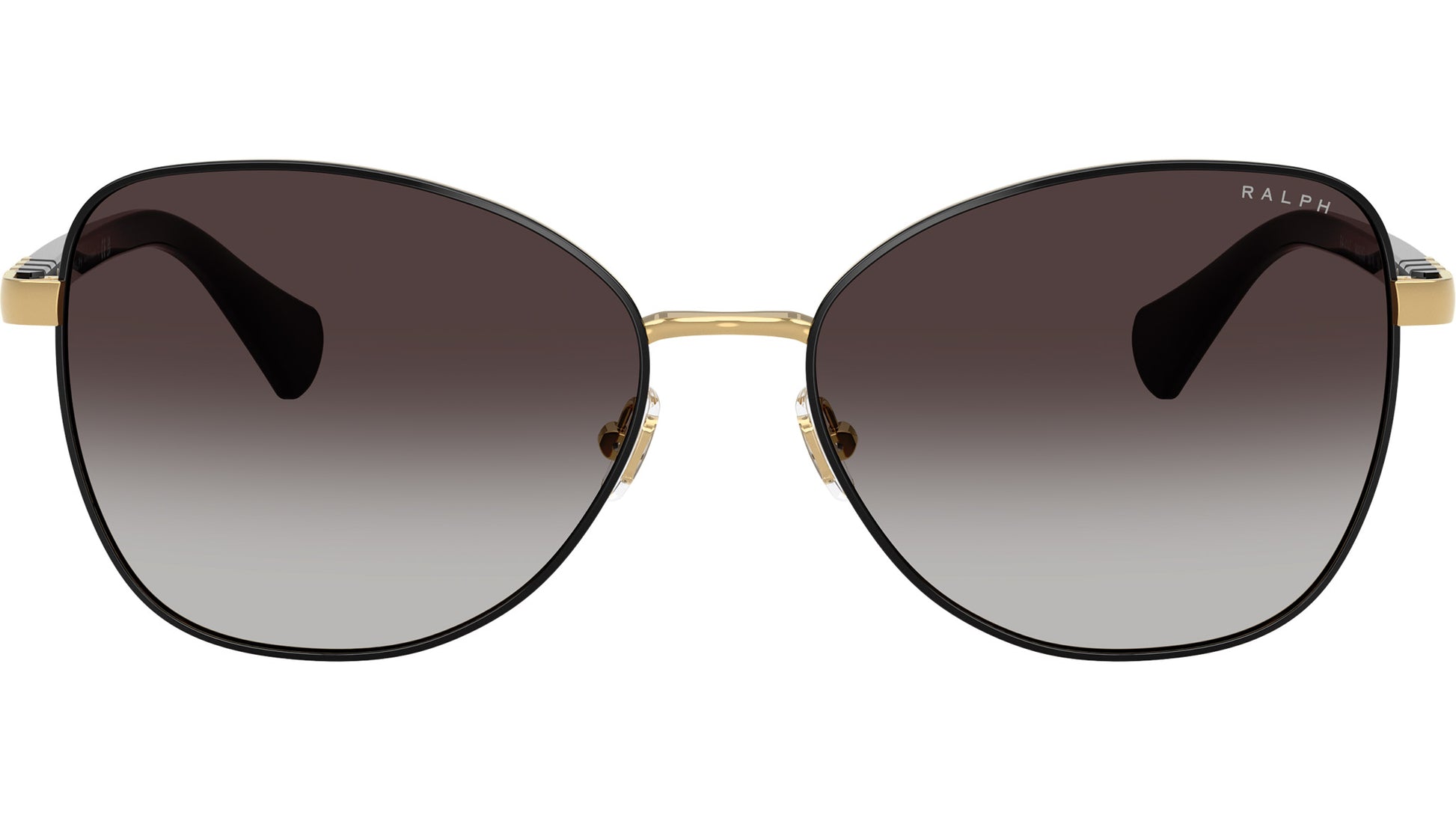 Ralph RA4147 94438G sunglasses, featuring shiny black butterfly metal frame and grey gradient polyamide lenses. Adjustable nosepads. Brand line: Glamour. Style code: 0RA4147. Color code: 94438G. Authorized Ralph online reseller. Your glasses will include the original case and accessories and are covered by a 12-month global warranty.
