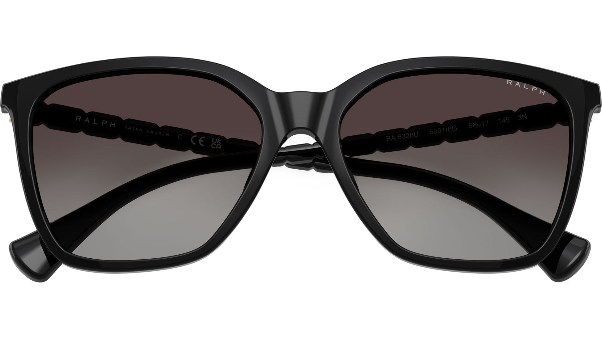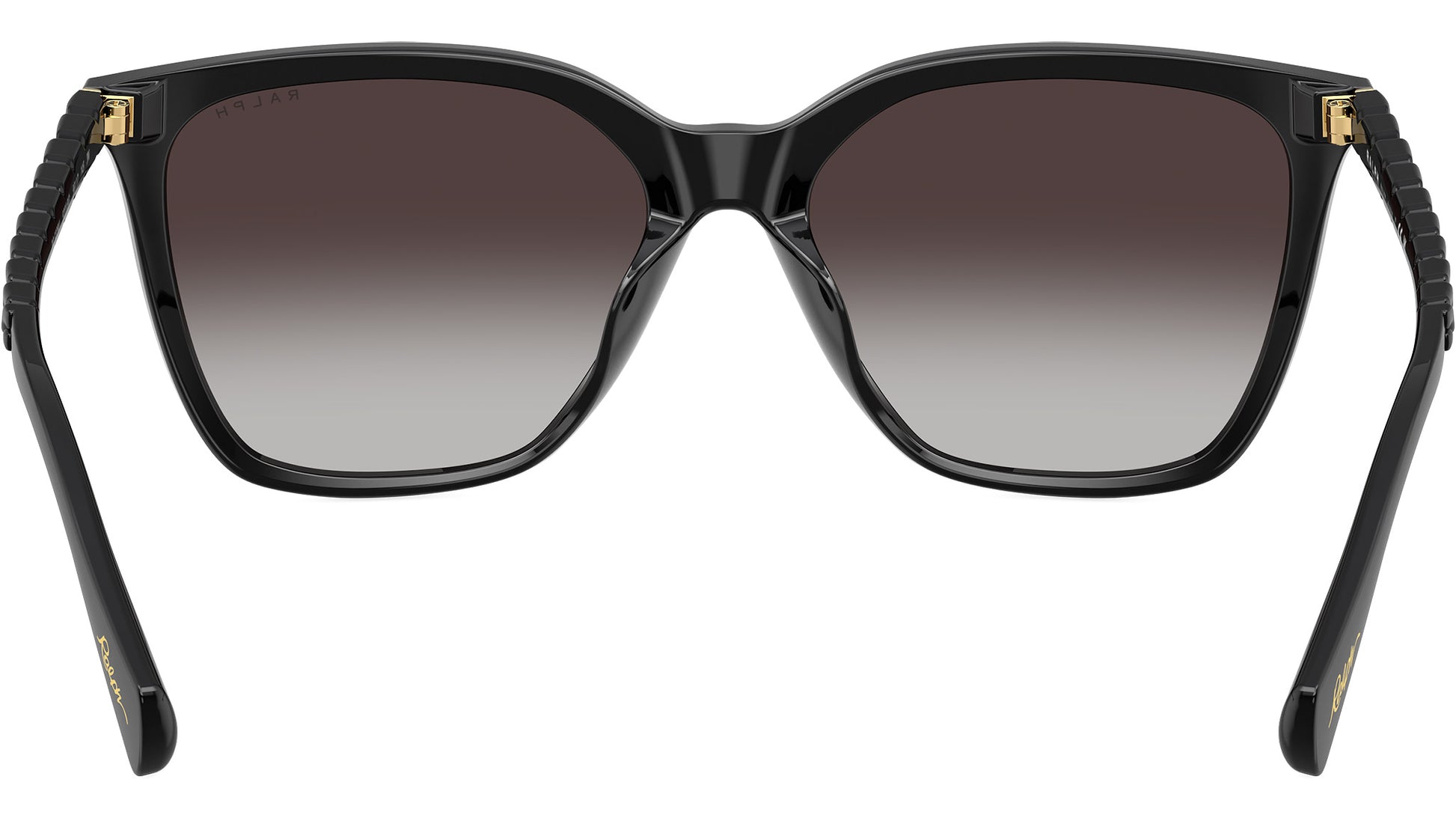 Ralph RA5328U 50018G sunglasses, featuring shiny black squared injection frame and grey gradient polyamide lenses. Universal fit. Brand line: Trendy&Fashion. Style code: 0RA5328U. Color code: 50018G. Authorized Ralph online reseller. Your glasses will include the original case and accessories and are covered by a 12-month global warranty.