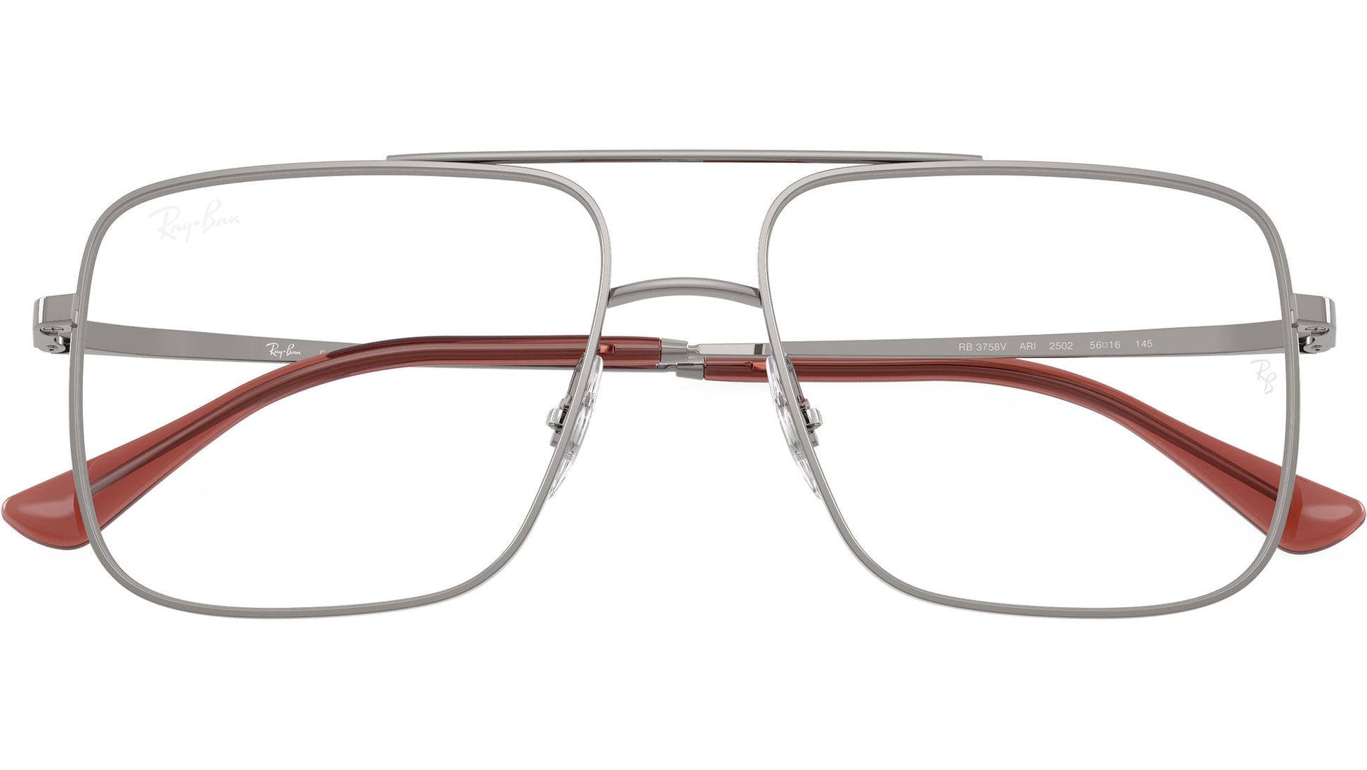 Ray-Ban Ari RB3758V 2502 glasses for men and woman, featuring gunmetal squared metal frame and demo lens. Adjustable nosepads. Brand line: Nowness. Style code: 0RX3758V. Color code: 2502. Authorized Ray-Ban online reseller. Your glasses will include the original case and accessories and are covered by a 12-month global warranty.