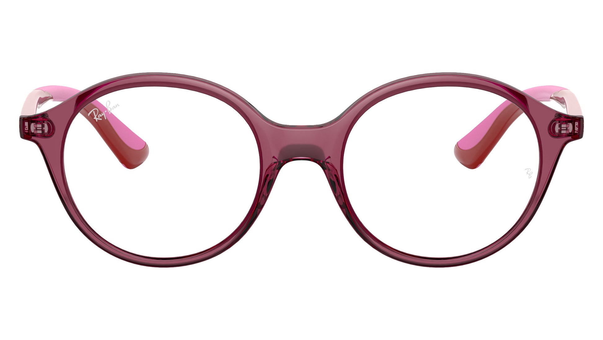 Ray-Ban Kids RY1606 trasparent pink acetate eyeglasses, color code 3777. Full Rim round frame shape with demo lens. Authorised Ray-Ban Reseller. Includes genuine case.
