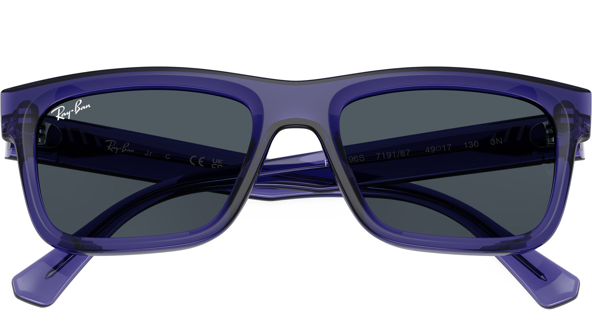 Ray-Ban Junior RJ9196S 719187 sunglasses for boys and girls, featuring transparent violet rectangular injection frame and dark grey bio polyamide lenses. High bridge fit. Brand line: Kids Icons. Style code: 0RJ9196S. Color code: 719187. Authorized Ray-Ban online reseller. Your glasses will include the original case and accessories and are covered by a 12-month global warranty.