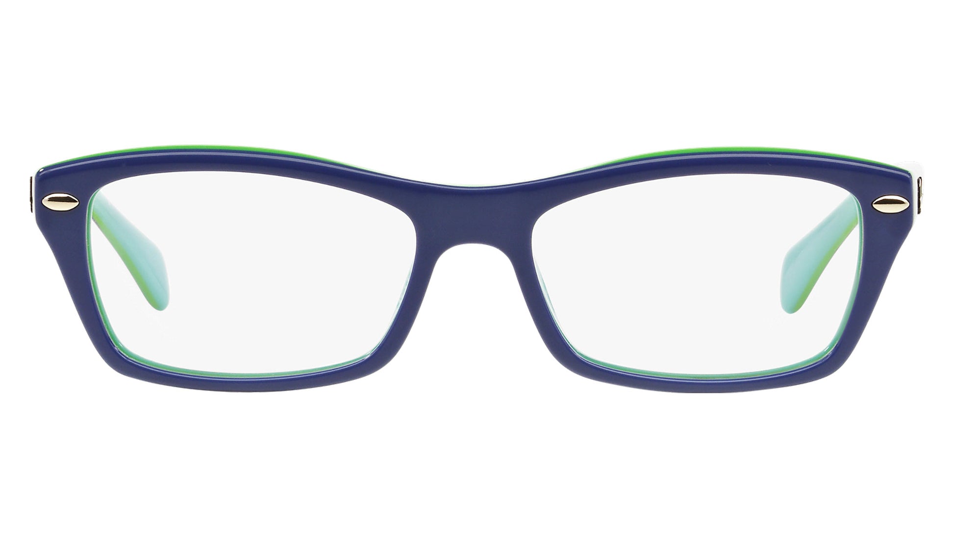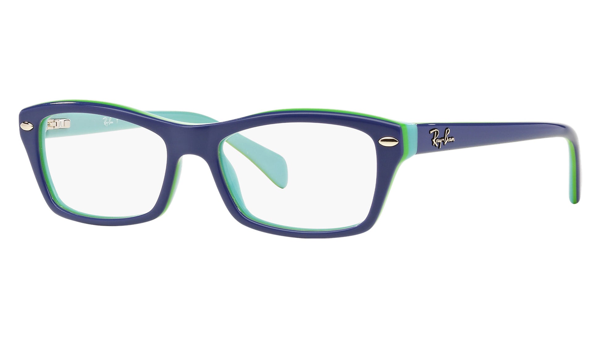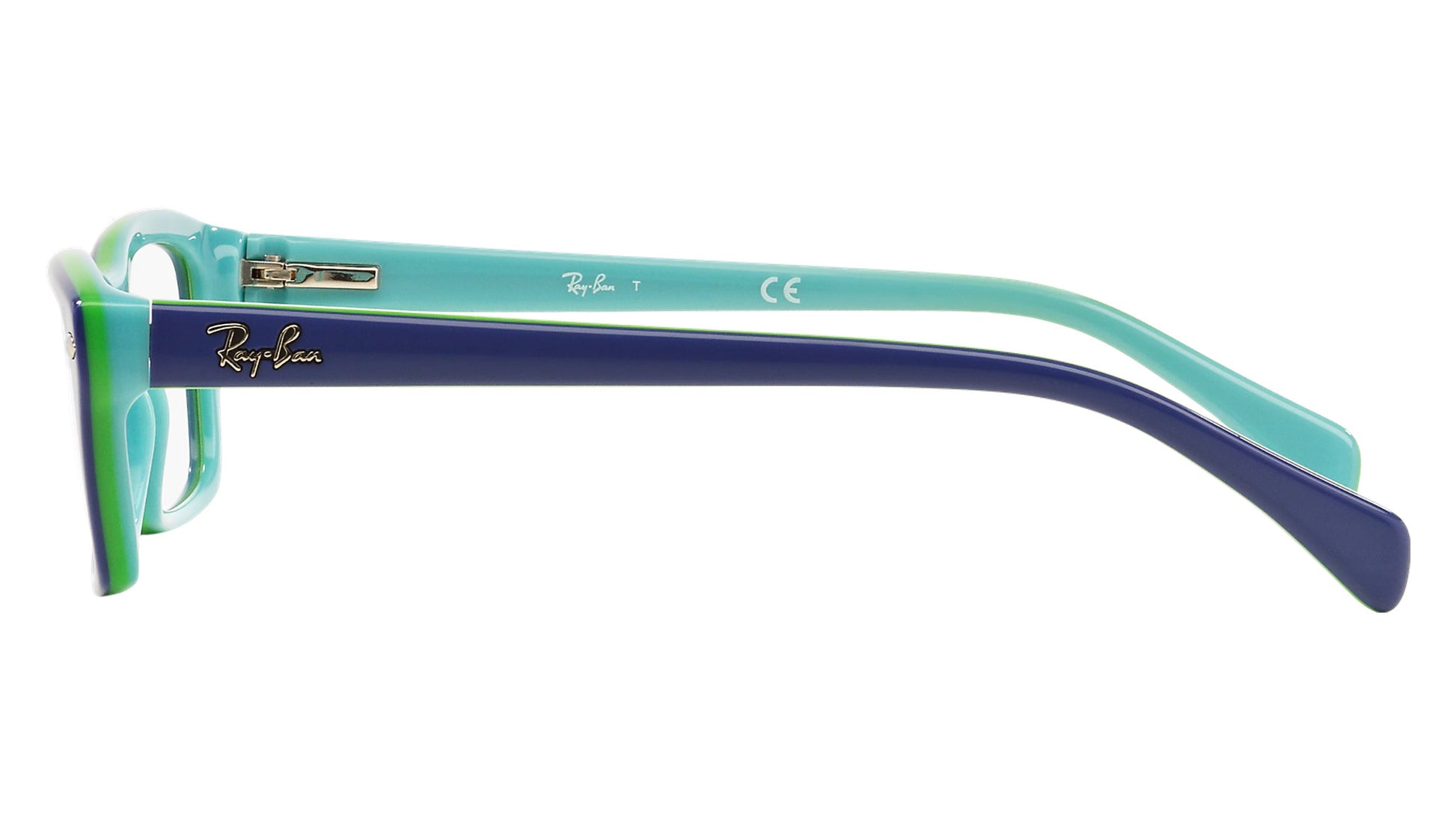 Ray-Ban Kids RY1550 violet on green azure acetate eyeglasses, color code 3657. Full Rim butterfly frame shape with high bridge fit and demo lens. Authorised Ray-Ban Reseller. Includes genuine case.