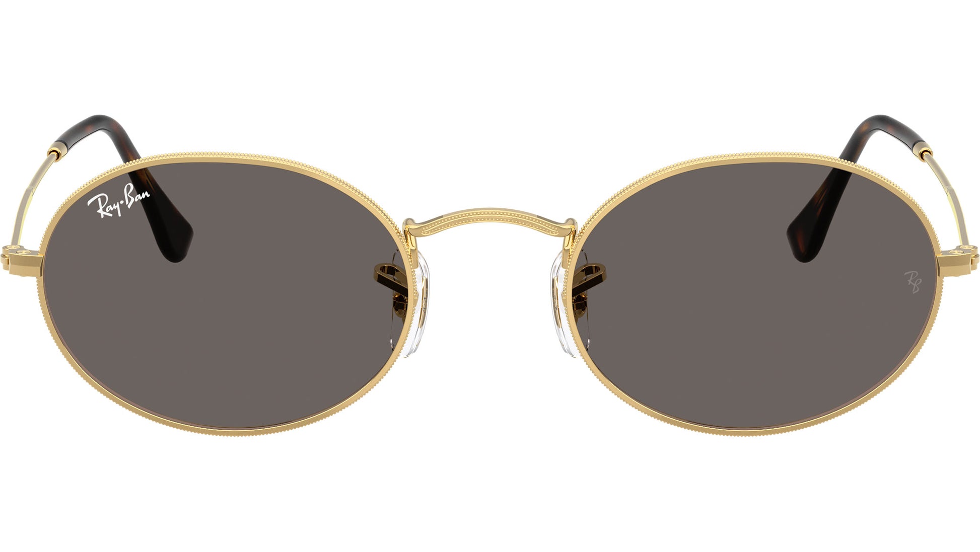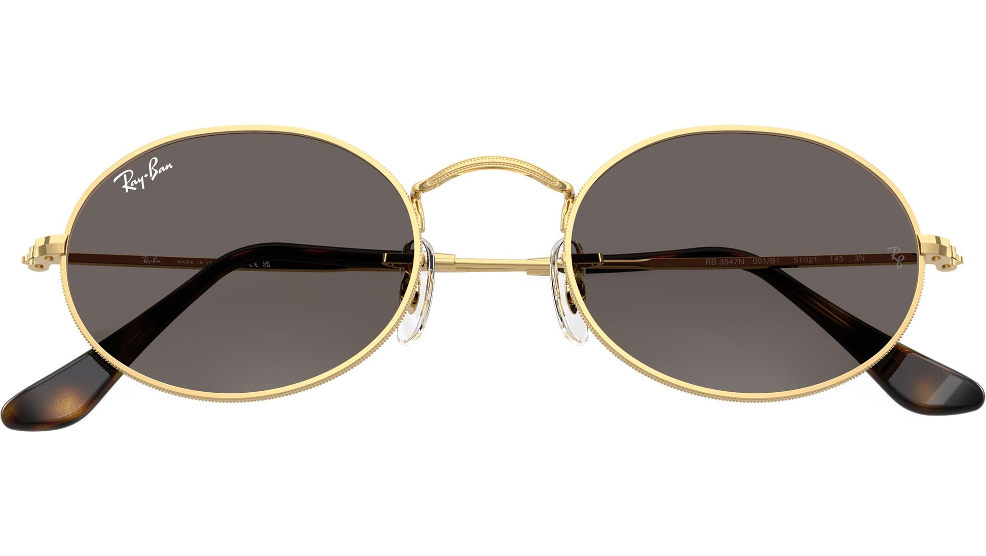 Ray-Ban Oval Flat Lenses RB3547N 001/B1 sunglasses for men and woman, featuring arista gold oval metal frame and dark grey glass lenses. Adjustable nosepads. Brand line: Evolution. Style code: 0RB3547N. Color code: 001/B1. Authorized Ray-Ban online reseller. Your glasses will include the original case and accessories and are covered by a 12-month global warranty.