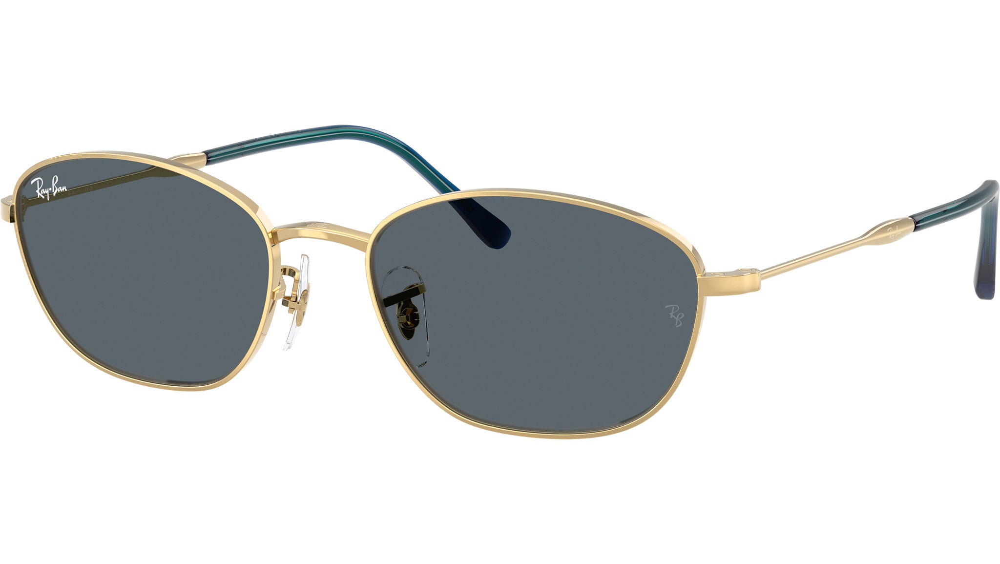 Ray-Ban RB3749 9278R5 sunglasses for women, featuring arista gold geometric metal frame and blue glass lenses. Adjustable nosepads. Brand line: Evolution. Style code: 0RB3749. Color code: 9278R5. Authorized Ray-Ban online reseller. Your glasses will include the original case and accessories and are covered by a 12-month global warranty.