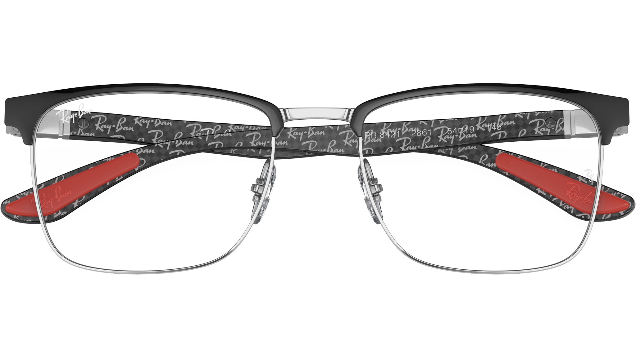 Ray-Ban RB8421 Optics RB8421 2861 glasses for men and woman, featuring black on silver squared metal frame and demo lens. Adjustable nosepads. Brand line: Performance. Style code: 0RX8421. Color code: 2861. Authorized Ray-Ban online reseller. Your glasses will include the original case and accessories and are covered by a 12-month global warranty.
