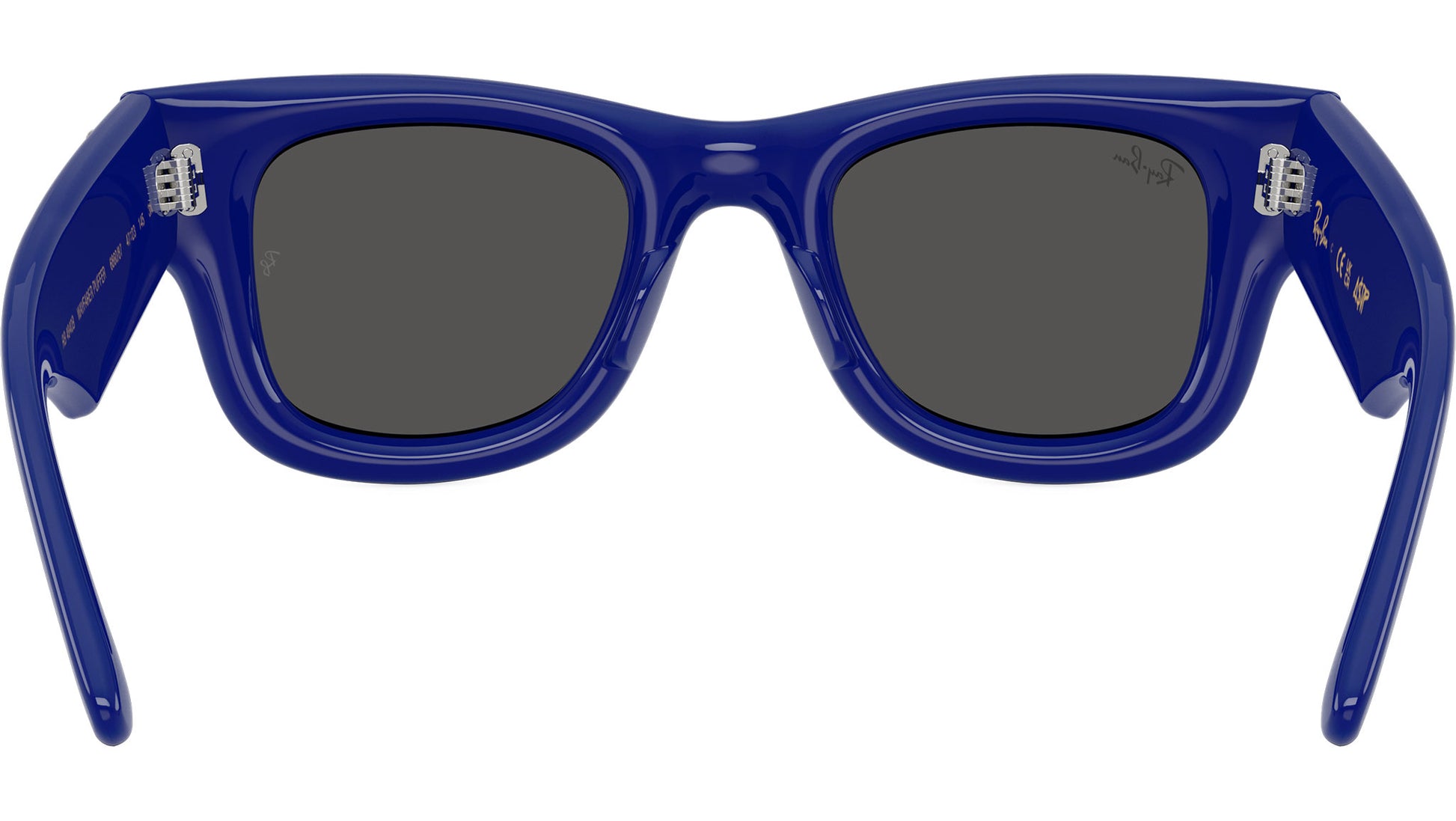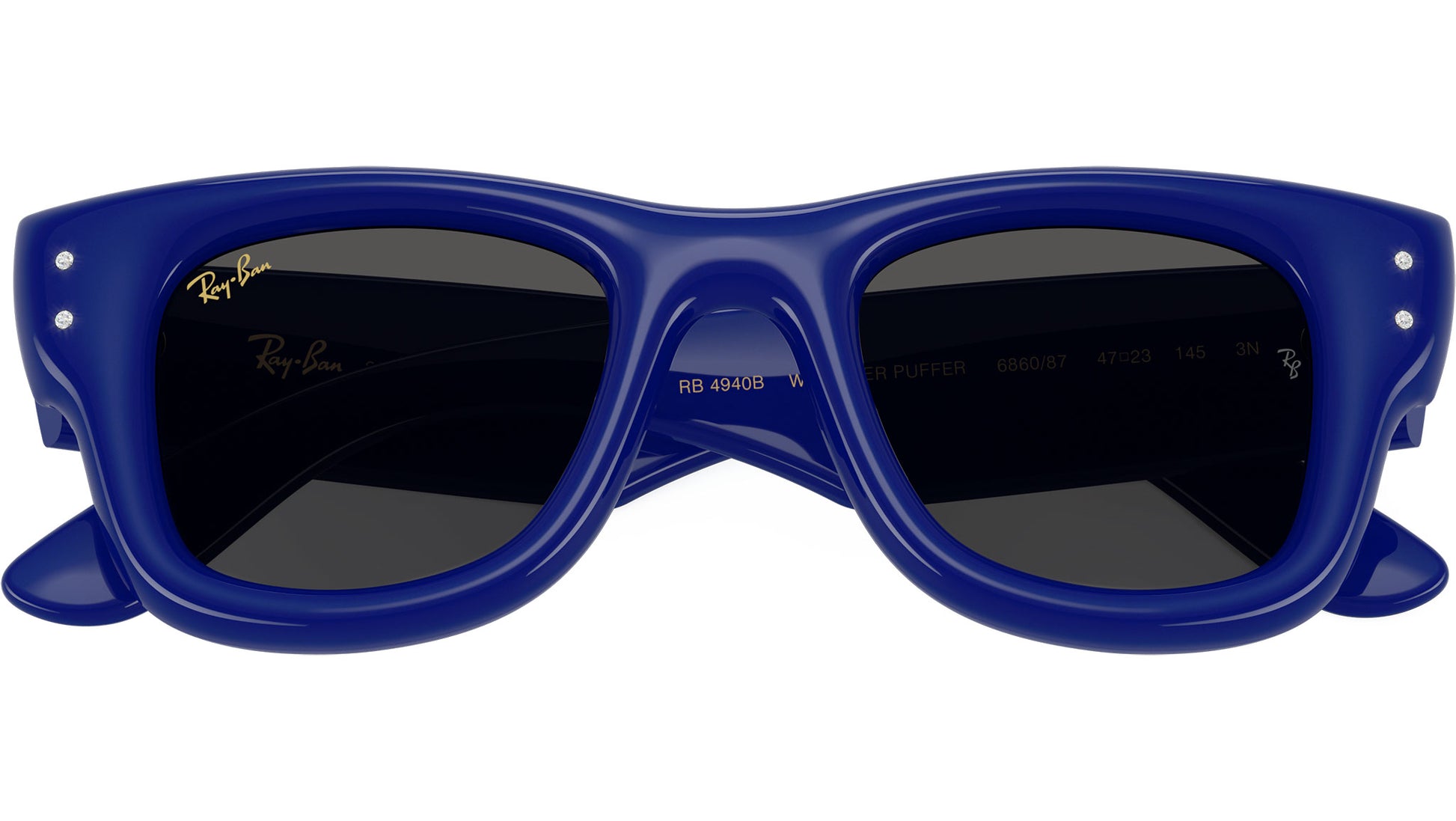 Ray-Ban Wayfarer Puffer RB4940B 686087 sunglasses for men and woman, featuring blue & strass squared nylon frame and dark grey bio polyamide lenses. High bridge fit. Brand line: Evolution. Style code: 0RB4940B. Color code: 686087. Authorized Ray-Ban online reseller. Your glasses will include the original case and accessories and are covered by a 12-month global warranty.