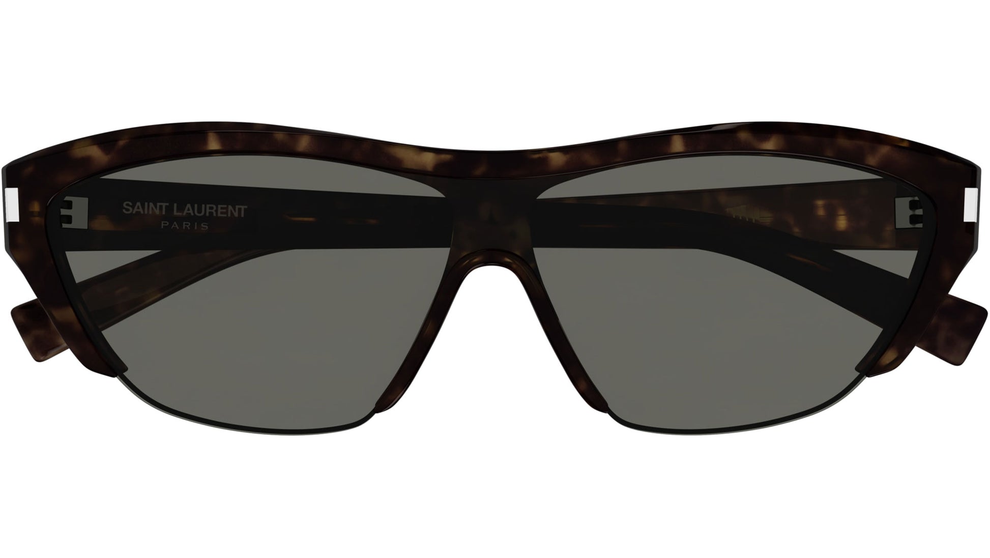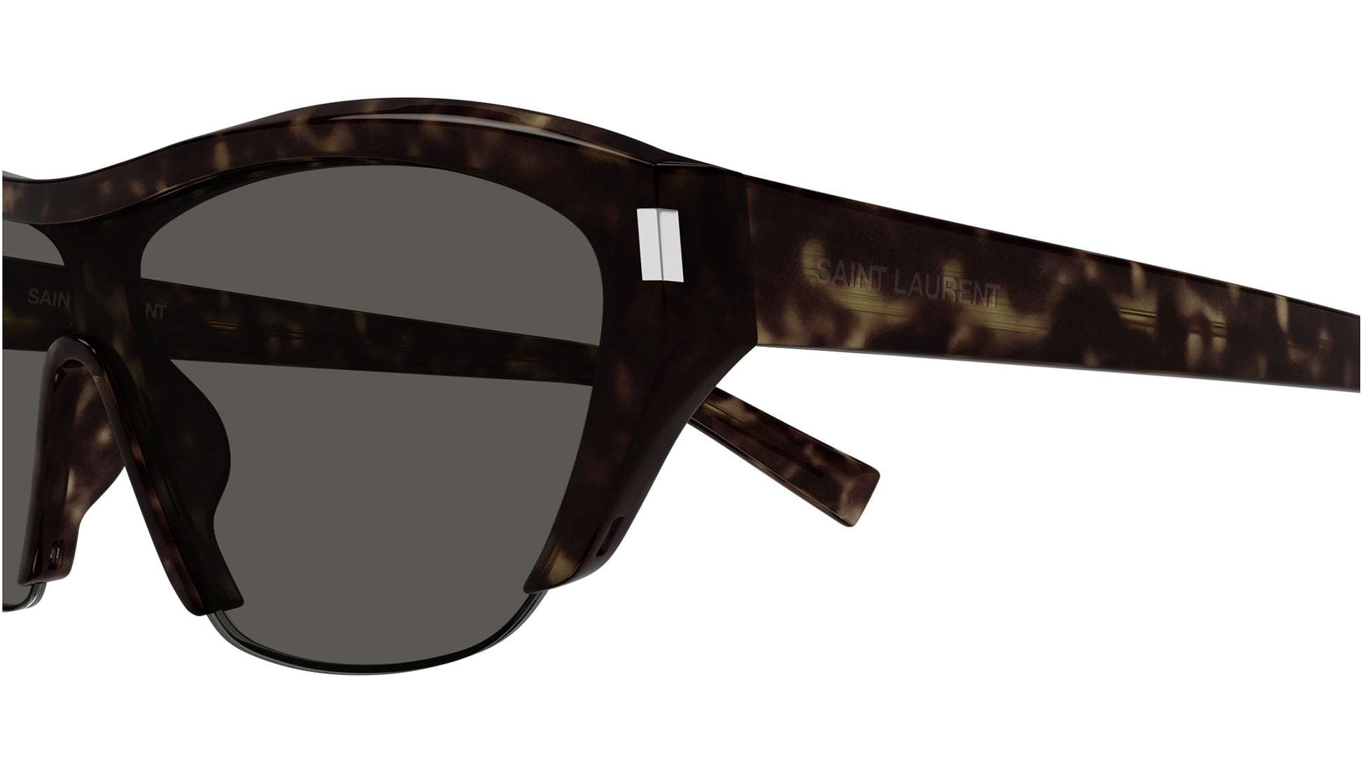 Saint Laurent SL 704 002 sunglasses for women, featuring shiny dark havana shield recycled acetate frame and solid grey mask bio nylon lenses. Brand line: Corner Angle. Style code: SL 704. Color code: 002. Made in Italy. Authorized Saint Laurent online reseller. Your glasses will include the original case and accessories and are covered by a 12-month global warranty.
