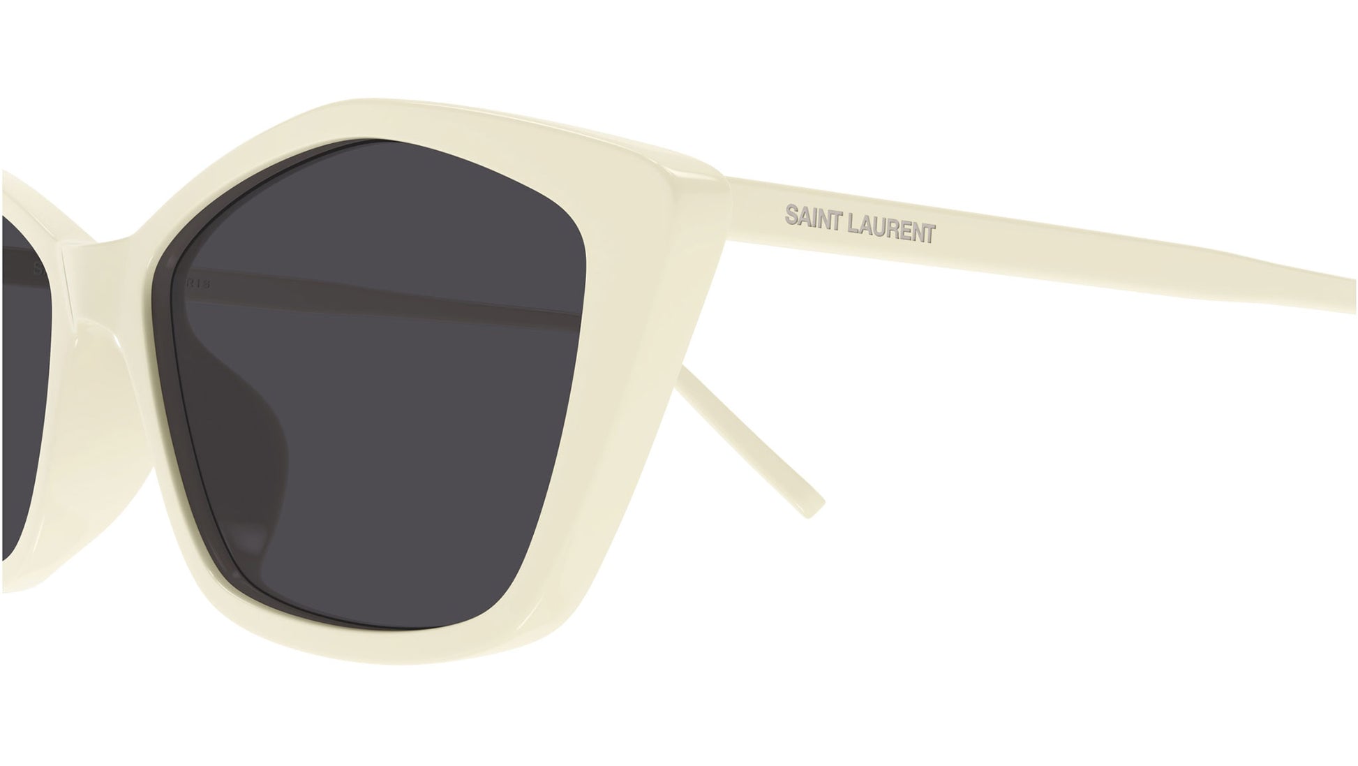 Saint Laurent SL 775 005 sunglasses for women, featuring shiny solid ivory cat eye recycled acetate frame and solid black + AR black hole on front bio nylon lenses. Brand line: SL Logo. Style code: SL 775. Color code: 005. Made in Italy. Authorized Saint Laurent online reseller. Your glasses will include the original case and accessories and are covered by a 12-month global warranty.