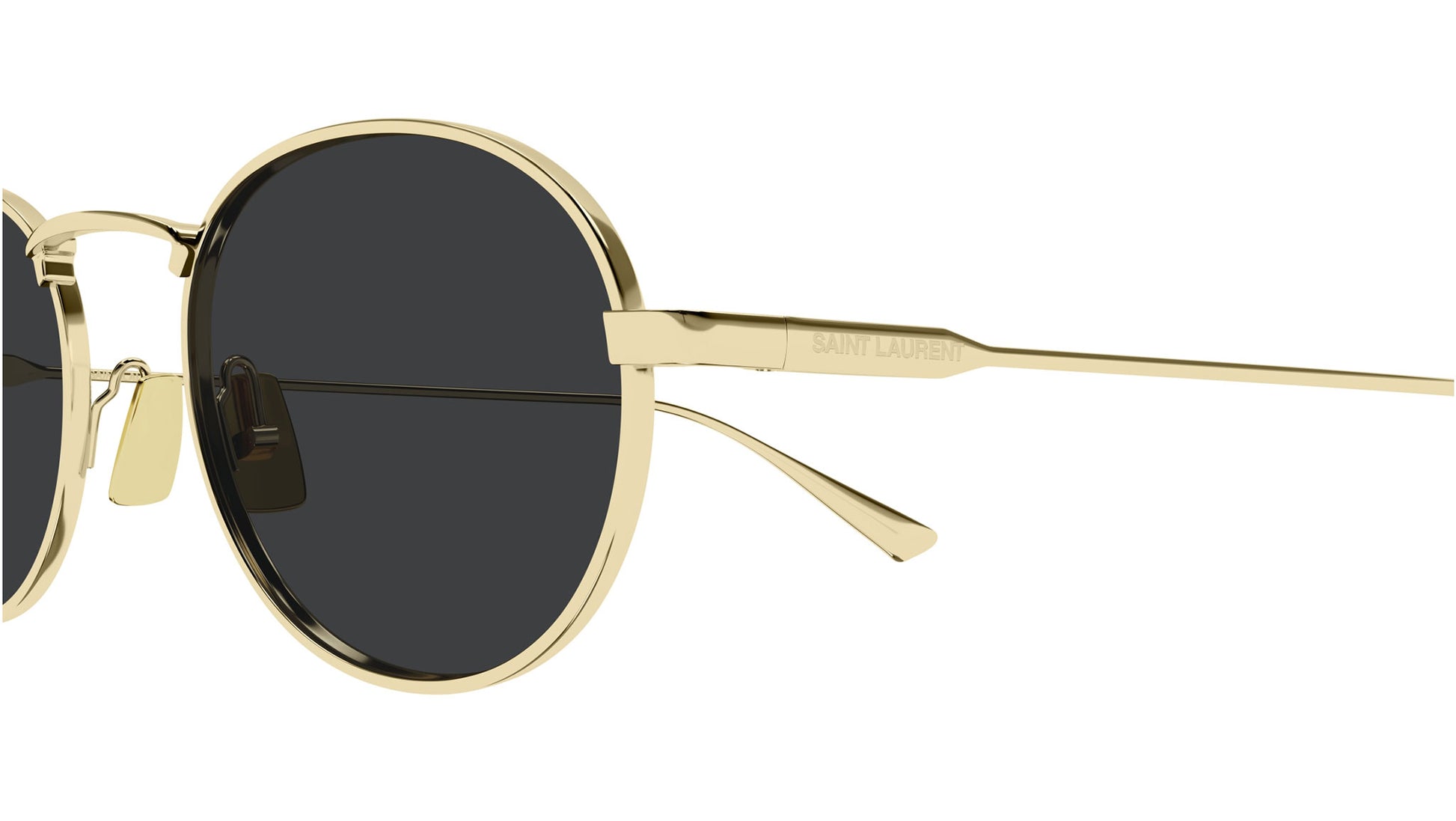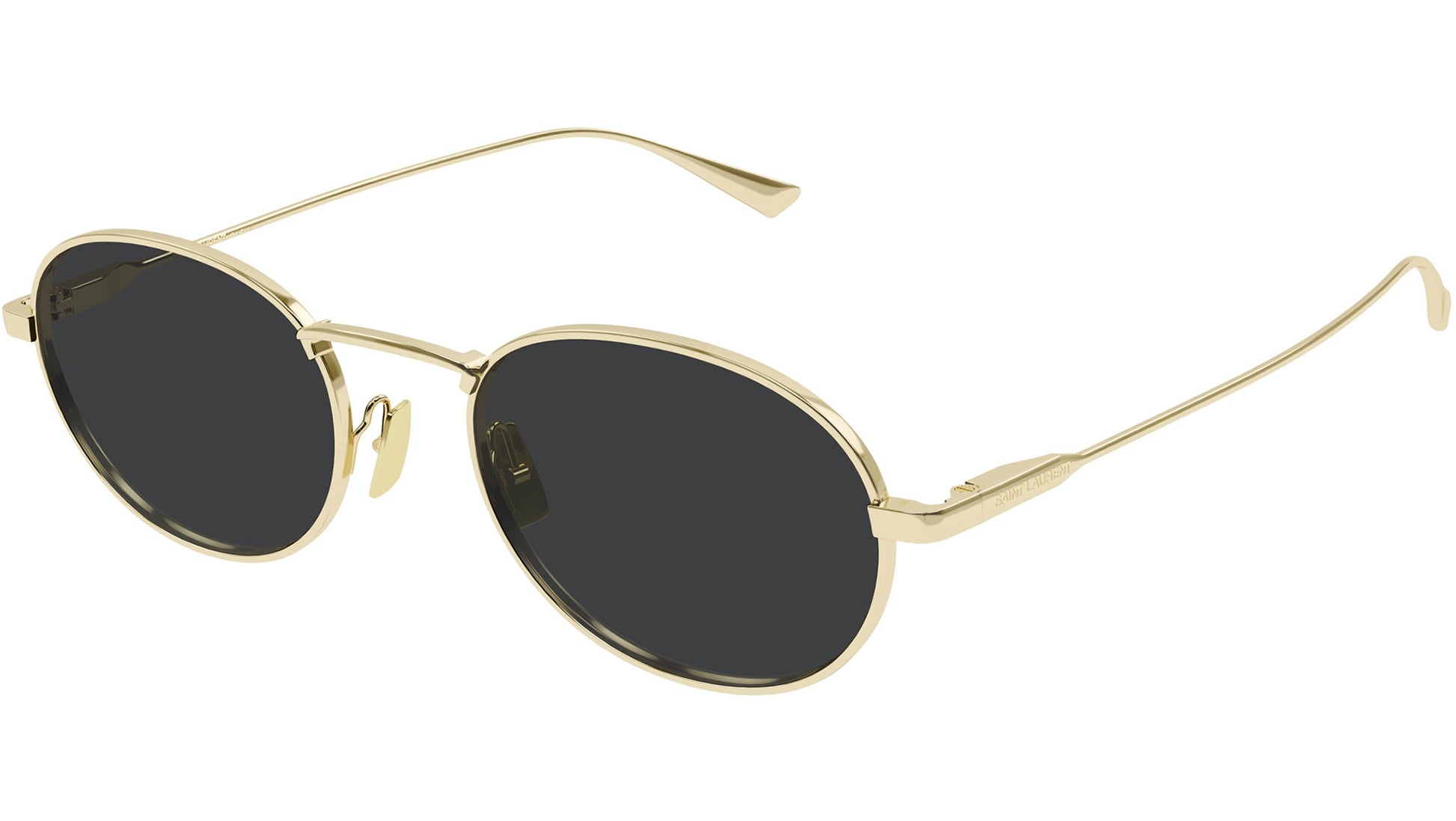 Saint Laurent SL 799 003 sunglasses for men, featuring shiny light gold oval metal frame and solid black bio nylon lenses. Brand line: SL Logo. Style code: SL 799. Color code: 003. Made in Italy. Authorized Saint Laurent online reseller. Your glasses will include the original case and accessories and are covered by a 12-month global warranty.