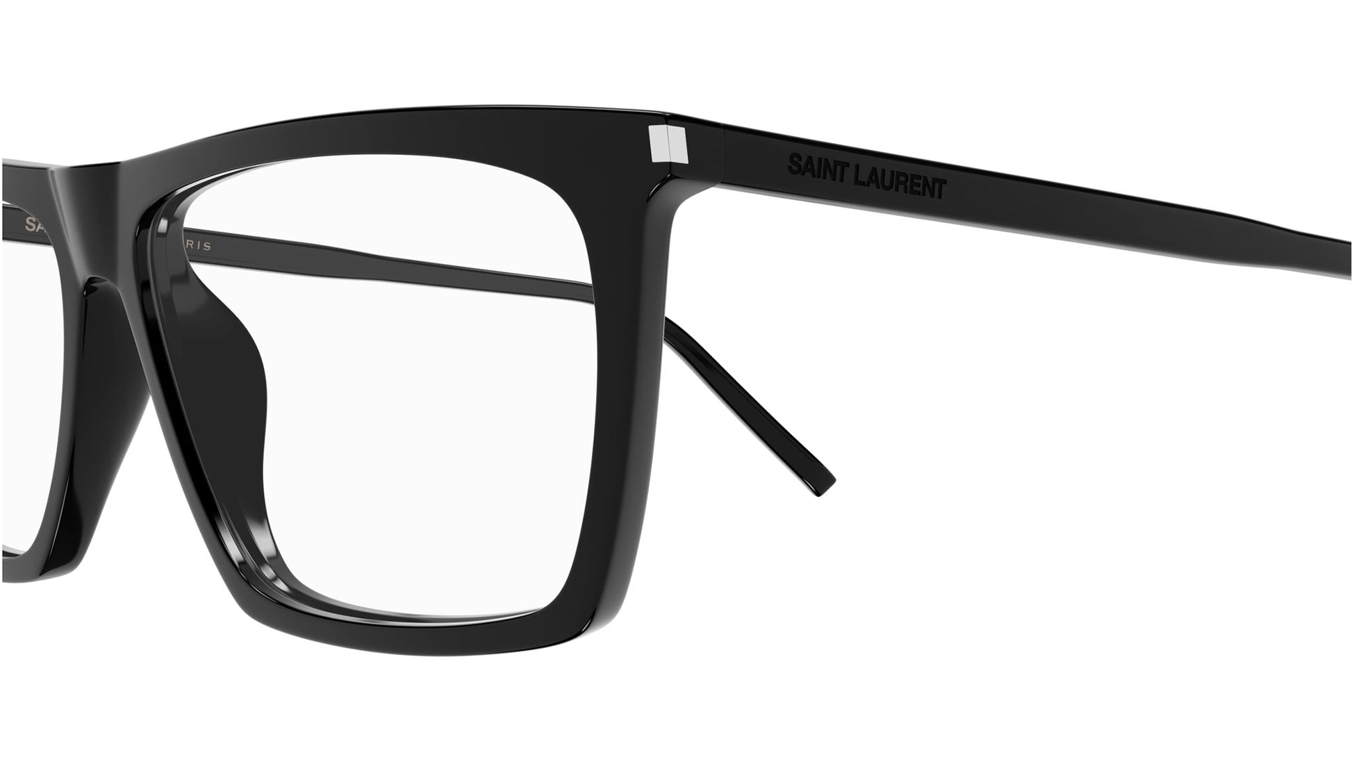Saint Laurent SL 803 glasses for men, featuring shiny solid black rectangular recycled acetate frame and demo lenses. Brand line: Corner Angle. Style code: SL 803. Color code: size 59: 005. Size 57: 002. Made in Italy. Authorized Saint Laurent online reseller. Your glasses will include the original case and accessories and are covered by a 12-month global warranty.