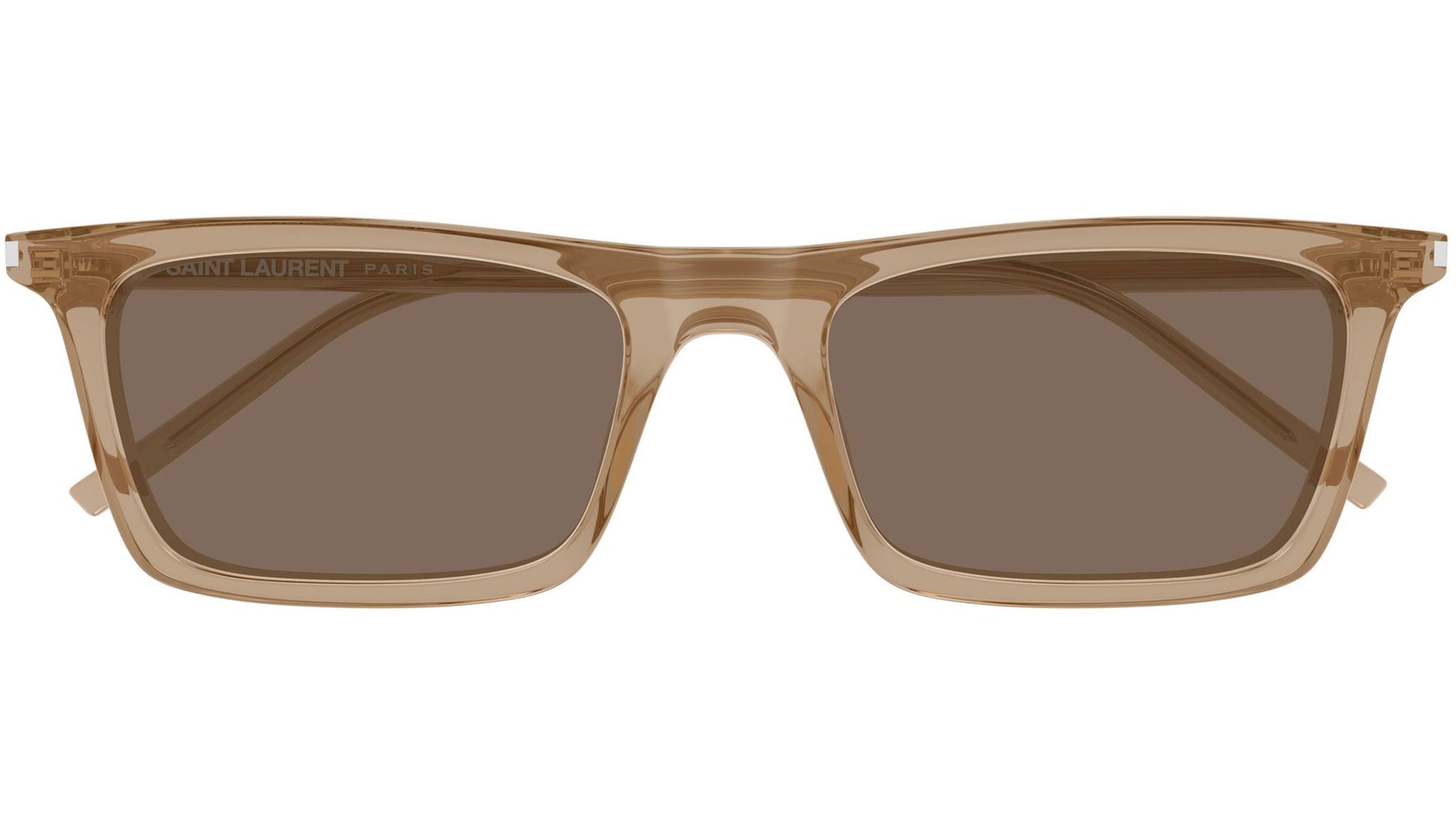 Saint Laurent SL 890 BETTY THIN 005 sunglasses for men and woman, featuring shiny transparent brown rectangular recycled acetate frame and solid light brown bio nylon lenses. Brand line: Corner Angle. Style code: SL 890 BETTY THIN. Color code: 005. Made in Italy. Authorized Saint Laurent online reseller. Your glasses will include the original case and accessories and are covered by a 12-month global warranty.
