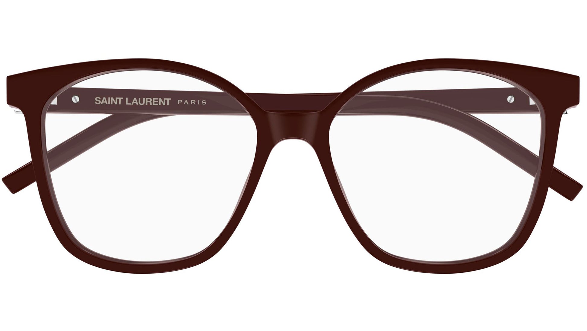 Saint Laurent SL M162 006 glasses for women, featuring shiny solid burgundy oval recycled acetate frame and demo lenses. Brand line: Monogram. Style code: SL M162. Color code: 006. Made in Italy. Authorized Saint Laurent online reseller. Your glasses will include the original case and accessories and are covered by a 12-month global warranty.