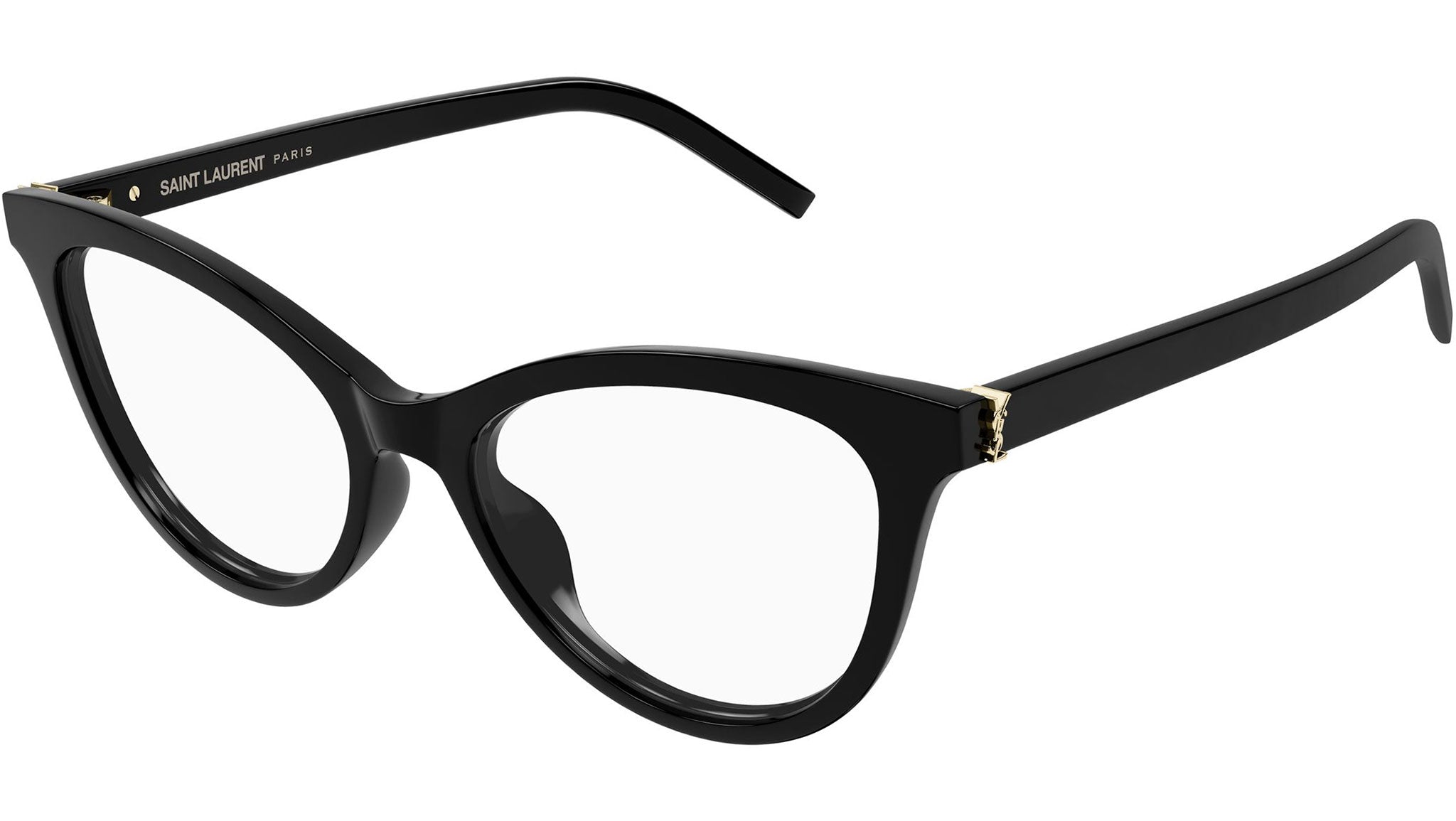 Saint Laurent SL M164 glasses for women, featuring shiny solid black cat eye recycled acetate frame and demo lenses. Brand line: Monogram. Style code: SL M164. Color code: size 53: 007. Size 51: 002. Made in Italy. Authorized Saint Laurent online reseller. Your glasses will include the original case and accessories and are covered by a 12-month global warranty.