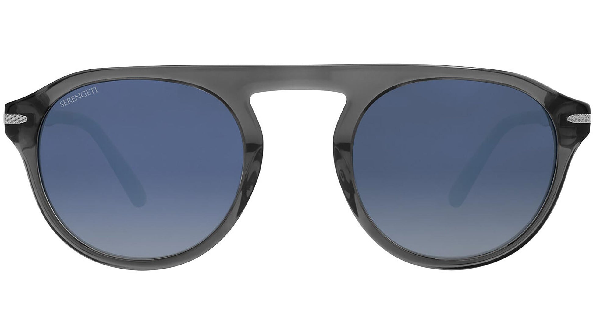 Serengeti Arthur sunglasses featuring shiny translucent grey panthos bio acetate frame and smoke grey lenses. The L'Arthur model presents a distinctive retro aesthetic that stands out with its iconic style. This eyewear features a unique design that combines familiarity with contemporary elements. Constructed from high-quality bio-acetate, the L'Arthur ensures durability and longevity while retaining its charm. It is equipped with mineral polarized smoke lenses, categorized between 2 and 3, and a base curve of 6. The frame is designed to fit medium-sized faces and is manufactured in Italy, offering a blend of quality and sophistication. Style code: SS744. Color code: 004. Authorized Serengeti online reseller. Your glasses will include the original case and accessories and are covered by a 12-month global warranty.