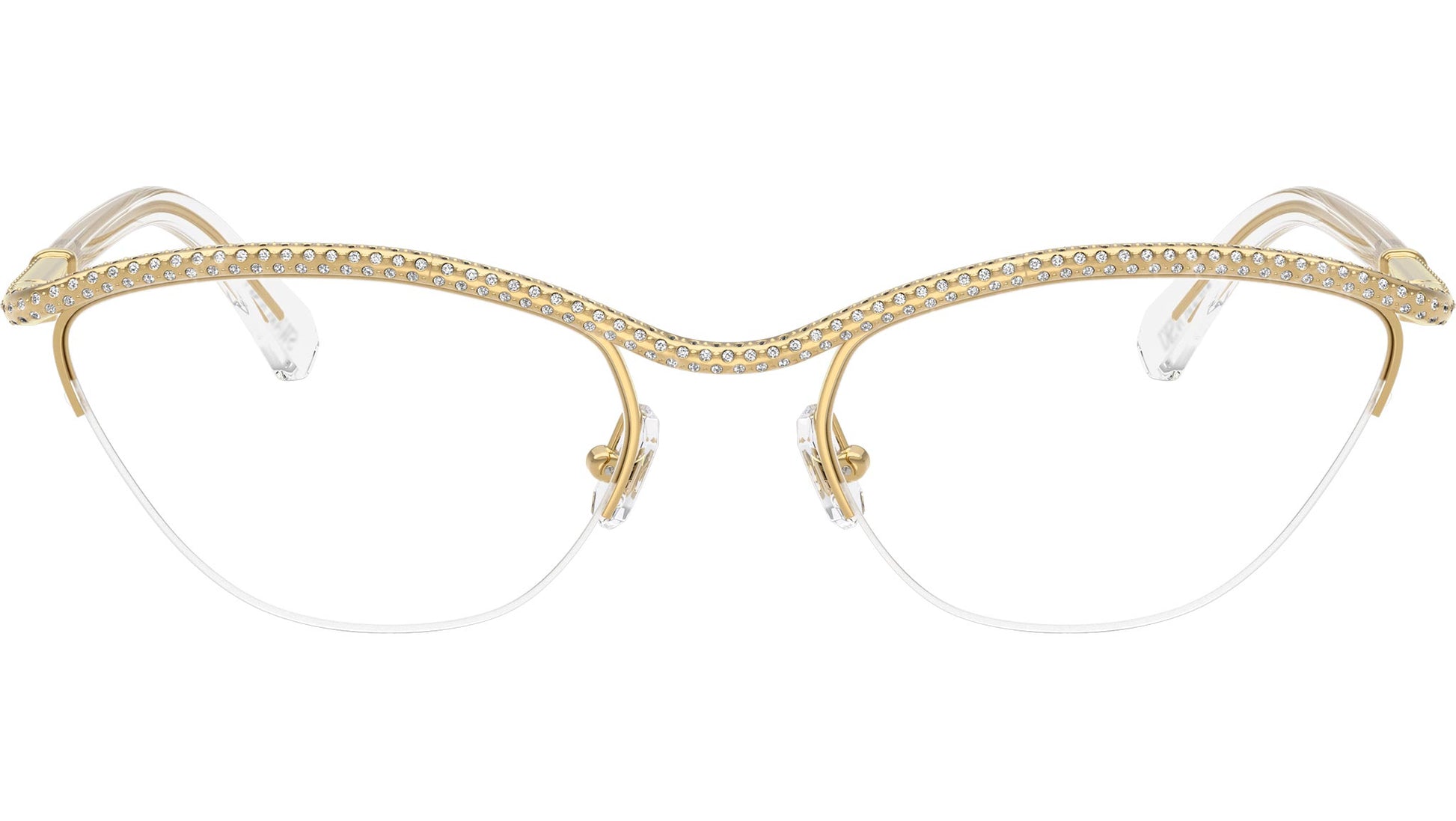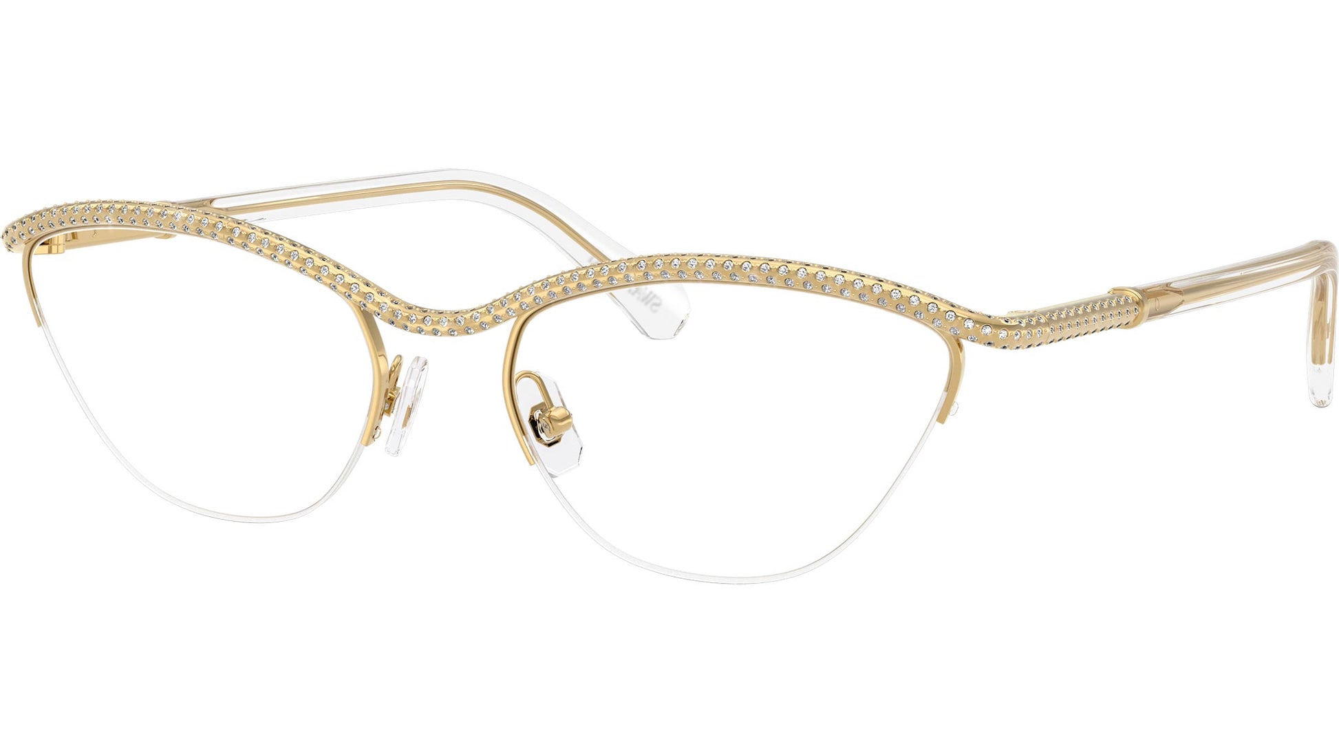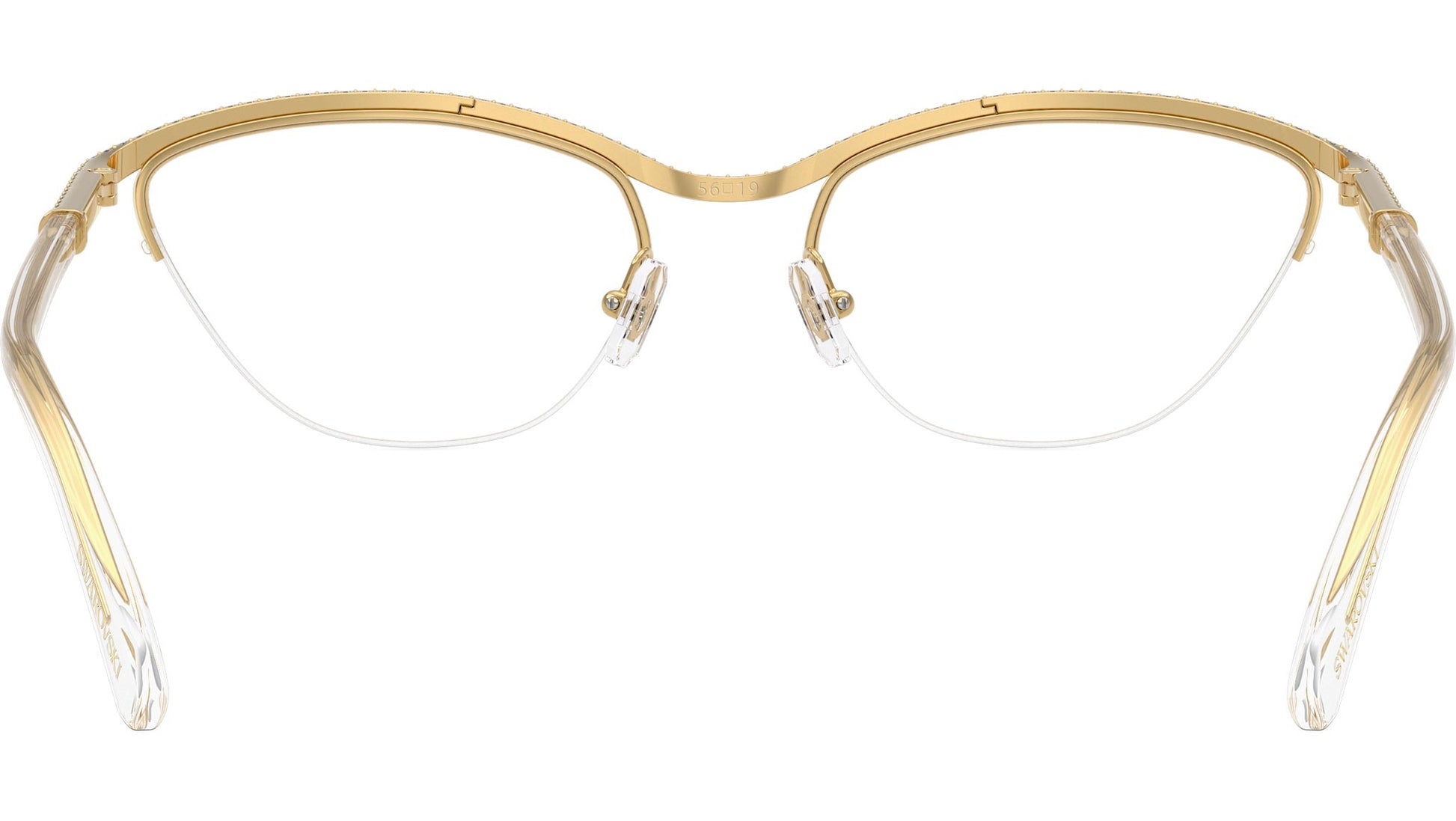 Swarovski SK1026 4004 glasses for women, featuring gold oval metal frame and demo lenses. Adjustable nosepads. Brand line: Science of Facets. Style code: SK1026. Color code: 4004. Authorized Swarovski online reseller. Your glasses will include the original case and accessories and are covered by a 12-month global warranty.