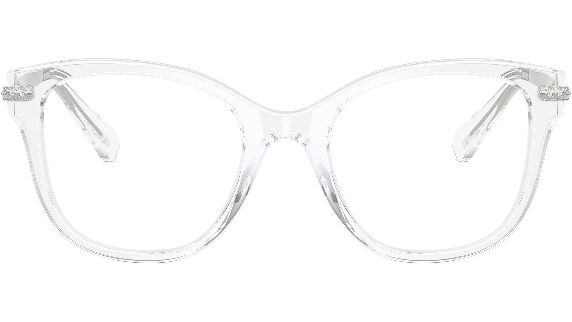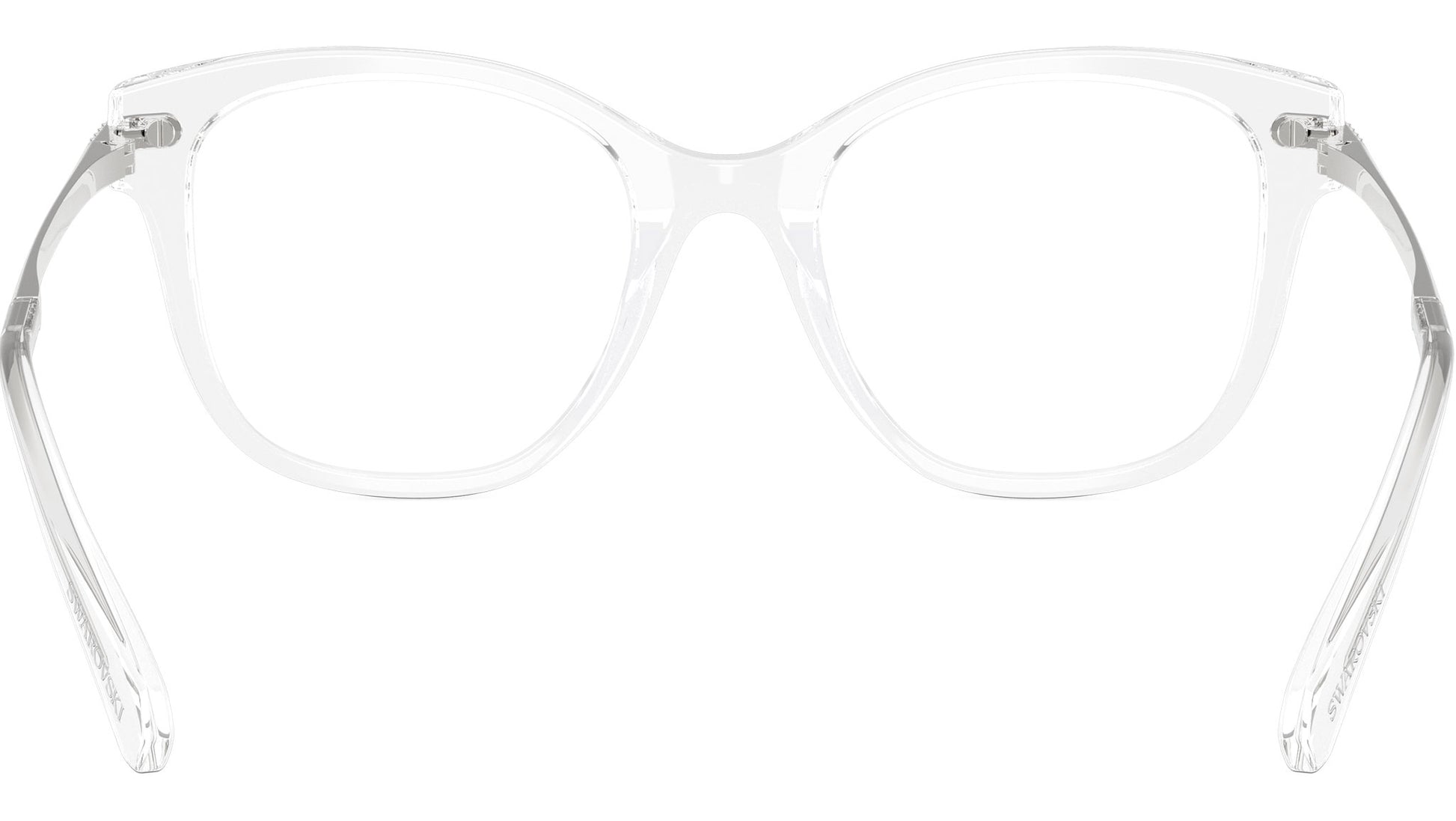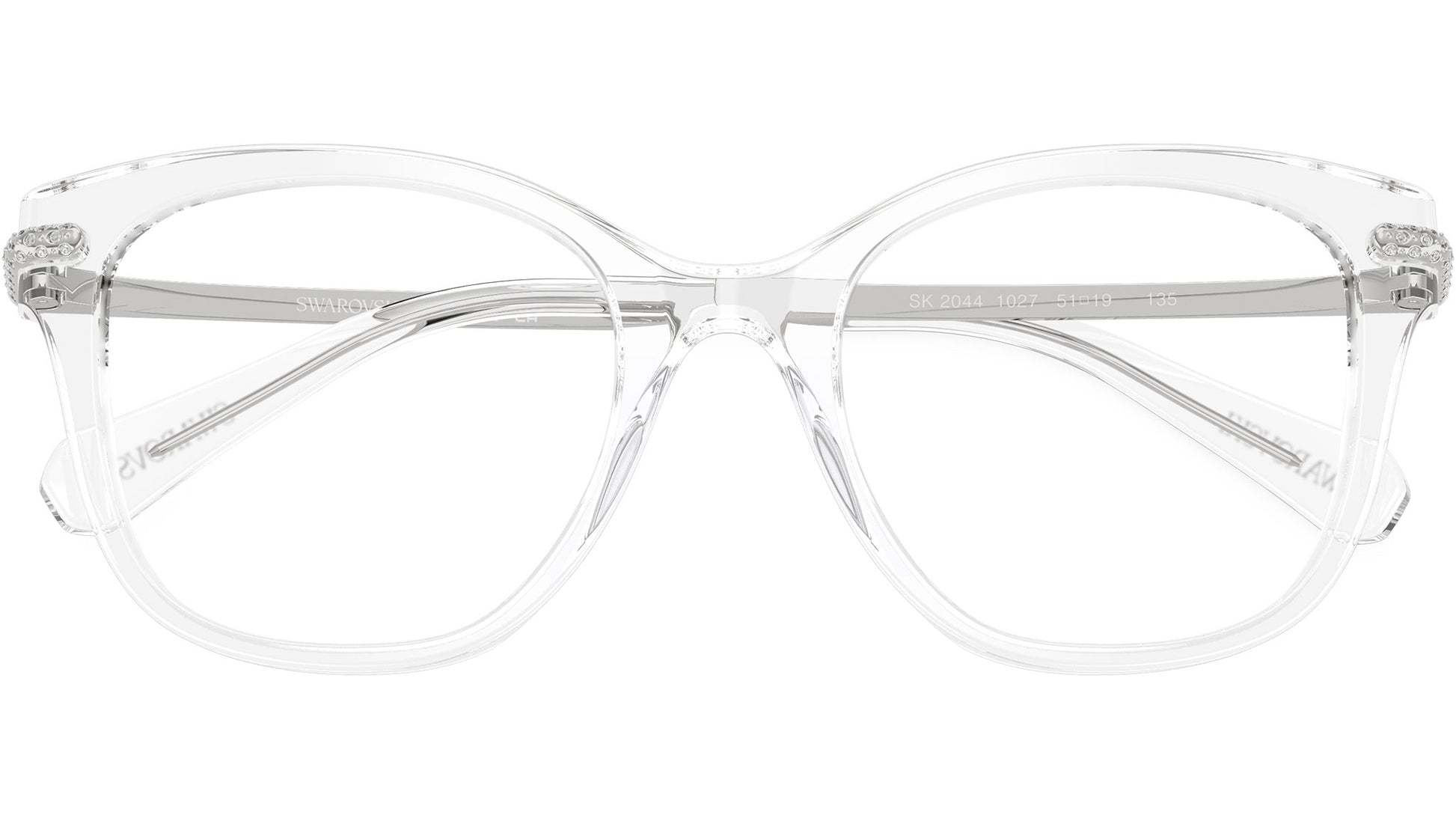 Swarovski SK2044 1027 glasses for women, featuring transparent squared acetate frame and demo lenses. High bridge fit. Brand line: Science of Facets. Style code: SK2044. Color code: 1027. Authorized Swarovski online reseller. Your glasses will include the original case and accessories and are covered by a 12-month global warranty.