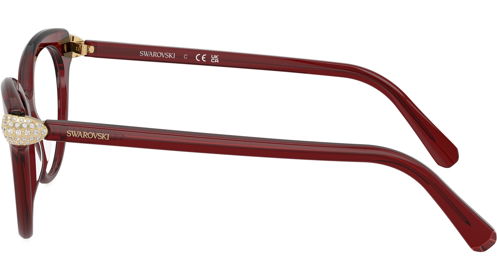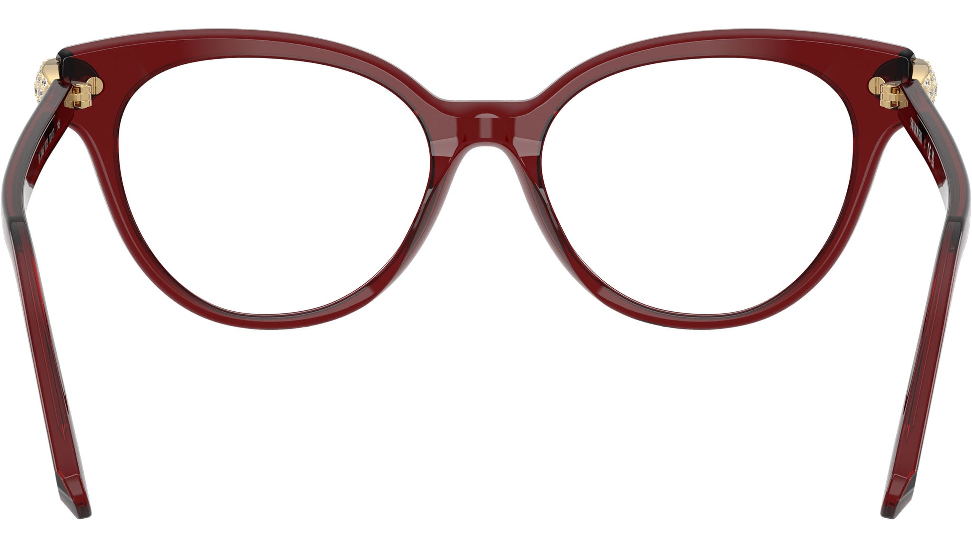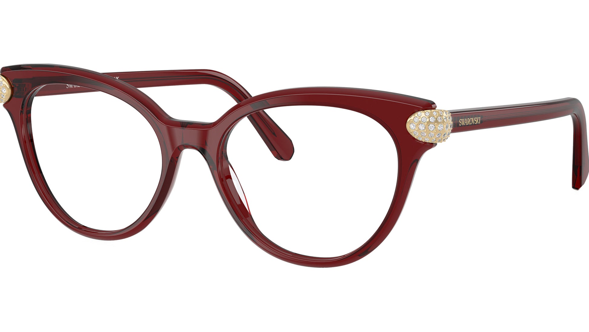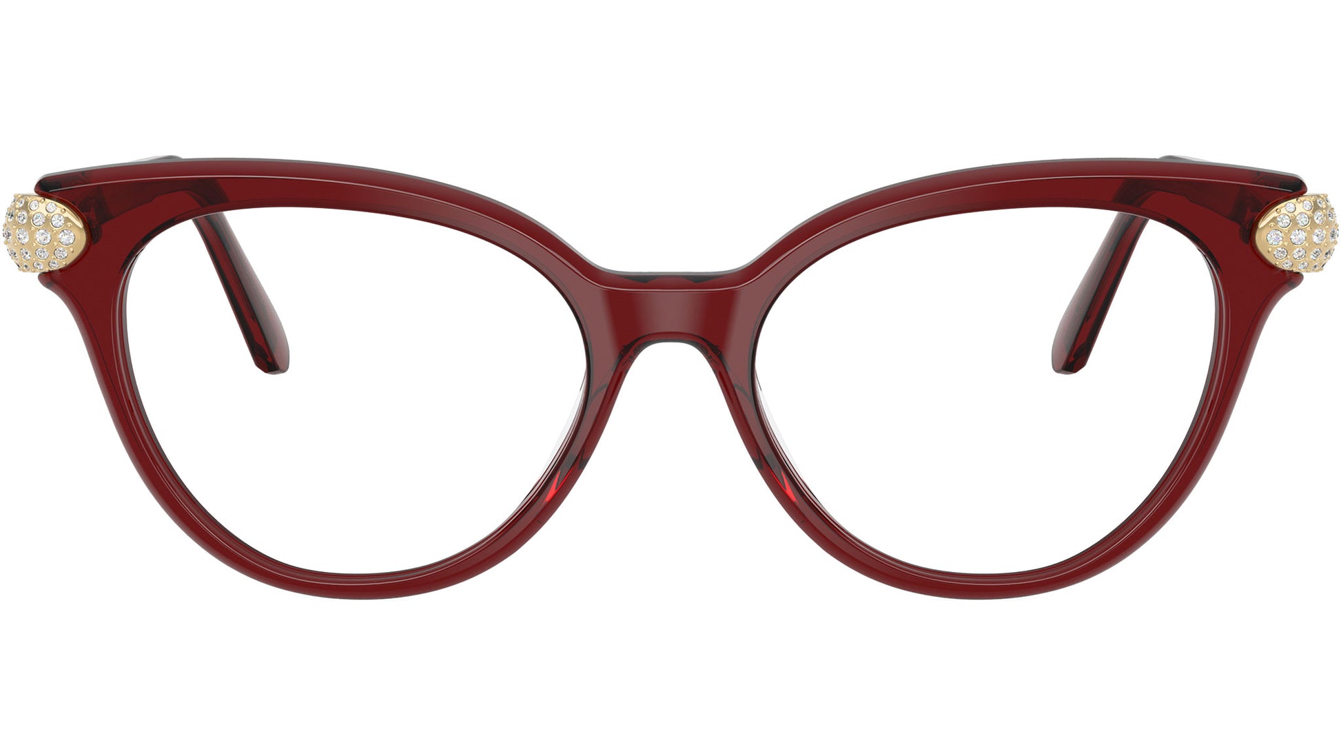 Swarovski SK2046 1073 glasses for women, featuring transparent burgundy gunmetal panthos acetate frame and demo lenses. High bridge fit. Brand line: Science of Facets. Style code: SK2046. Color code: 1073. Authorized Swarovski online reseller. Your glasses will include the original case and accessories and are covered by a 12-month global warranty.