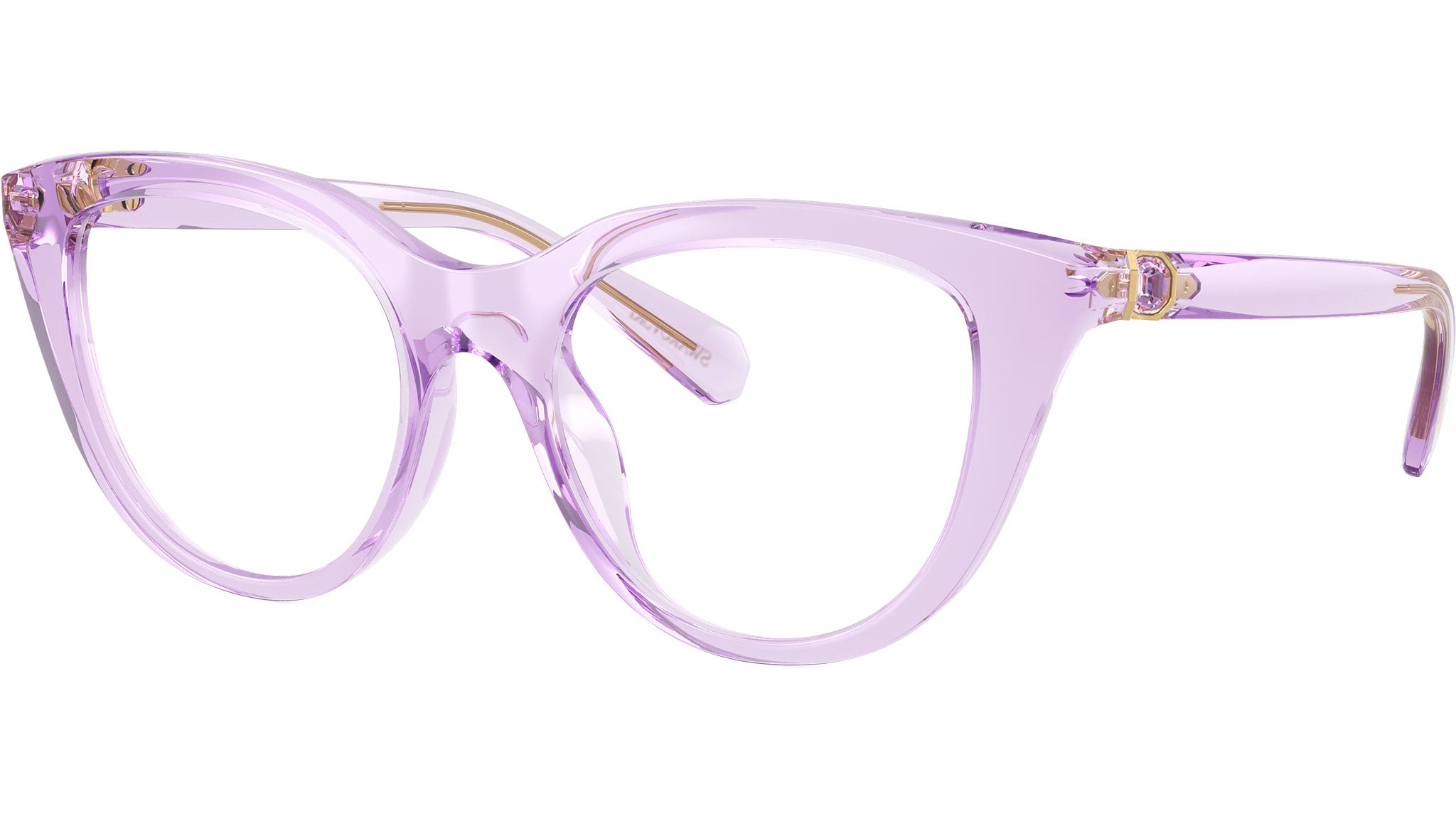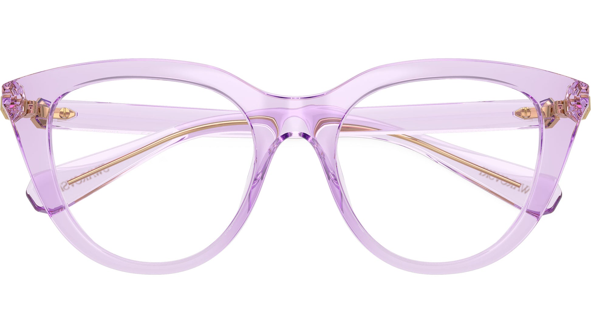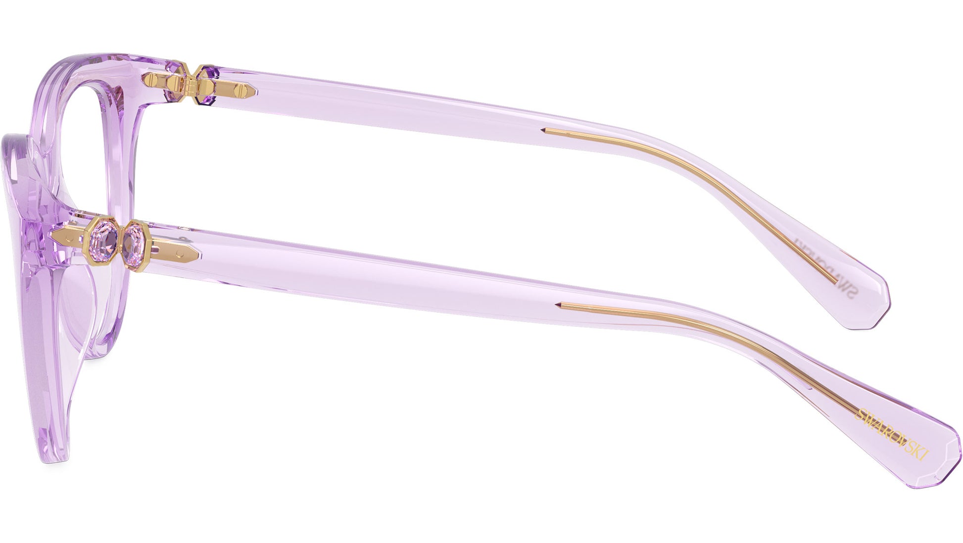 Swarovski SK2052 1079 glasses for women, featuring transparent lilac cat eye injection frame and demo lenses. High bridge fit. Brand line: Science of Facets. Style code: SK2052. Color code: 1079. Authorized Swarovski online reseller. Your glasses will include the original case and accessories and are covered by a 12-month global warranty.