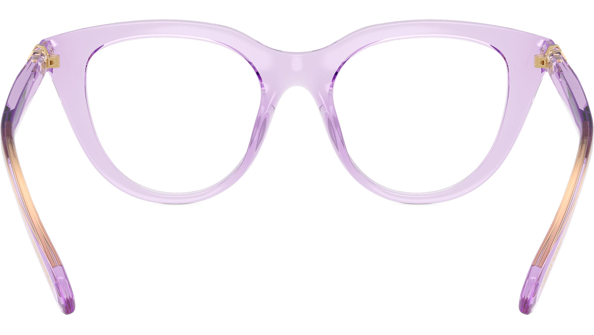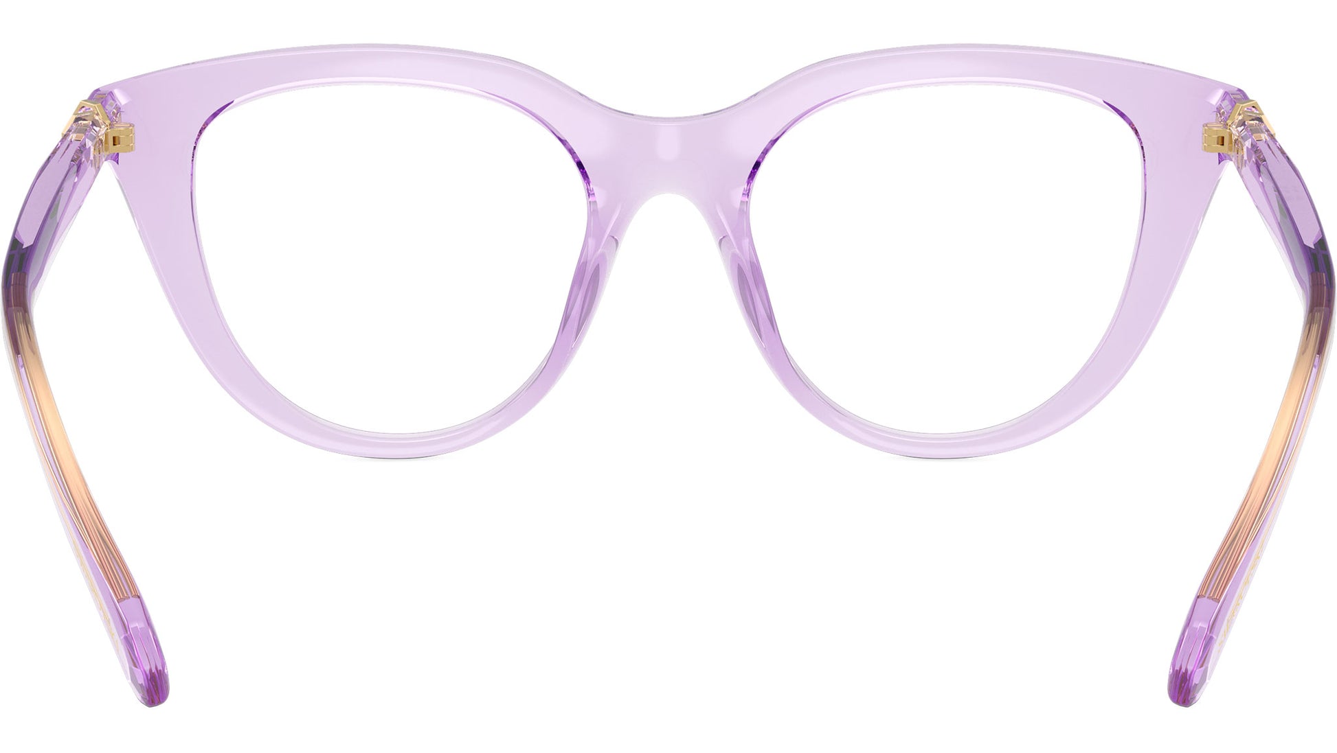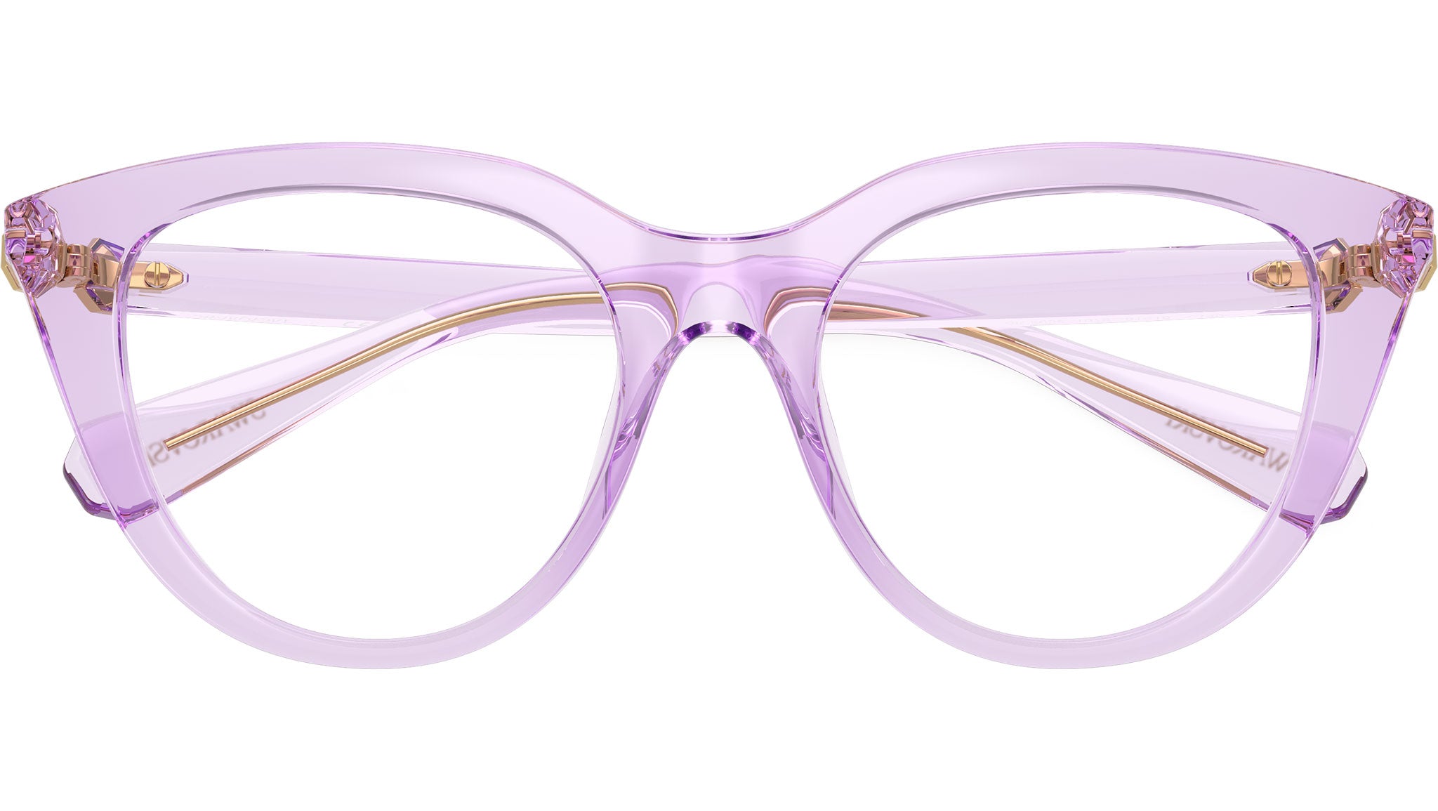 Swarovski SK2052 1079 glasses for women, featuring transparent lilac cat eye injection frame and demo lenses. High bridge fit. Brand line: Science of Facets. Style code: SK2052. Color code: 1079. Authorized Swarovski online reseller. Your glasses will include the original case and accessories and are covered by a 12-month global warranty.