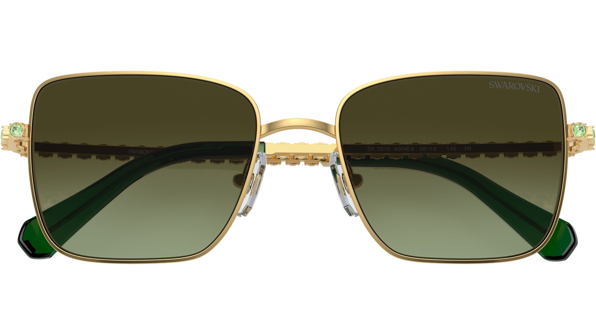 Swarovski sunglasses for women model 7015 featuring gold full rim metal frame and base 4 green gradient brown lenses. Adjustable nosepads. Frame line: Science of Elegance. Brand code: 0SK7015. Color code: 4004E8. Authorised Swarovski Eyewear Online Reseller. Your glasses will come including the original case and accessories and will be covered by 12 month global warranty.