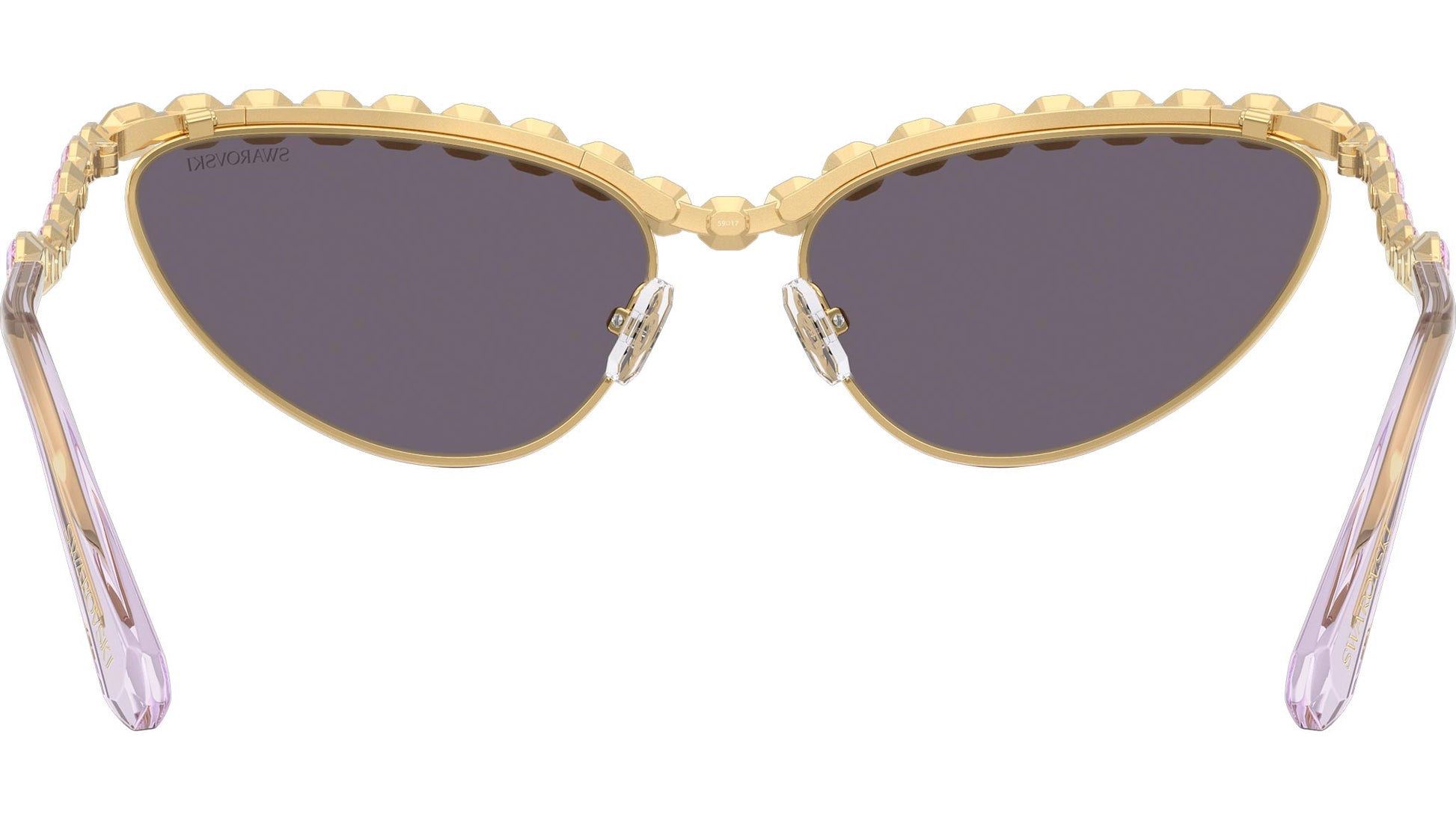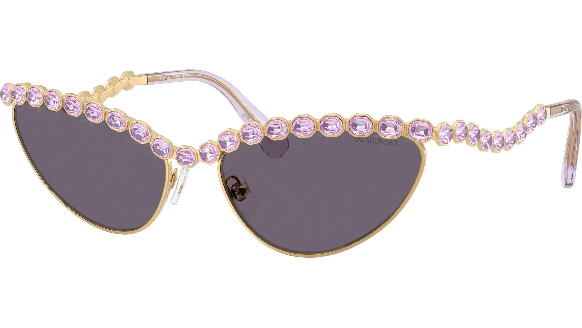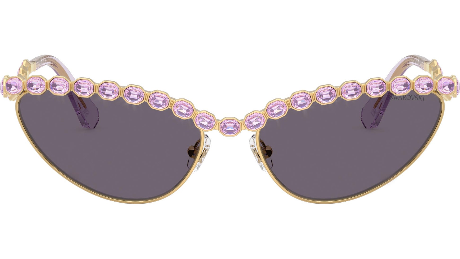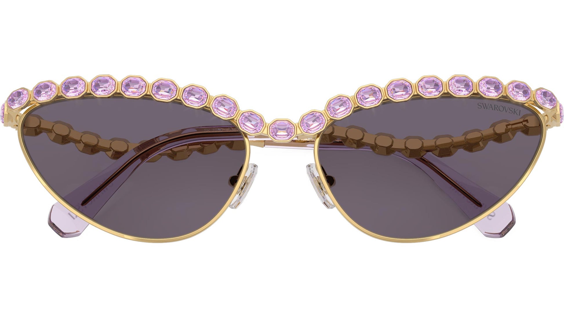 Swarovski SK7030 40361A sunglasses for women, featuring gold cat eye metal frame and violet polyamide lenses. Adjustable nosepads. Brand line: Science of Facets. Style code: SK7030. Color code: 40361A. Authorized Swarovski online reseller. Your glasses will include the original case and accessories and are covered by a 12-month global warranty.