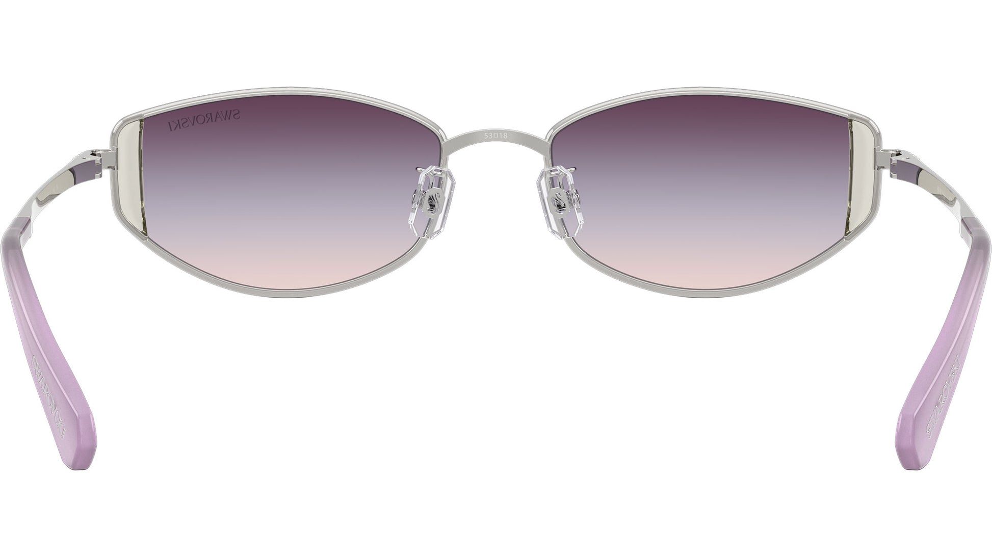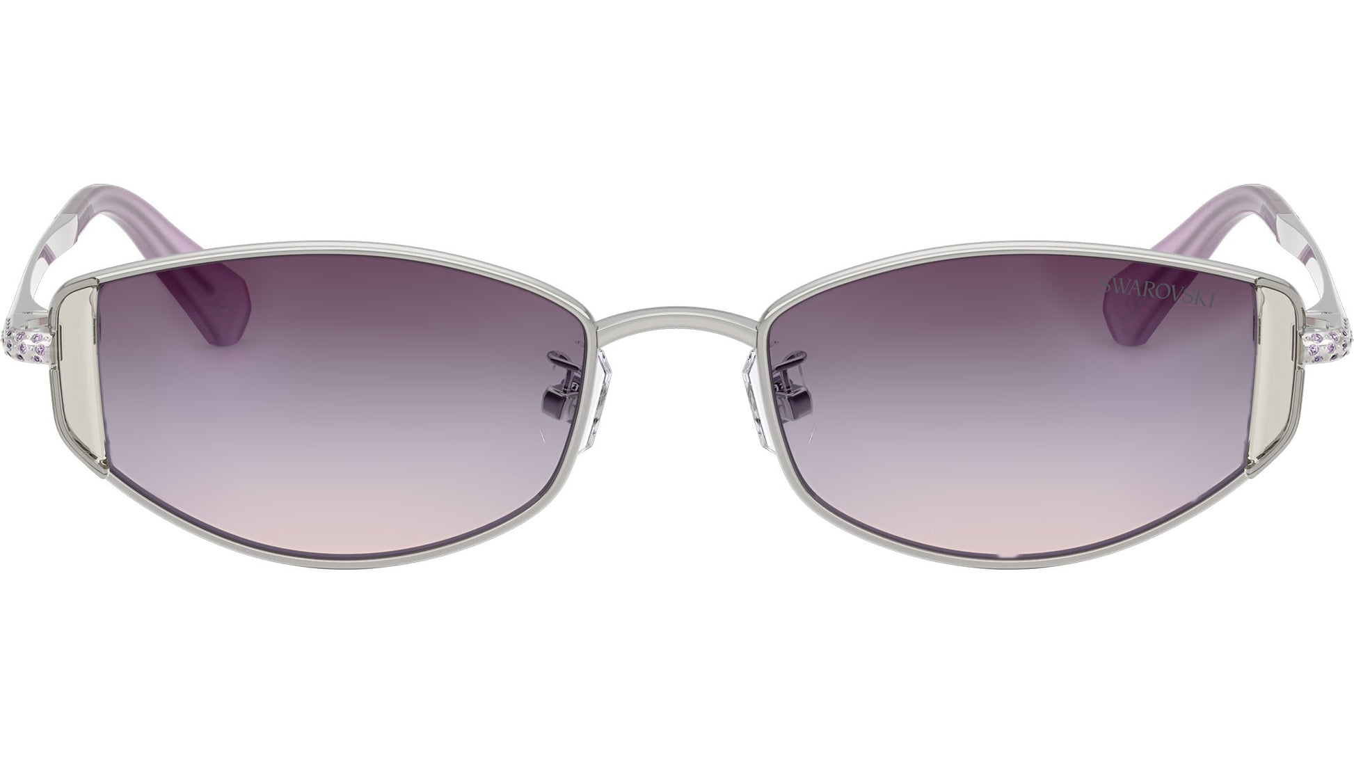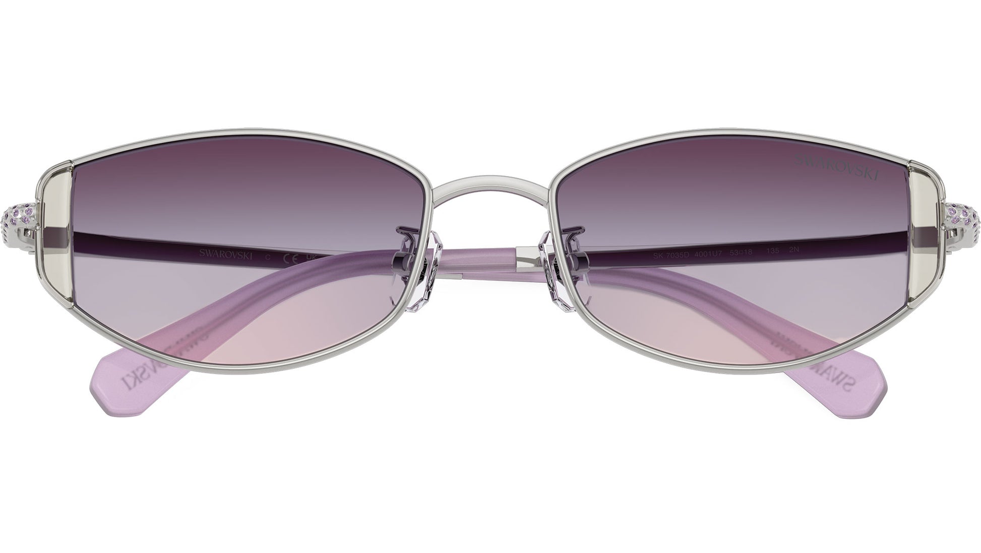 Swarovski SK7035D 4001U7 sunglasses for women, featuring silver oval metal frame and gradient purple polyamide lenses. Low bridge fit. Brand line: Science of Facets. Style code: SK7035D. Color code: 4001U7. Authorized Swarovski online reseller. Your glasses will include the original case and accessories and are covered by a 12-month global warranty.