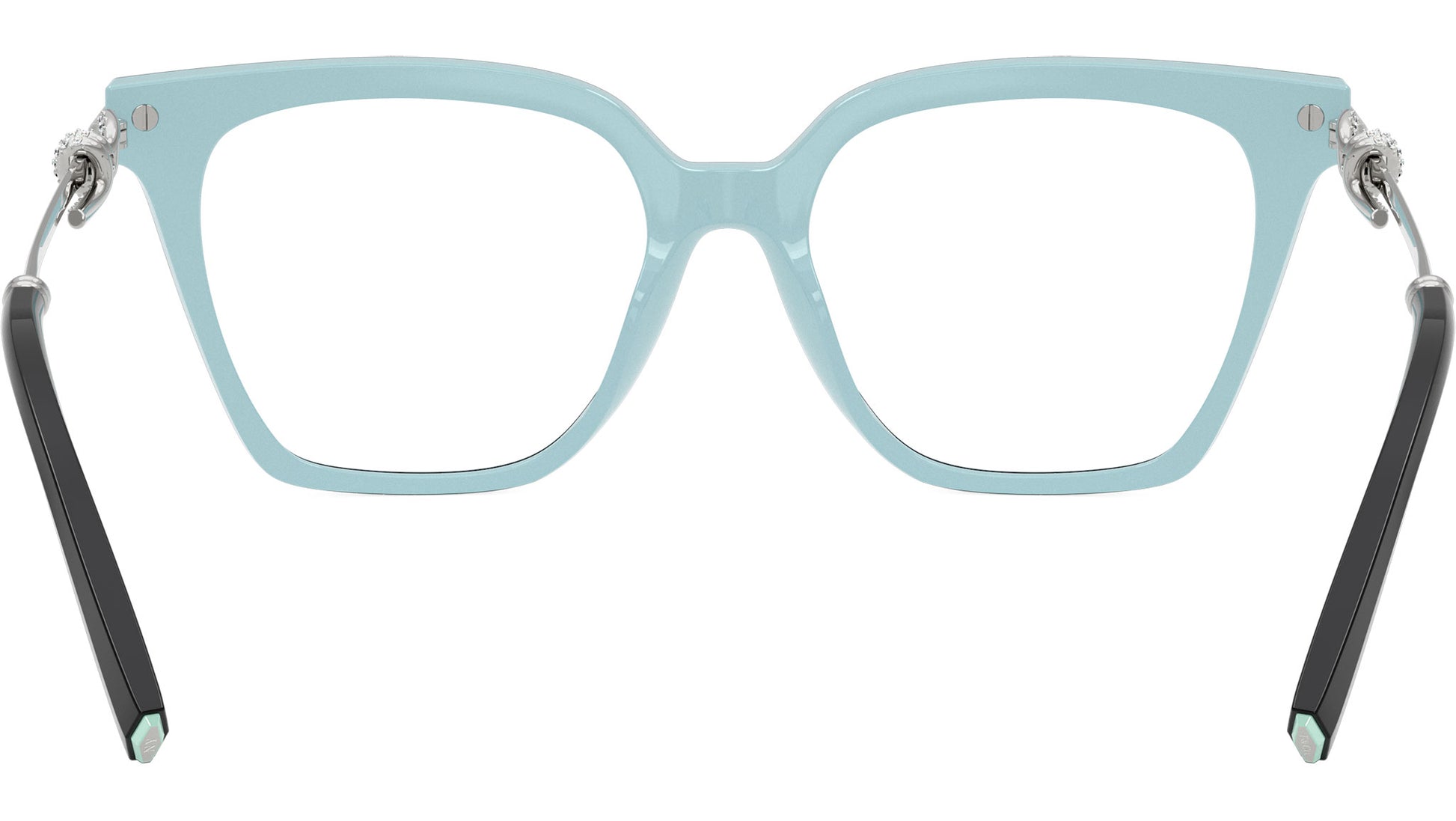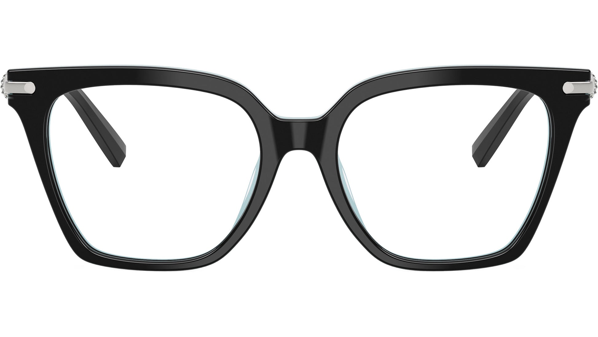 Tiffany glasses for women model TF2284B 8055 featuring black on Tiffany blue acetate frame and base 4 demo lens. High bridge fit. Frame line: Icons. Brand code: 0TF2284B. Color code: 8055. Authorised Tiffany Eyewear Online Reseller. Your glasses will come including the original case and accessories and will be covered by 12 month global warranty.