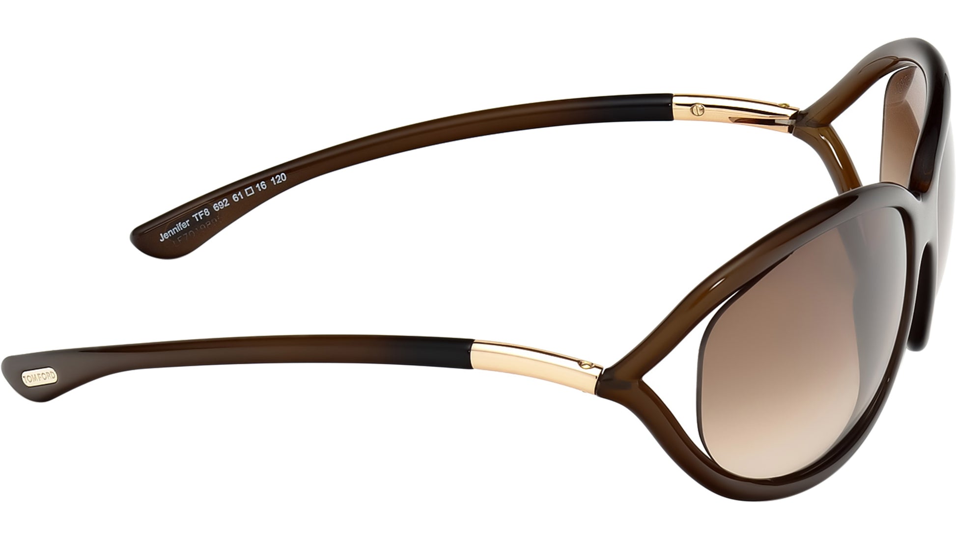 Tom Ford Jennifer sunglasses for women model FT0008 featuring shiny dark brown full-rim injection frame with brown gradient lenses. Brand code: 0008. Color code: 692. Authorised Tom Ford Online Reseller. Your glasses will include the original case and accessories and will be covered by a 12-month global warranty.