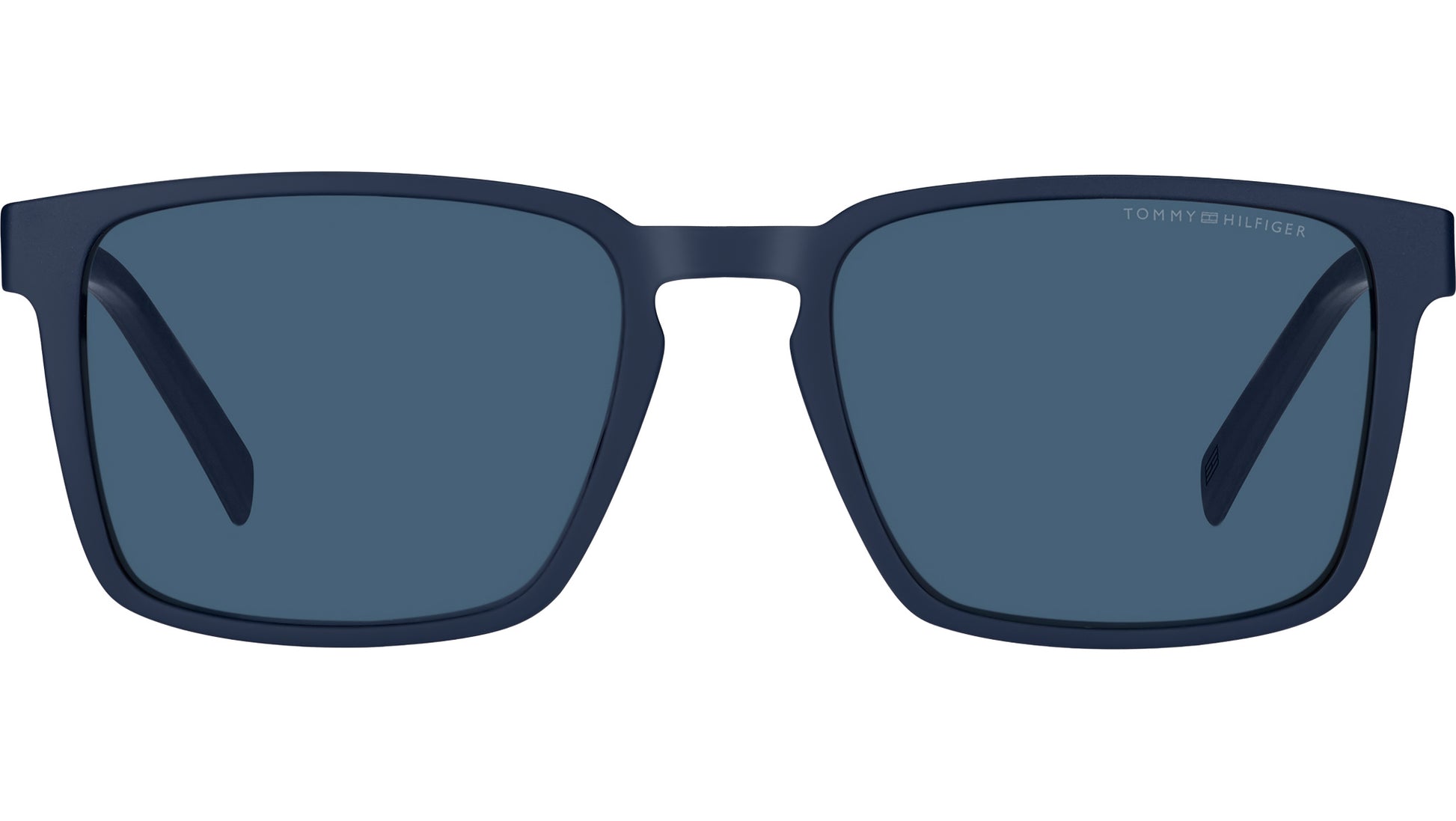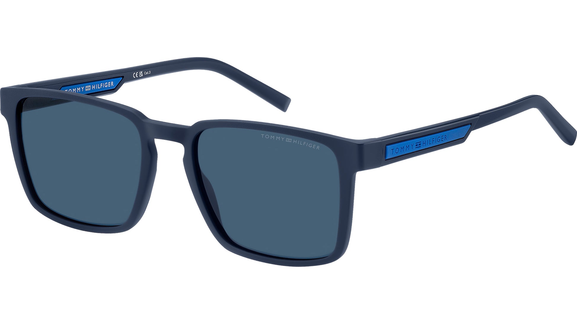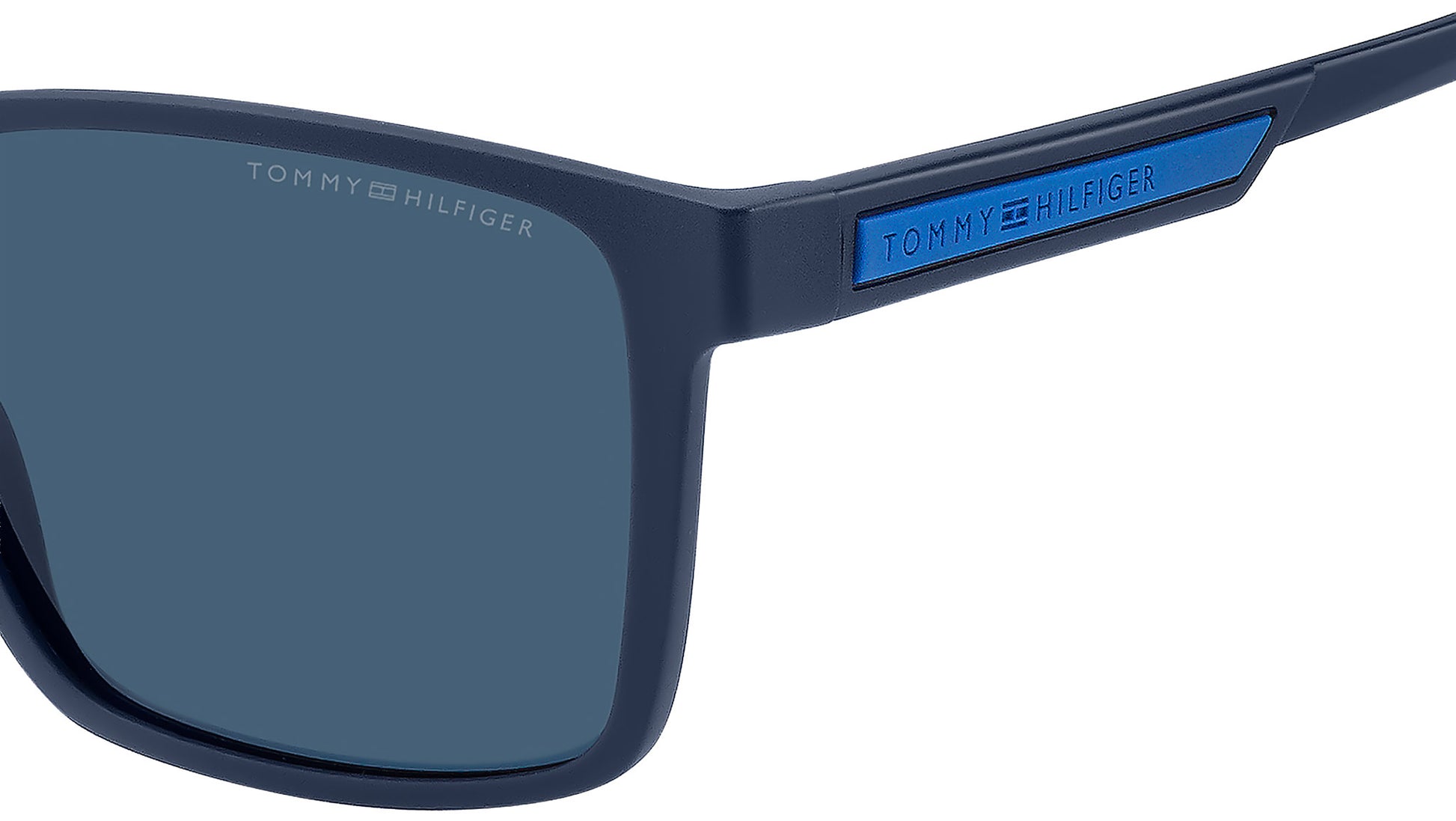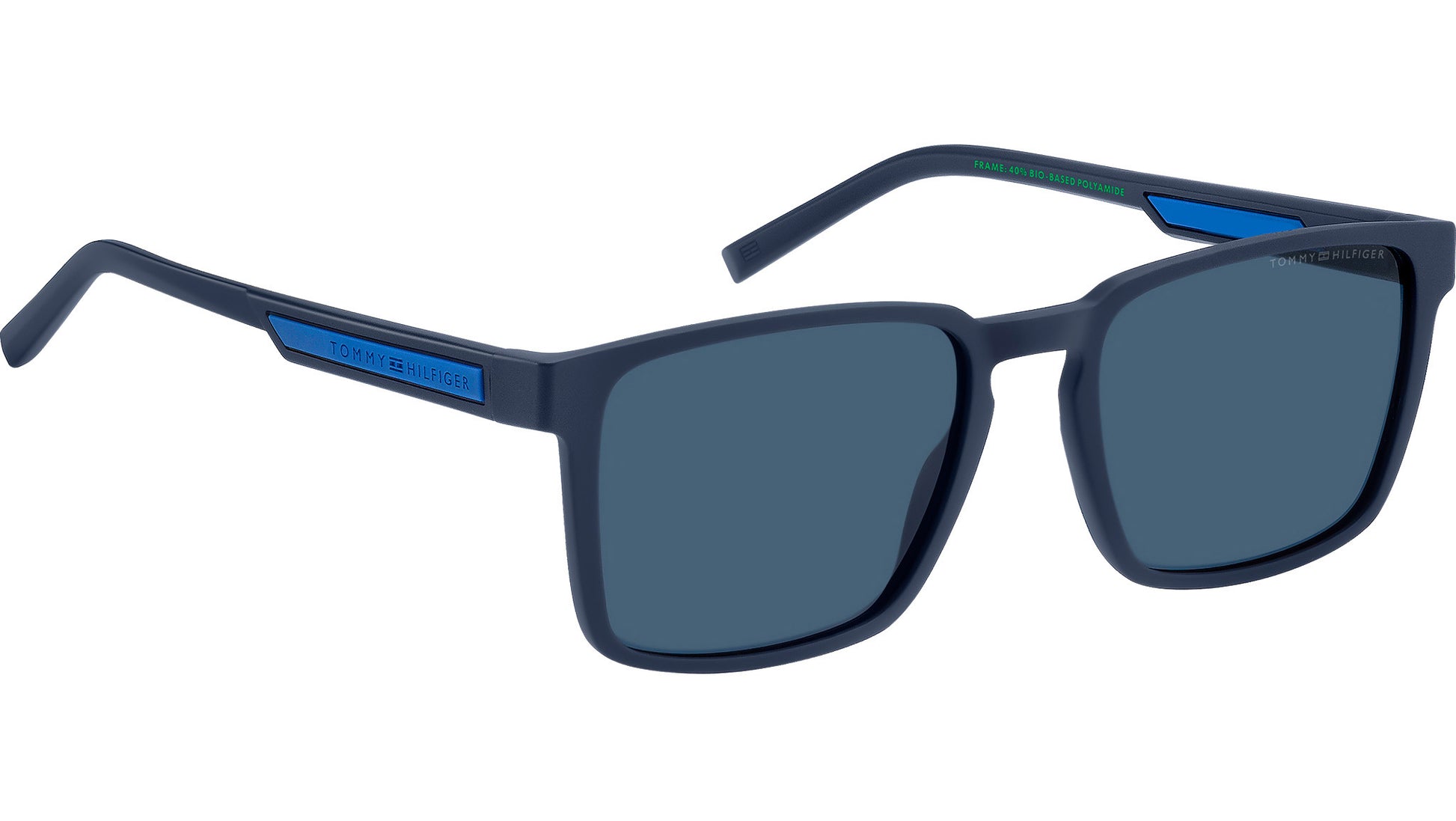 Tommy Hilfiger TH 2088/S FLL KU sunglasses featuring matte blue rectangular eco polyamide frame and blue lenses. These Tommy Hilfiger sunglasses have a sporty attitude and a more sustainable soul. But the defining element is found on the temples: the bio-based rubber insert in a contrast hue is an ode to the 2024 Olympic Games. The structure is in bio-based polyamide which is partially made from renewable resources, in particular castor oil seeds. Flexible hinges ensure a perfect fit and the clip-on polarized sun lenses attach to the frames quickly and easily. Available in versions with high-contrast lenses, for an undeniably sporty look. Brand line: Sporty. Style code: 206919. Color code: FLL KU. Authorized Tommy Hilfiger online reseller. Your glasses will include the original case and accessories and are covered by a 12-month global warranty.