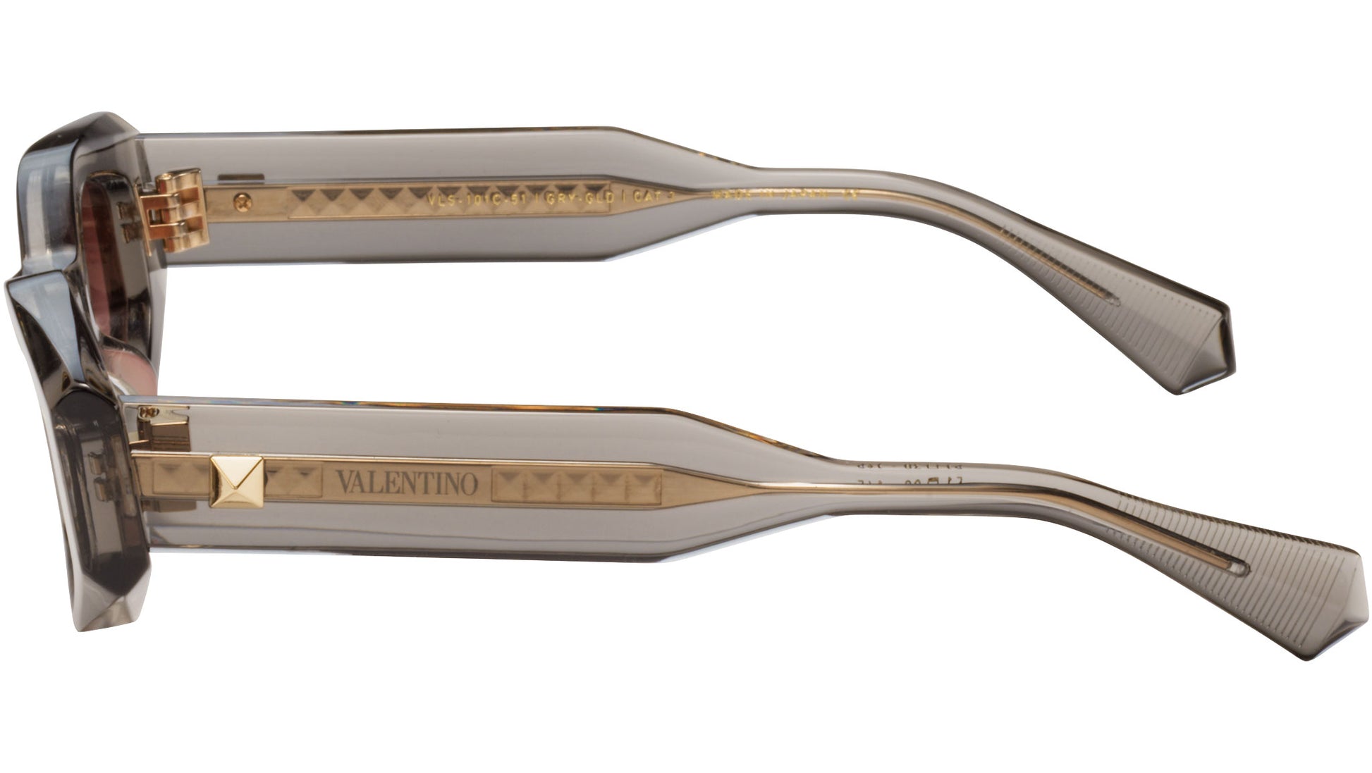 Deep temples with richly sculpted Rockstud-inspired temple tips are elegantly embellished with a single oversized tridimensional titanium Rockstud rivet and custom Valentino laser-branded wire cores for brand recognition and a uniquely alluring sense of urban style.