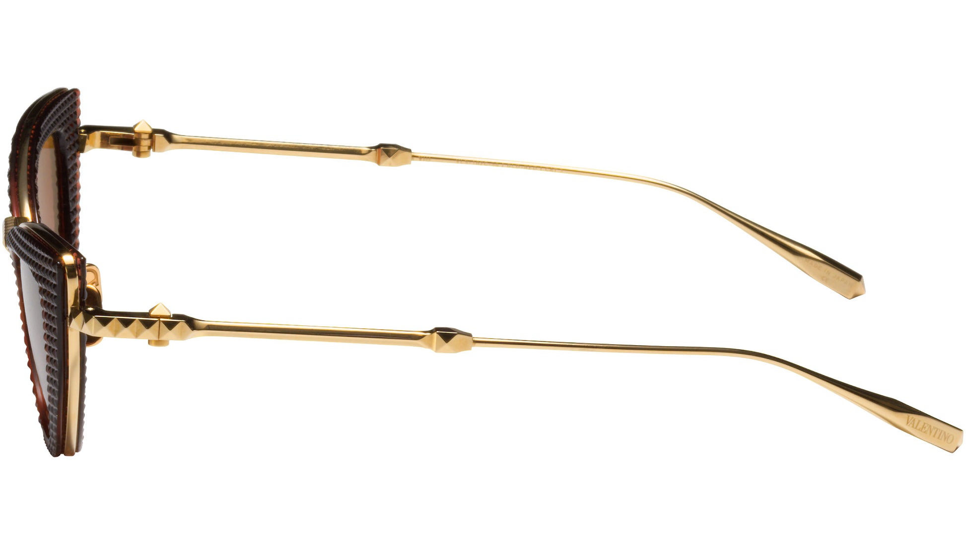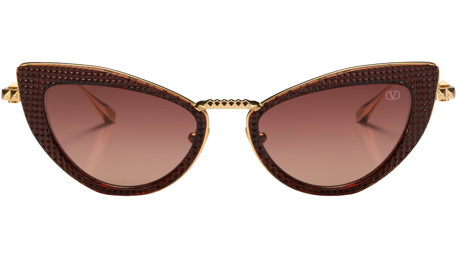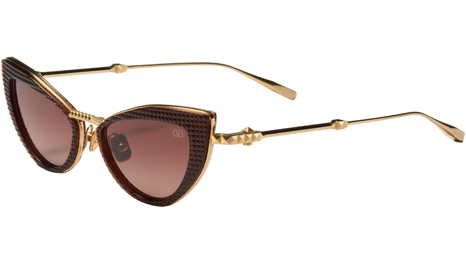 Classic in form but disruptive in its detailing, technically sophisticated design elements include iconic Valentino 3D studs on the top and front of the bridge, revolutionary twisted temples, temple tips and hinges, as well as the V-Logo laser etched on the left lens and the custom ceramic nose pads.