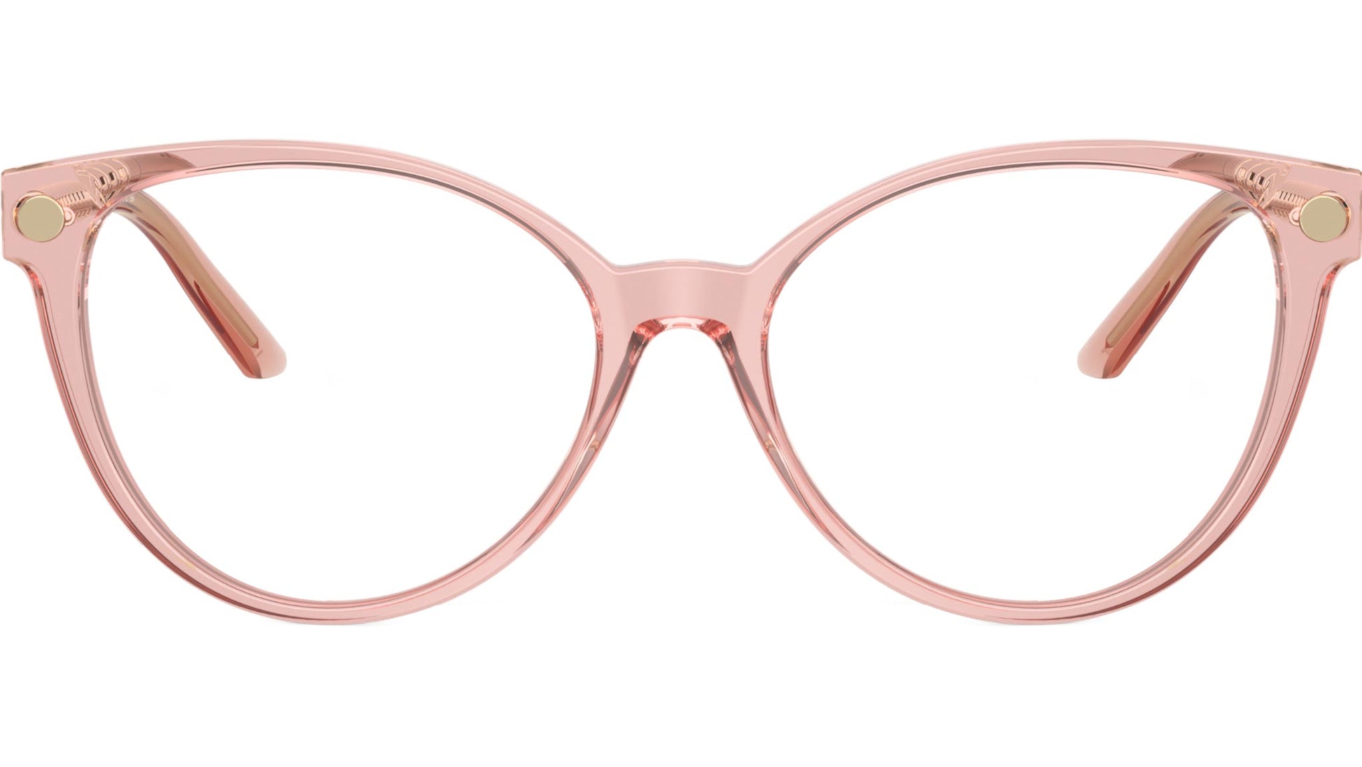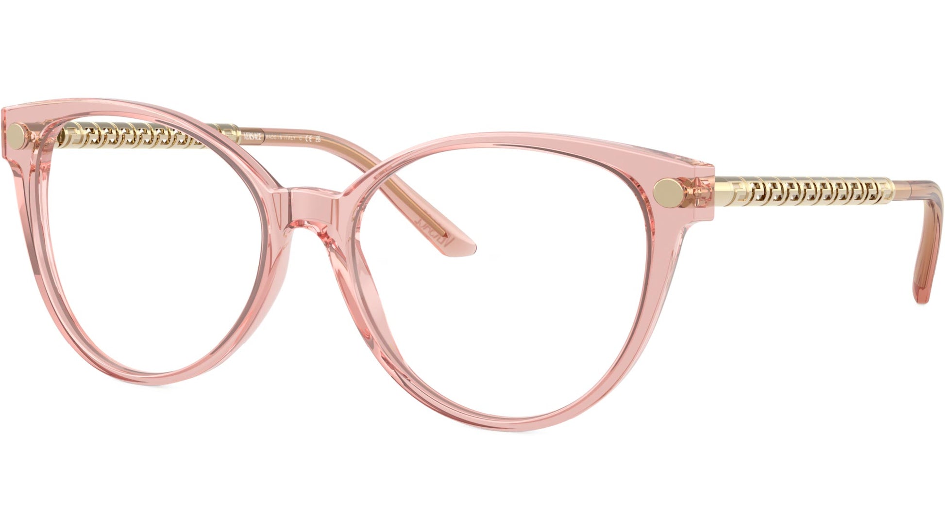 Versace optical frame for women model 3353 featuring transparent pink full rim acetate frame and base 4 demo lens. High bridge fit. Frame line: Daily Heritage. Brand code: 0VE3353. Color code: 5323. Authorised Versace Eyewear Online Reseller. Your glasses will come including the original case and accessories and will be covered by 12 month global warranty.