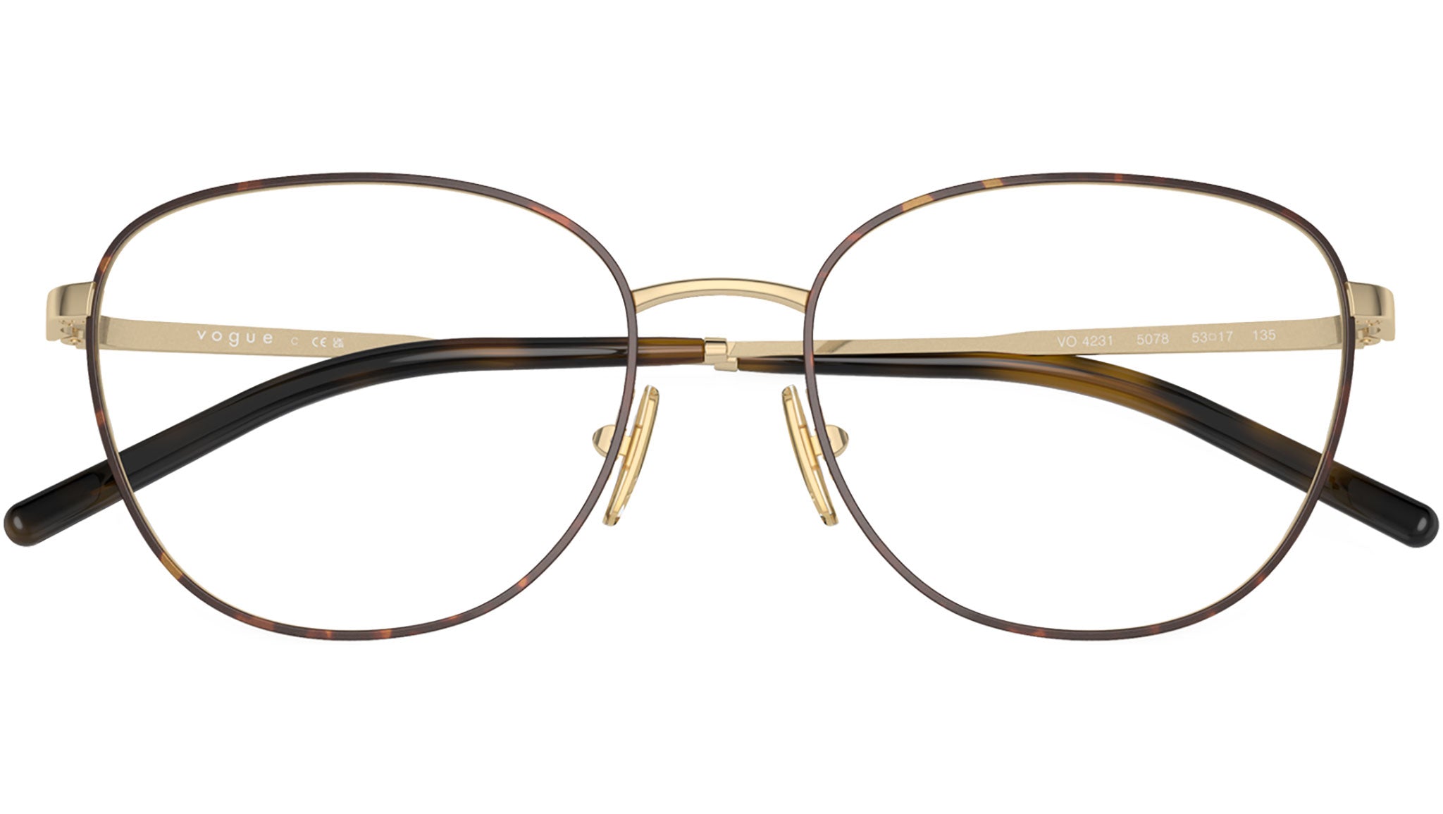 Vogue glasses for women model VO4231 5078 featuring top havana / pale gold metal frame and base 4 demo lens. Adjustable nosepads. Frame line: In Vogue. Brand code: 0VO4231. Color code: 5078. Authorised Vogue Eyewear Online Reseller. Your glasses will come including the original case and accessories and will be covered by 12 month global warranty.