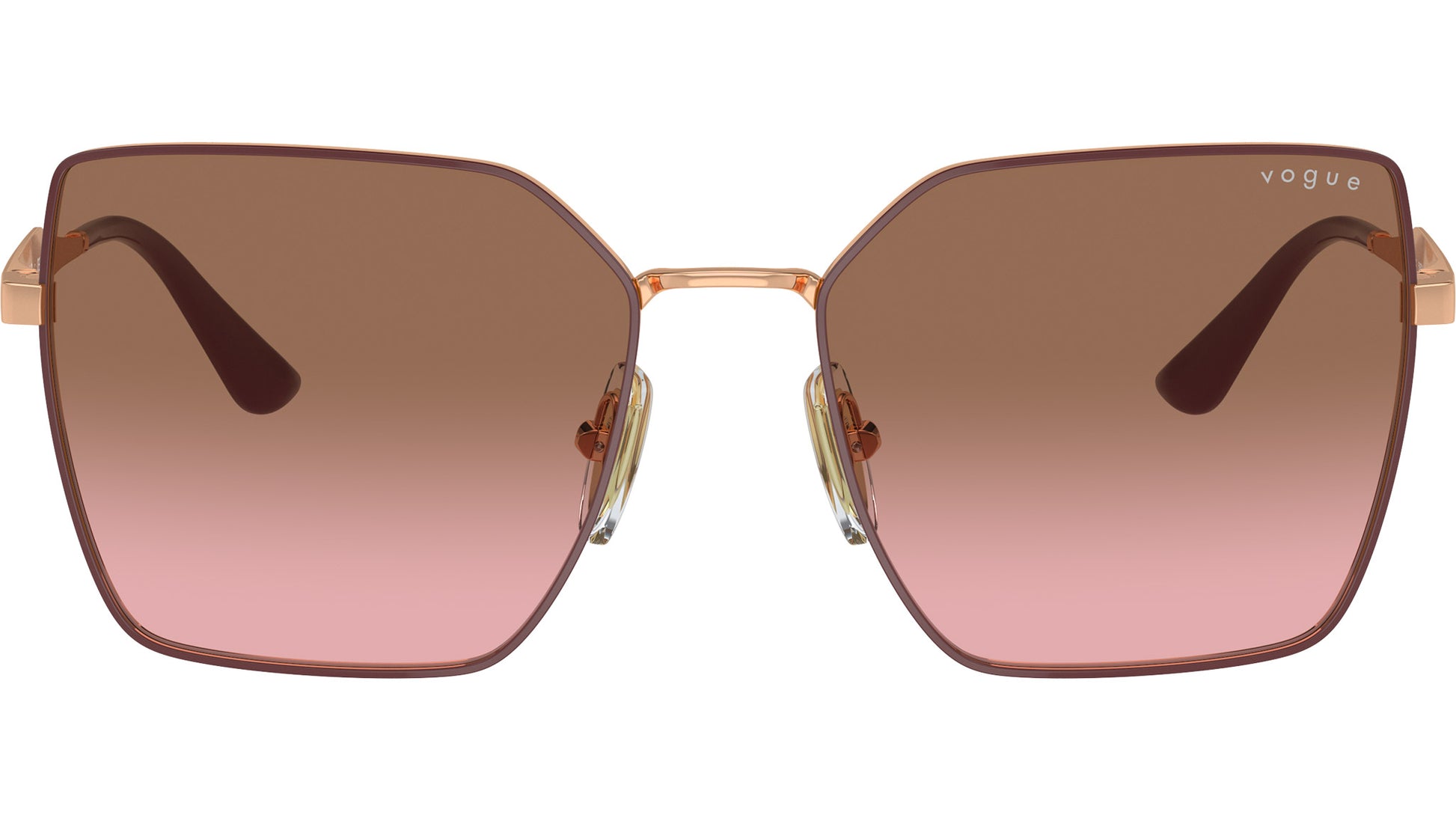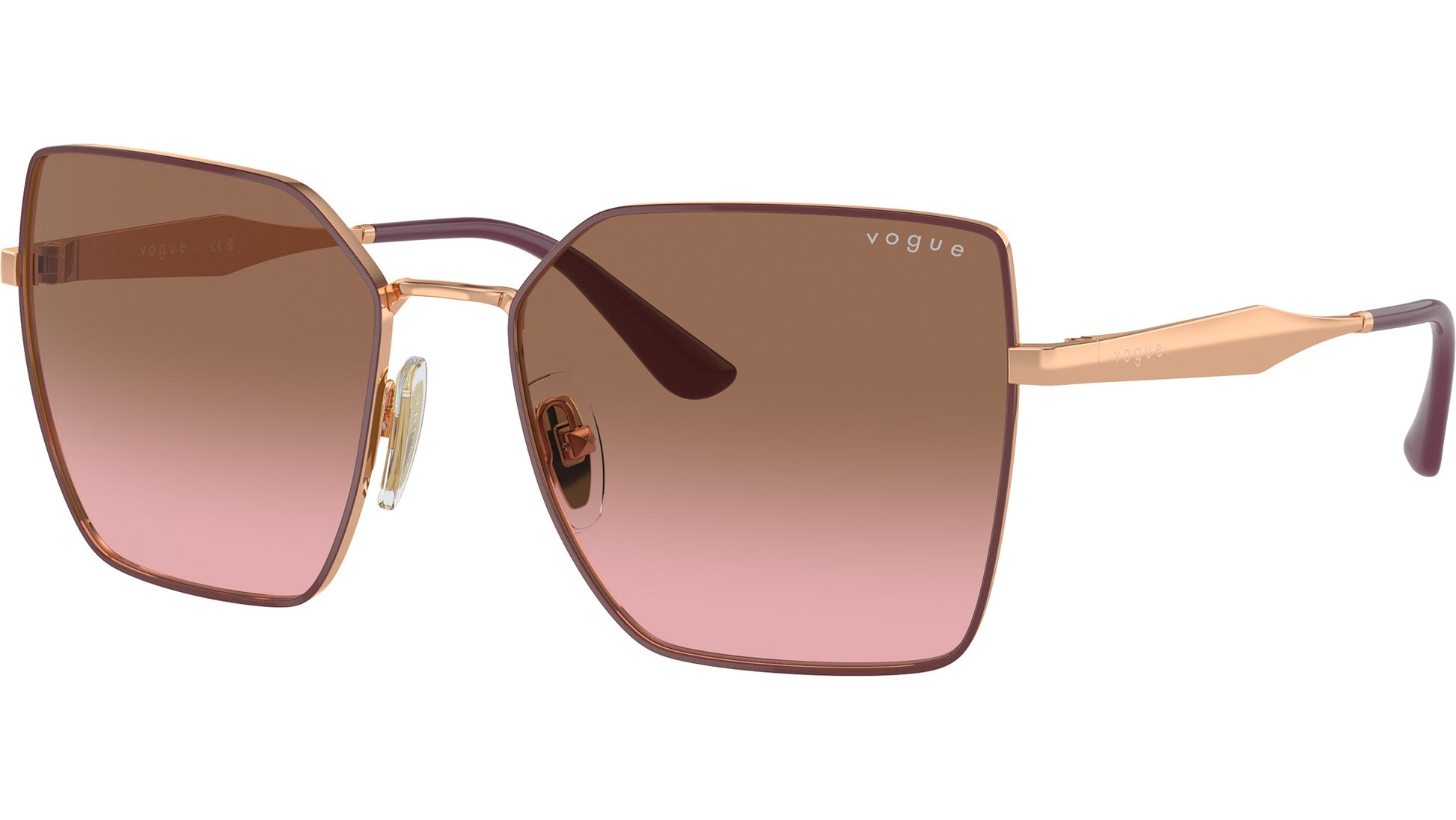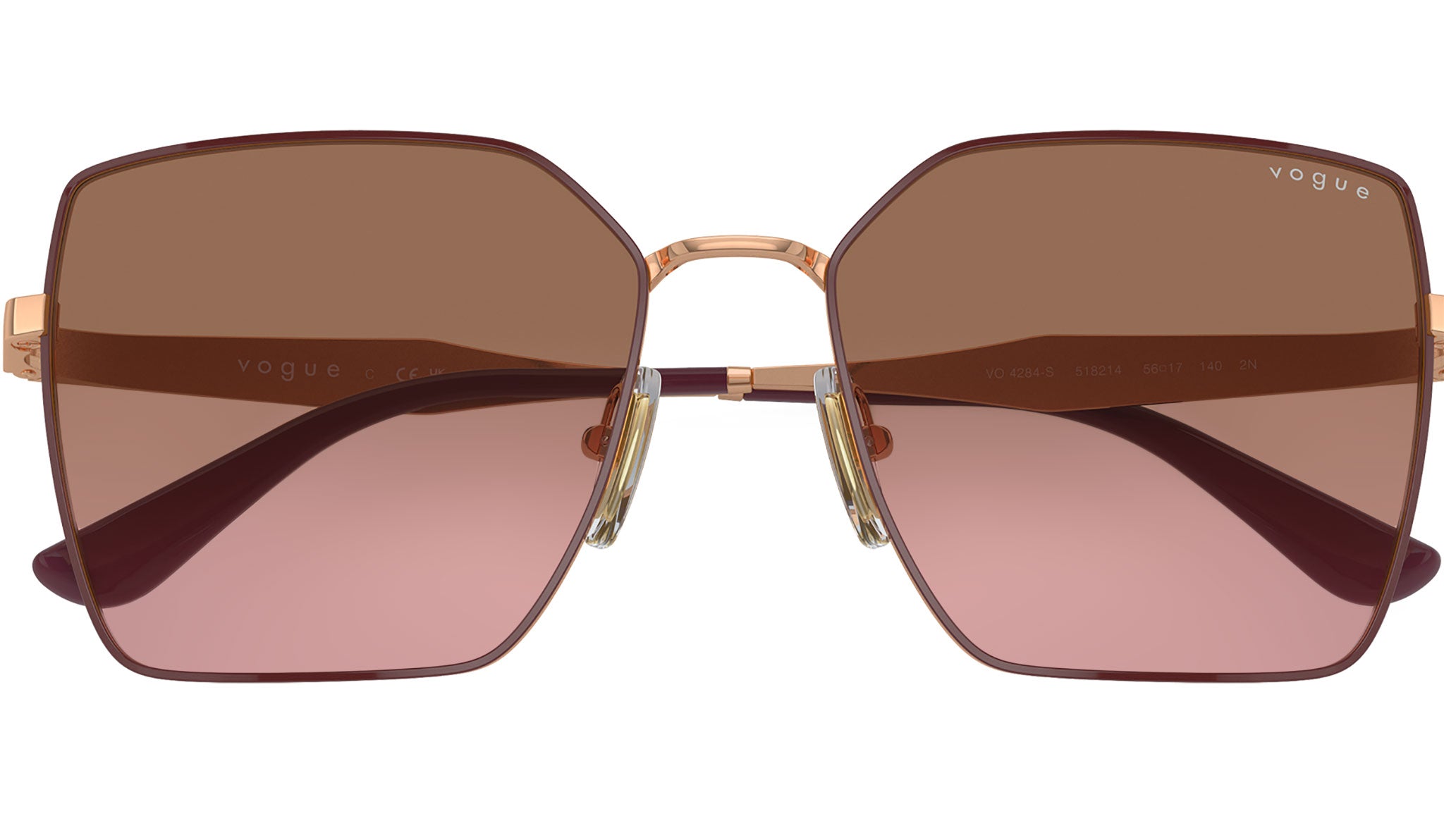 Vogue sunglasses for women model VO4284S 518214 featuring top bordeaux / rose gold metal frame and pink gradient brown base 6 polycarbonate lenses. Adjustable nosepads. Frame line: In Vogue. Brand code: 0VO4284S. Color code: 518214. Authorised Vogue Eyewear Online Reseller. Your glasses will come including the original case and accessories and will be covered by 12 month global warranty.