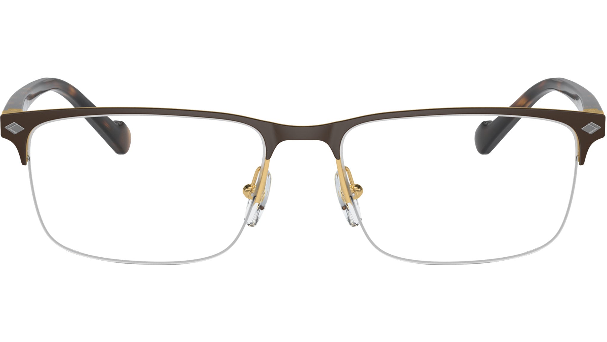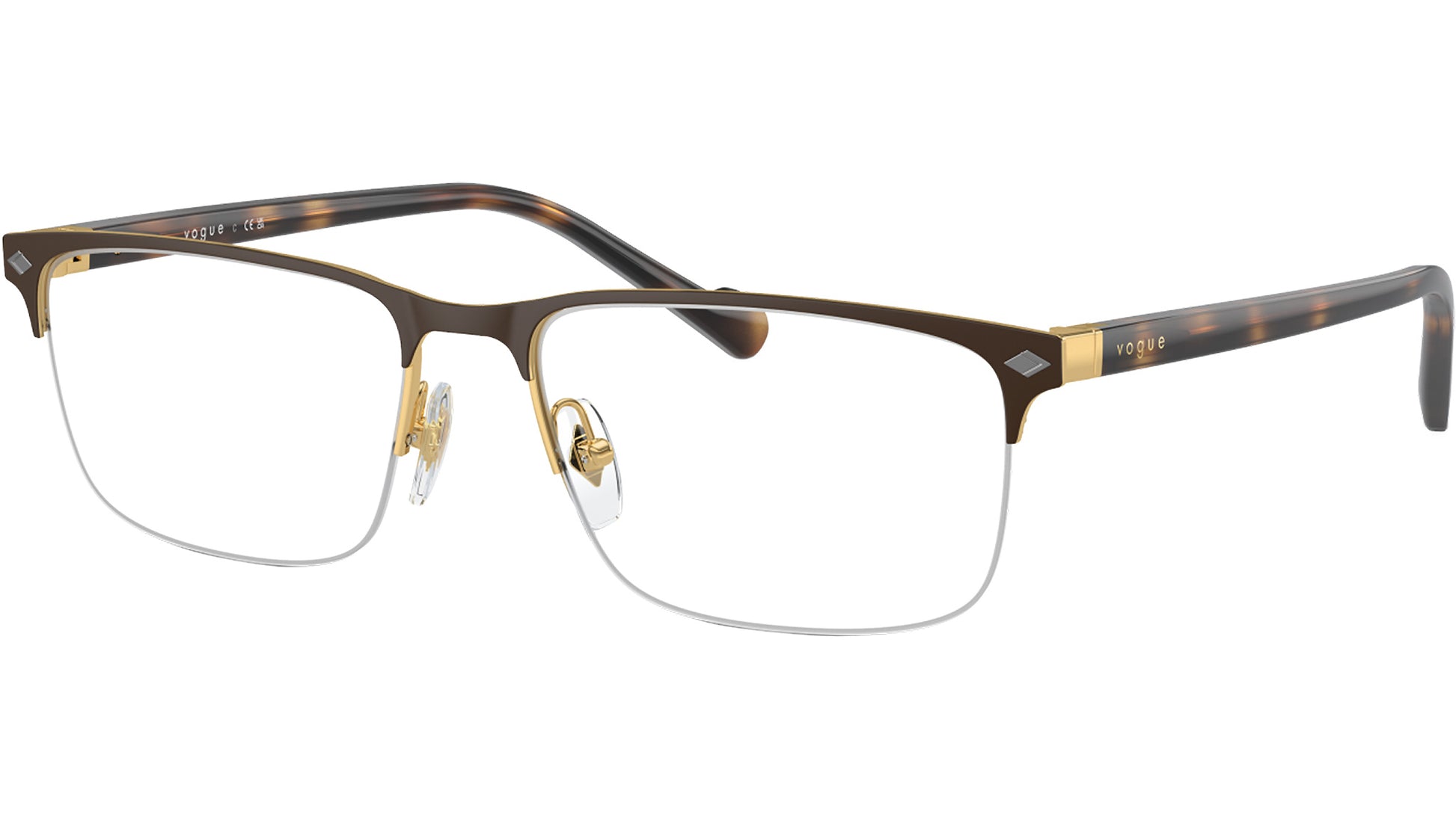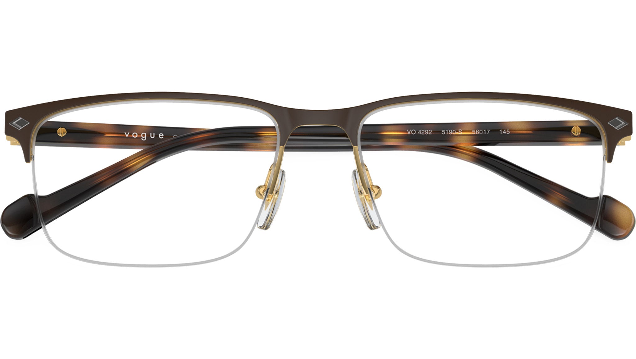 Vogue glasses for men model VO4292 5190S featuring top matte brown / gold metal frame and base 4 demo lens. Adjustable nosepads. Frame line: Man. Brand code: 0VO4292. Color code: 5190S. Authorised Vogue Eyewear Online Reseller. Your glasses will come including the original case and accessories and will be covered by 12 month global warranty.