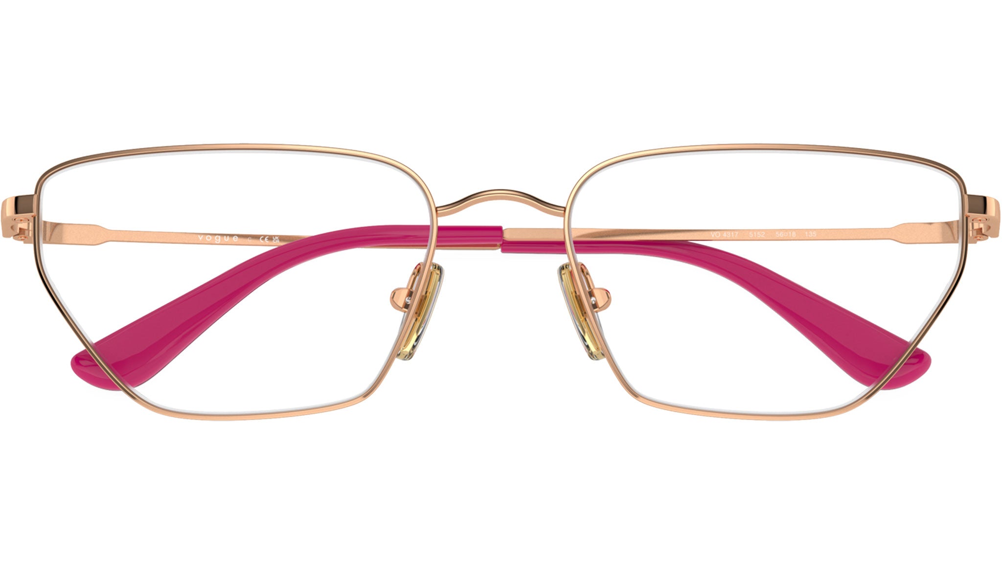 Vogue glasses for women model VO4317 5152 featuring rose gold metal frame and base 4 demo lens. Adjustable nosepads. Frame line: Forerunner. Brand code: 0VO4317. Color code: 5152. Authorised Vogue Eyewear Online Reseller. Your glasses will come including the original case and accessories and will be covered by 12 month global warranty.