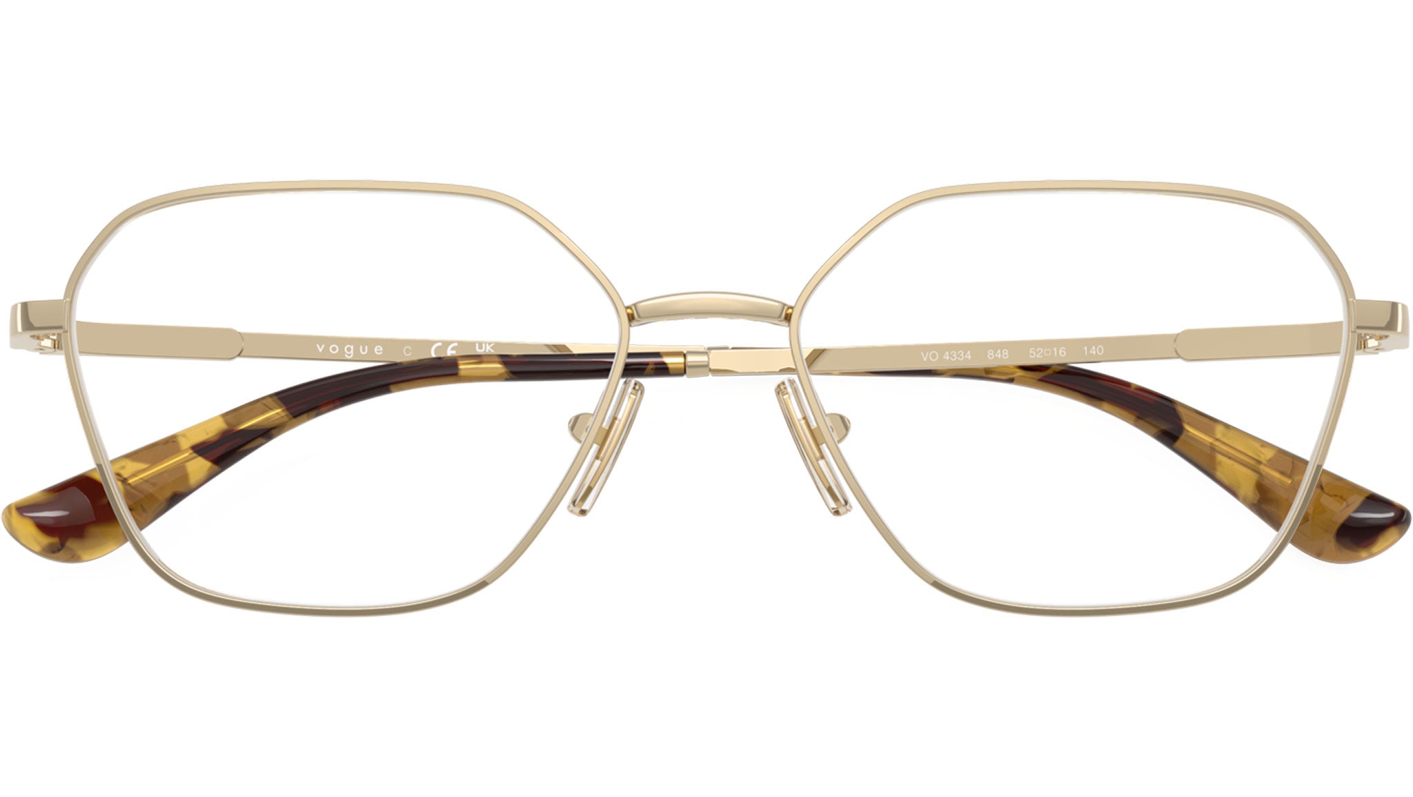 Vogue glasses for women model VO4334 848 featuring pale gold metal frame and base 4 demo lens. Adjustable nosepads. Frame line: In Vogue. Brand code: 0VO4334. Color code: 848. Authorised Vogue Eyewear Online Reseller. Your glasses will come including the original case and accessories and will be covered by 12 month global warranty.