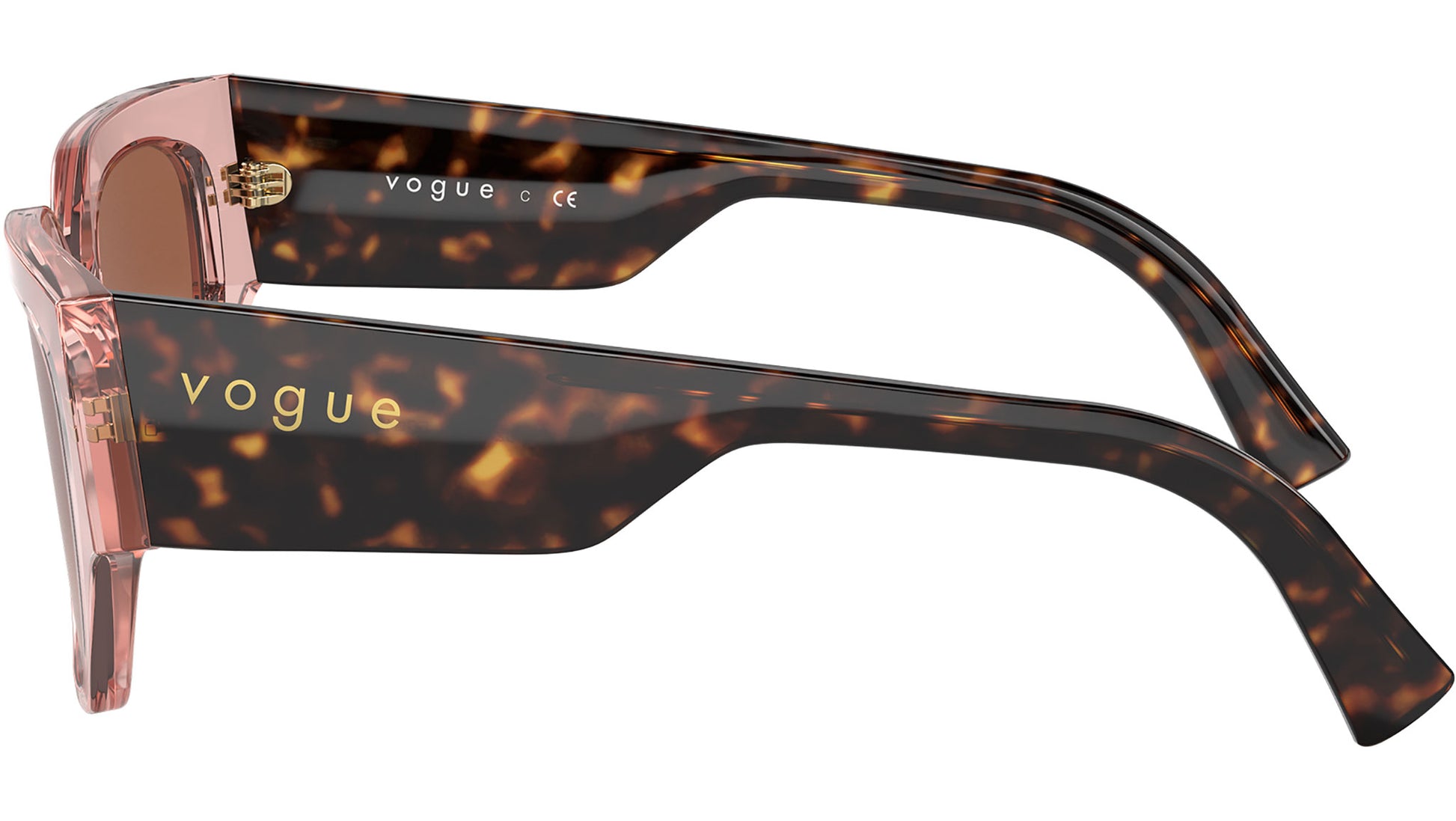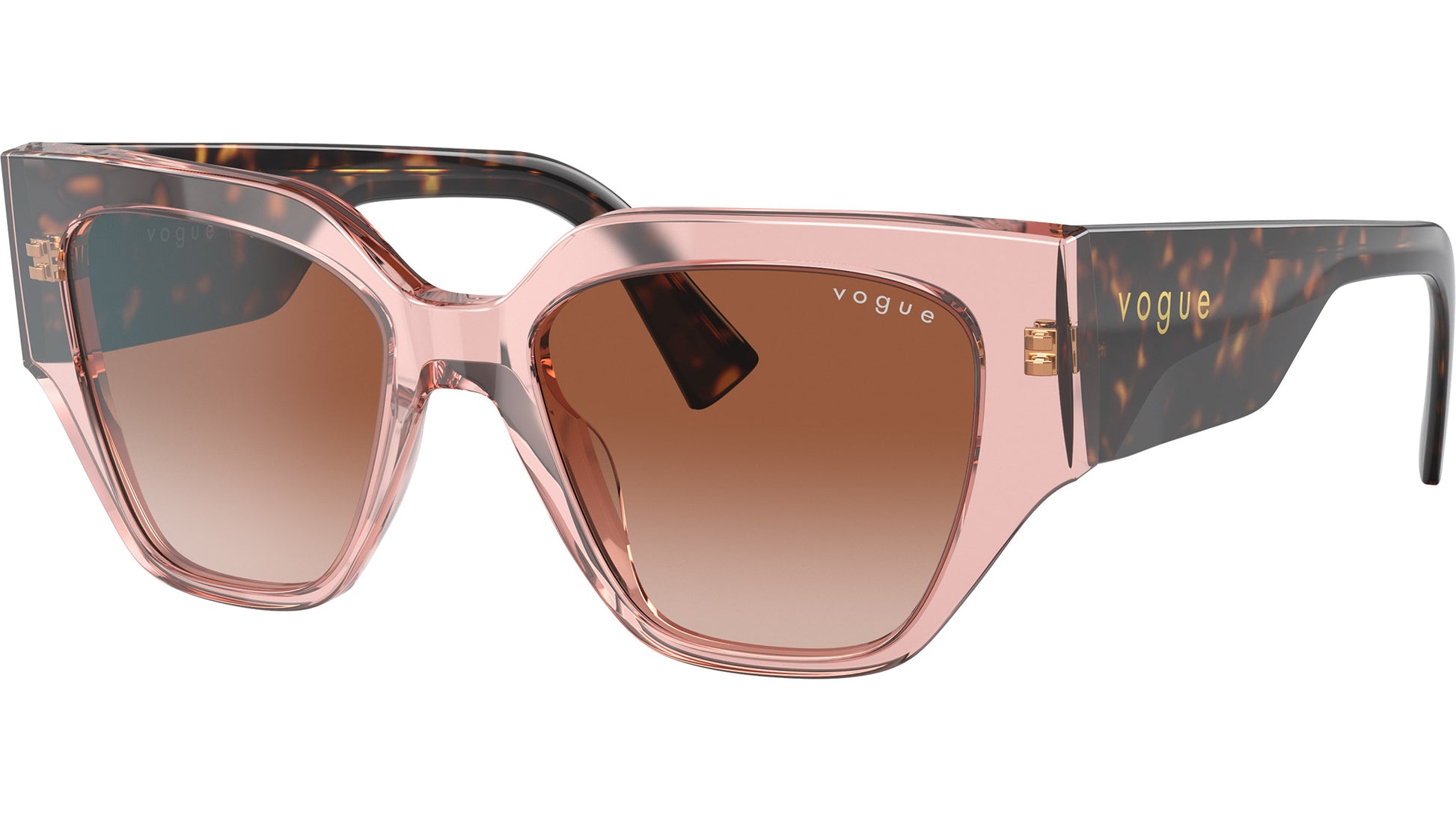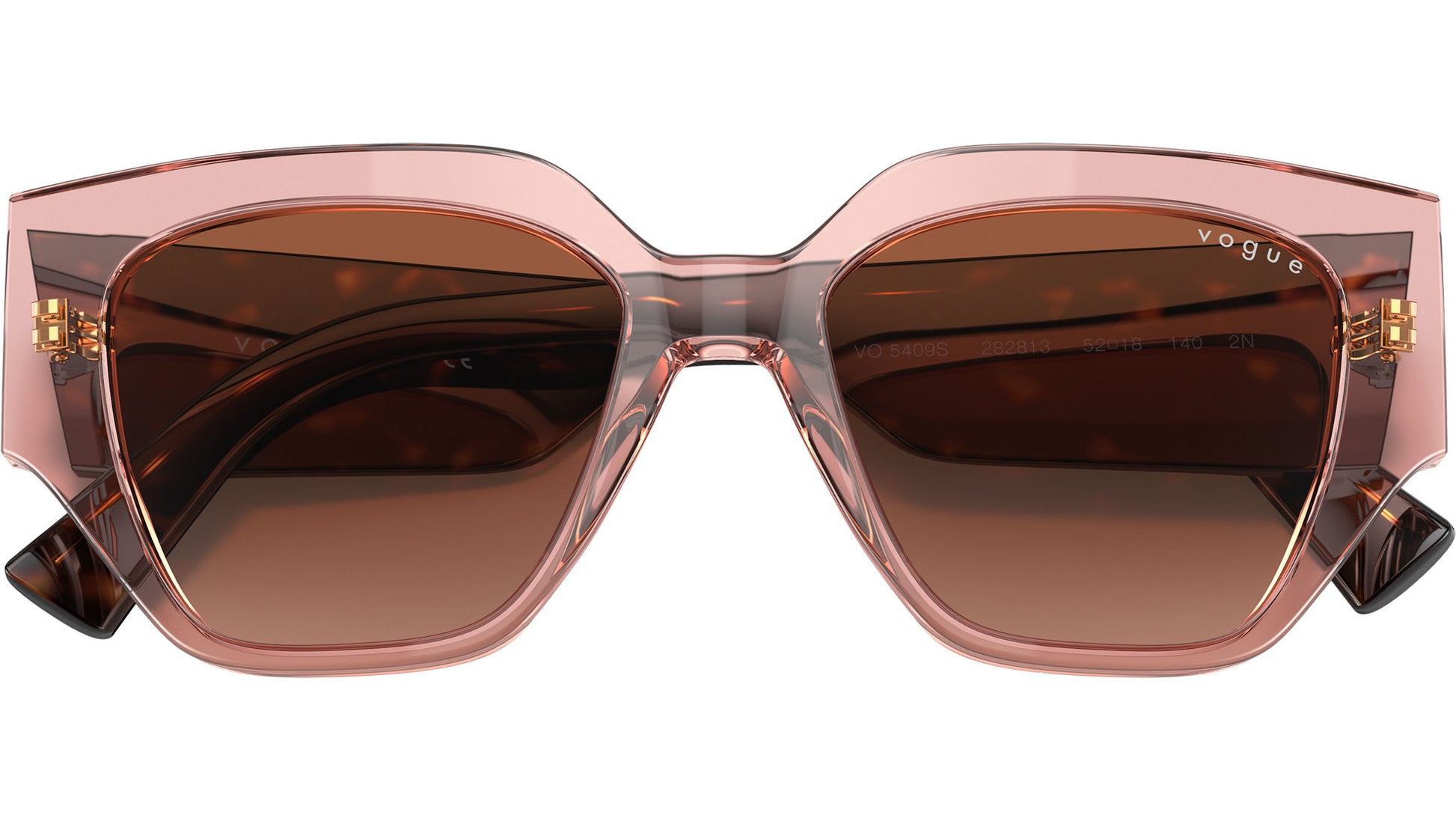 Vogue sunglasses for women model VO5409S 282813 featuring transparent pink acetate frame and brown gradient base 6 CR-39 lenses. High bridge fit. Frame line: Forerunner. Brand code: 0VO5409S. Color code: 282813. Authorised Vogue Eyewear Online Reseller. Your glasses will come including the original case and accessories and will be covered by 12 month global warranty.