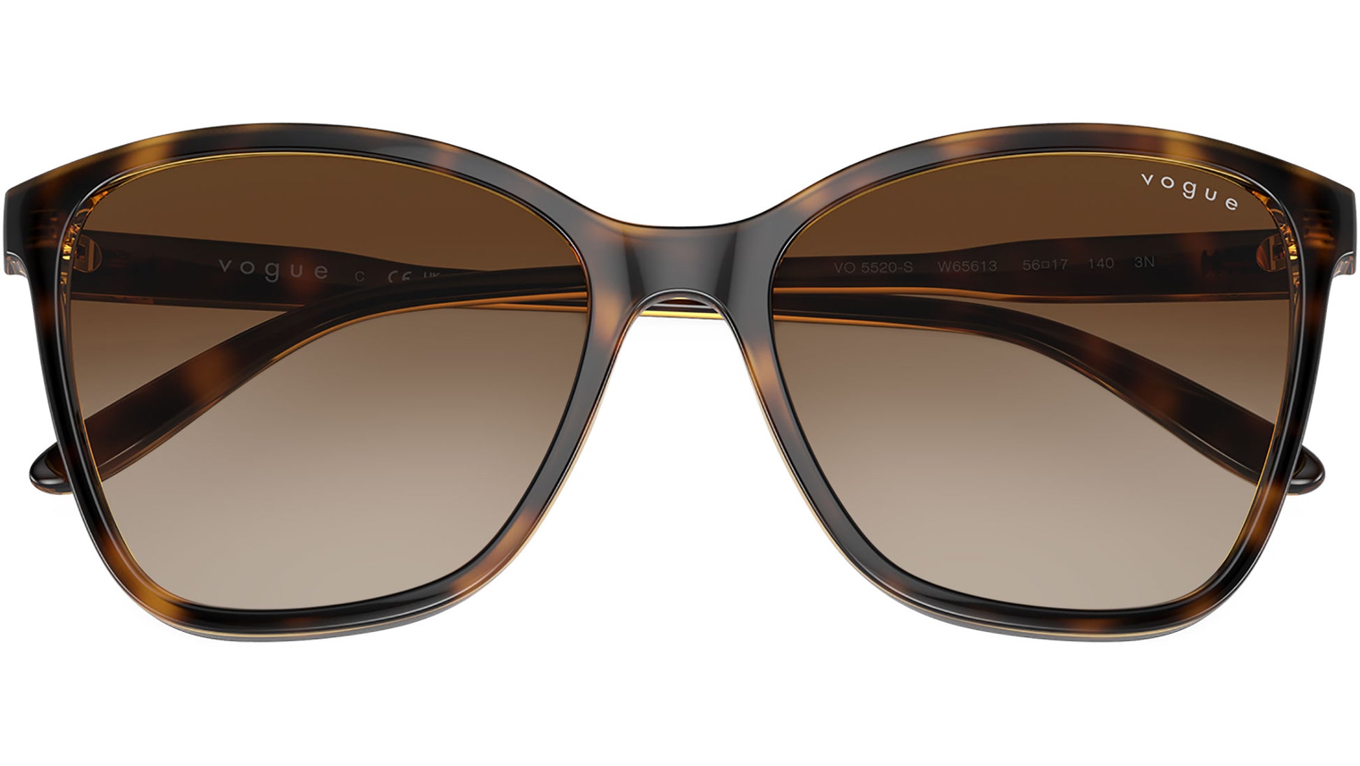 Vogue sunglasses for women model VO5520S W65613 featuring dark havana nylon frame and brown gradient base 6 polycarbonate lenses. High bridge fit. Frame line: Evergreen. Brand code: 0VO5520S. Color code: W65613. Authorised Vogue Eyewear Online Reseller. Your glasses will come including the original case and accessories and will be covered by 12 month global warranty.