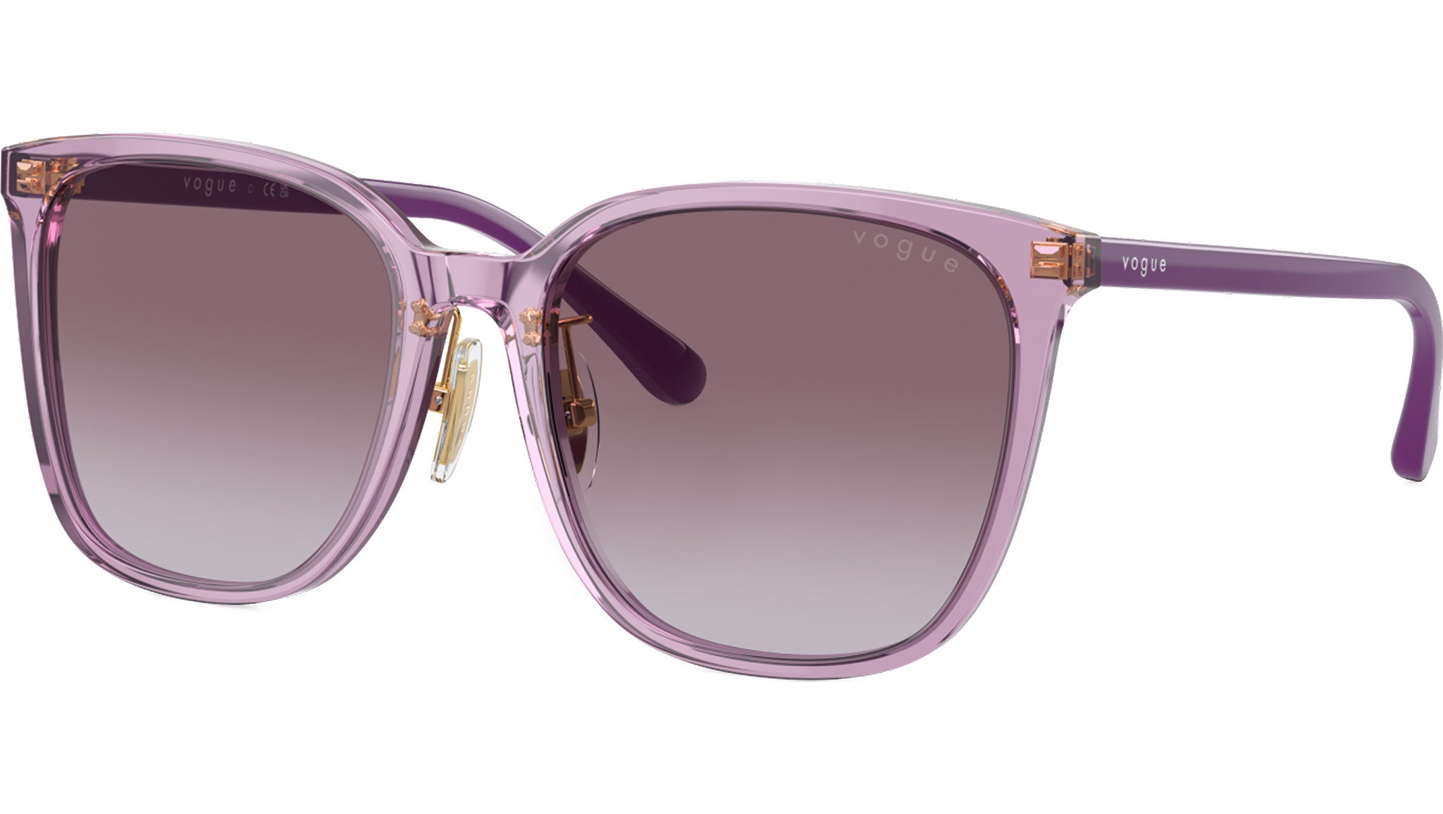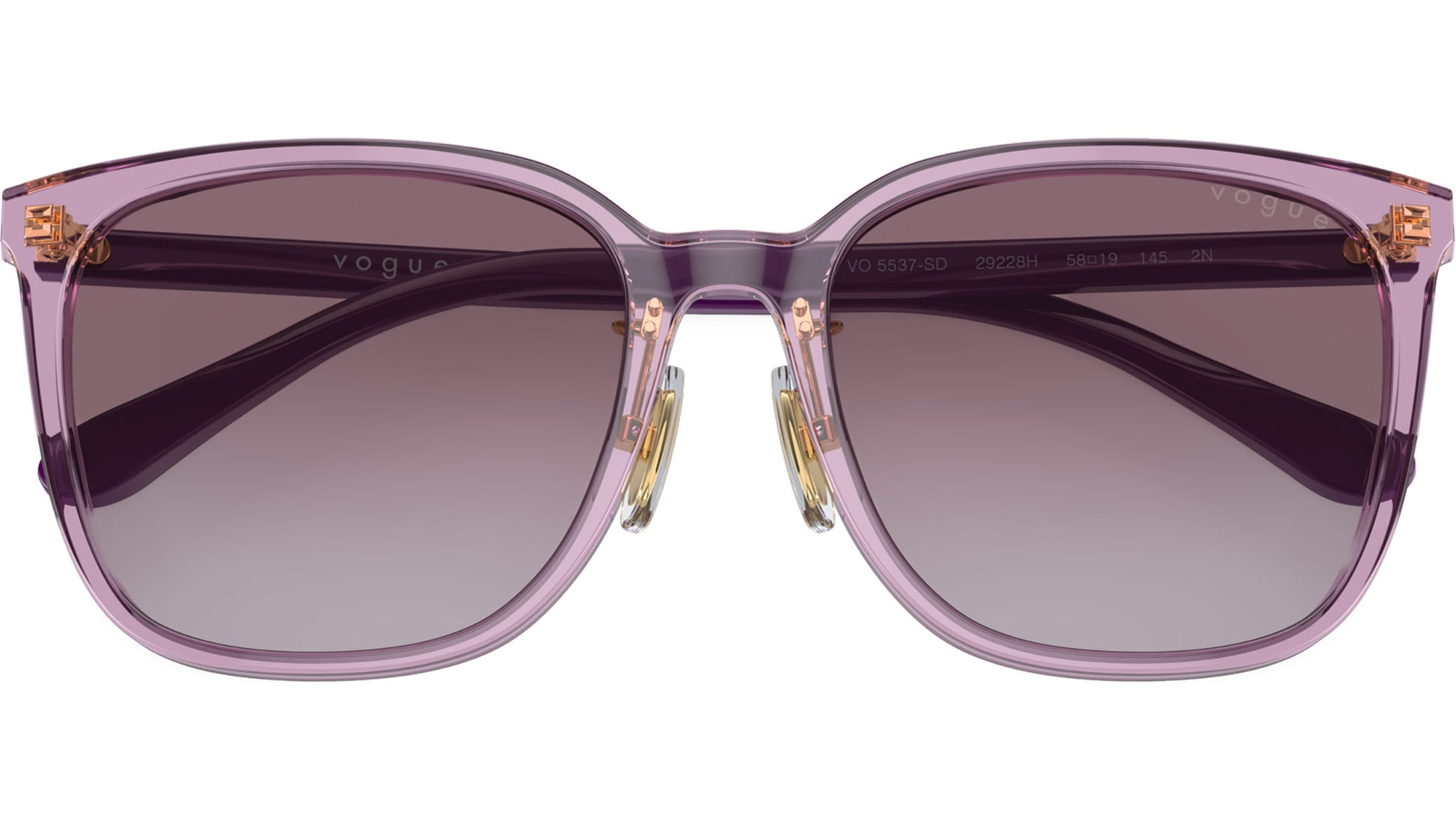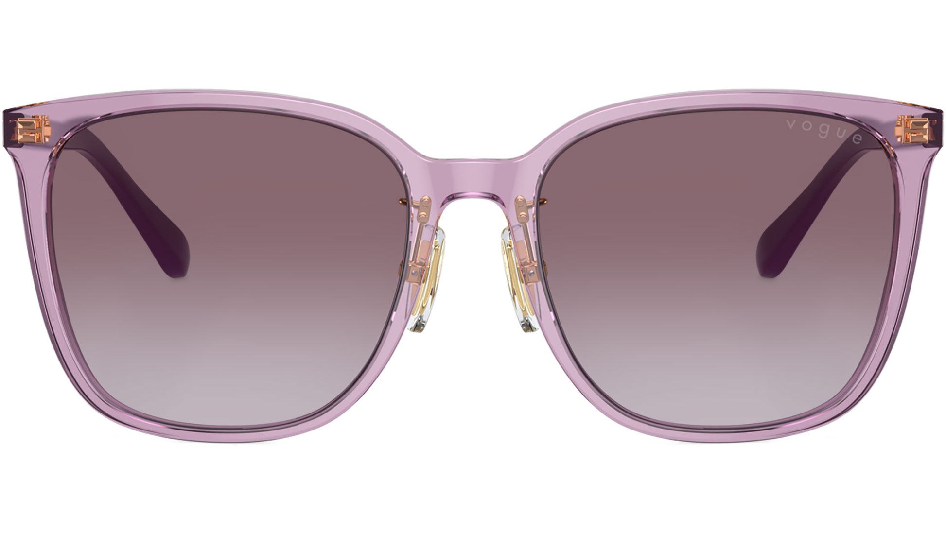 Vogue sunglasses for women model VO5537SD 29228H featuring transparent violet acetate frame and violet gradient base 4 CR-39 lenses. Low bridge fit. Frame line: In Vogue. Brand code: 0VO5537SD. Color code: 29228H. Authorised Vogue Eyewear Online Reseller. Your glasses will come including the original case and accessories and will be covered by 12 month global warranty.