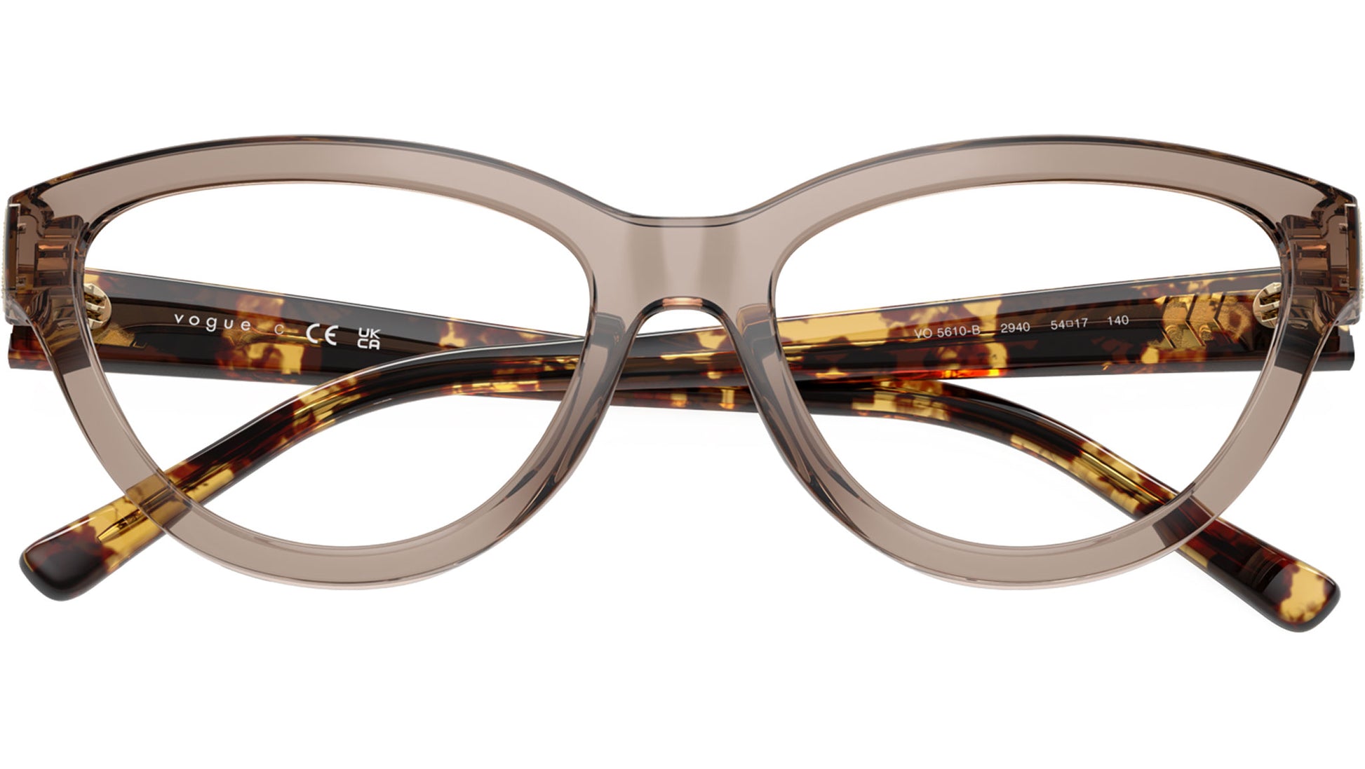 Vogue glasses for women model VO5610B 2940 featuring transparent brown nylon frame and base 4 demo lens. High bridge fit. Frame line: In Vogue. Brand code: 0VO5610B. Color code: 2940. Authorised Vogue Eyewear Online Reseller. Your glasses will come including the original case and accessories and will be covered by 12 month global warranty.