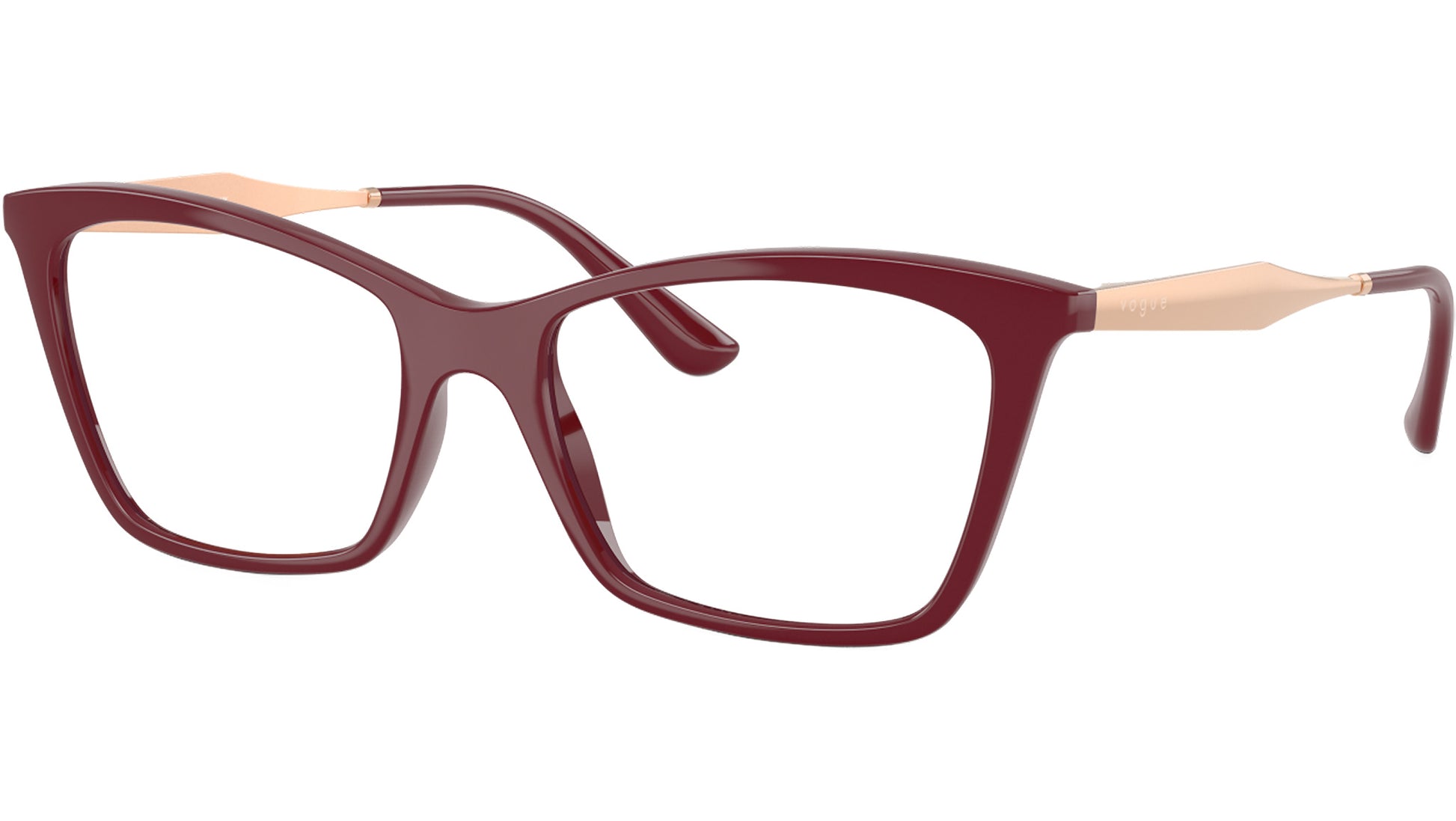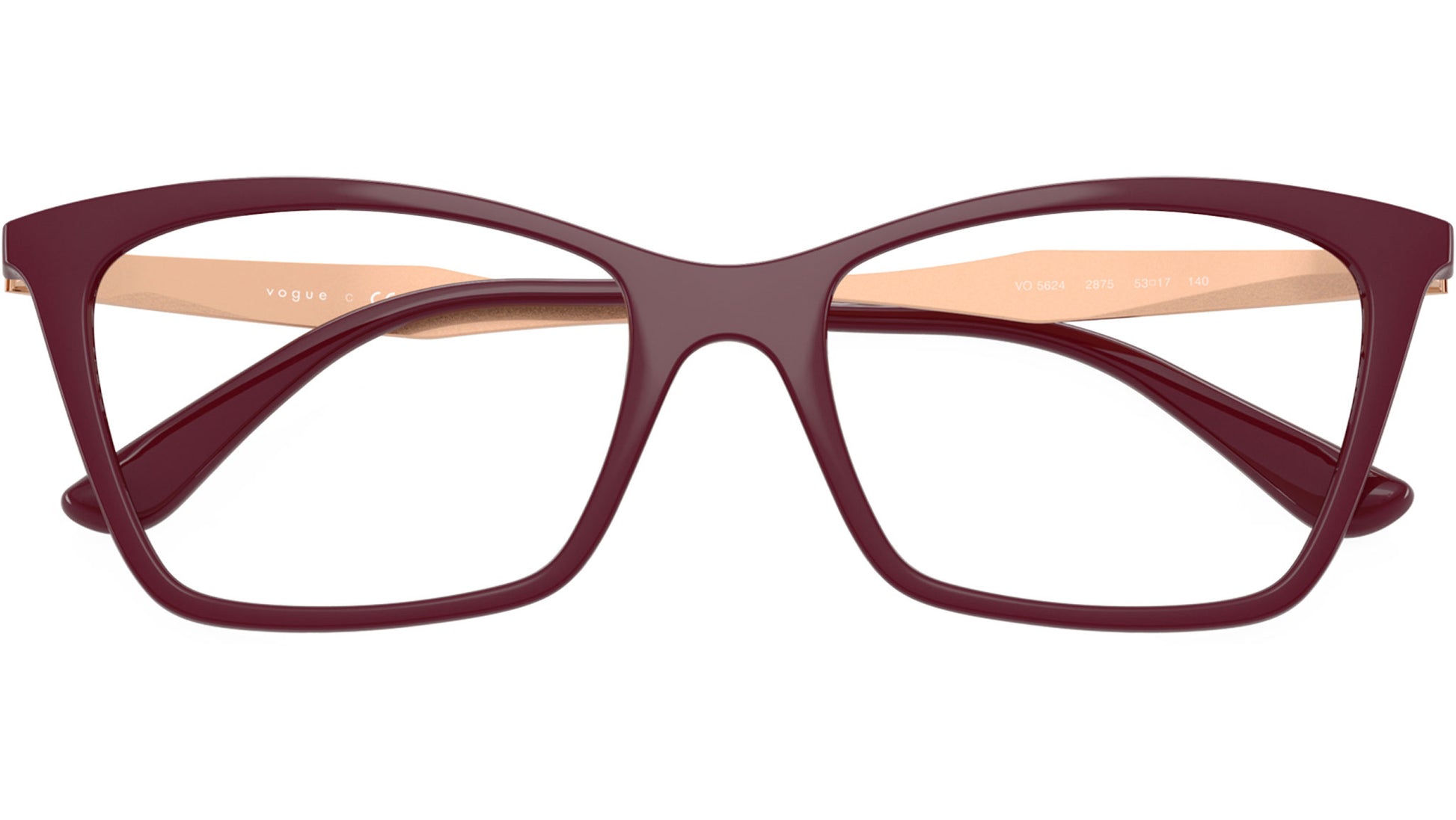 Vogue glasses for women model VO5624 2875 featuring full cherry nylon frame and base 4 demo lens. High bridge fit. Frame line: In Vogue. Brand code: 0VO5624. Color code: 2875. Authorised Vogue Eyewear Online Reseller. Your glasses will come including the original case and accessories and will be covered by 12 month global warranty.