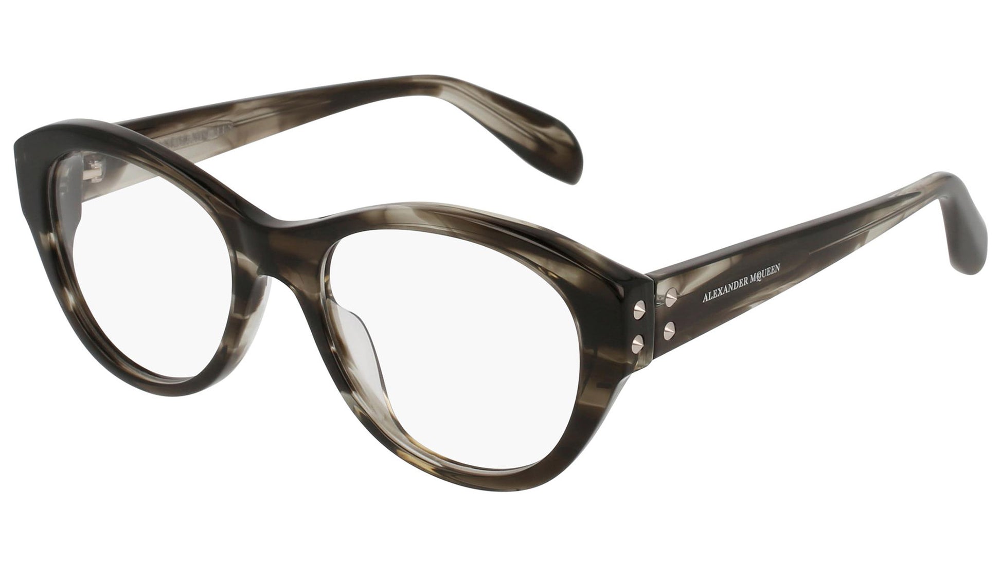 Alexander McQueen optical glasses model AM0053O 004 featuring striped grey havana frame and havana colour temple. Synonymous with fearless fashion, Alexander McQueen Eyewear eyewear styles represent a juxtaposition between contrasting elements, as his runway styles are unique and inspiring.