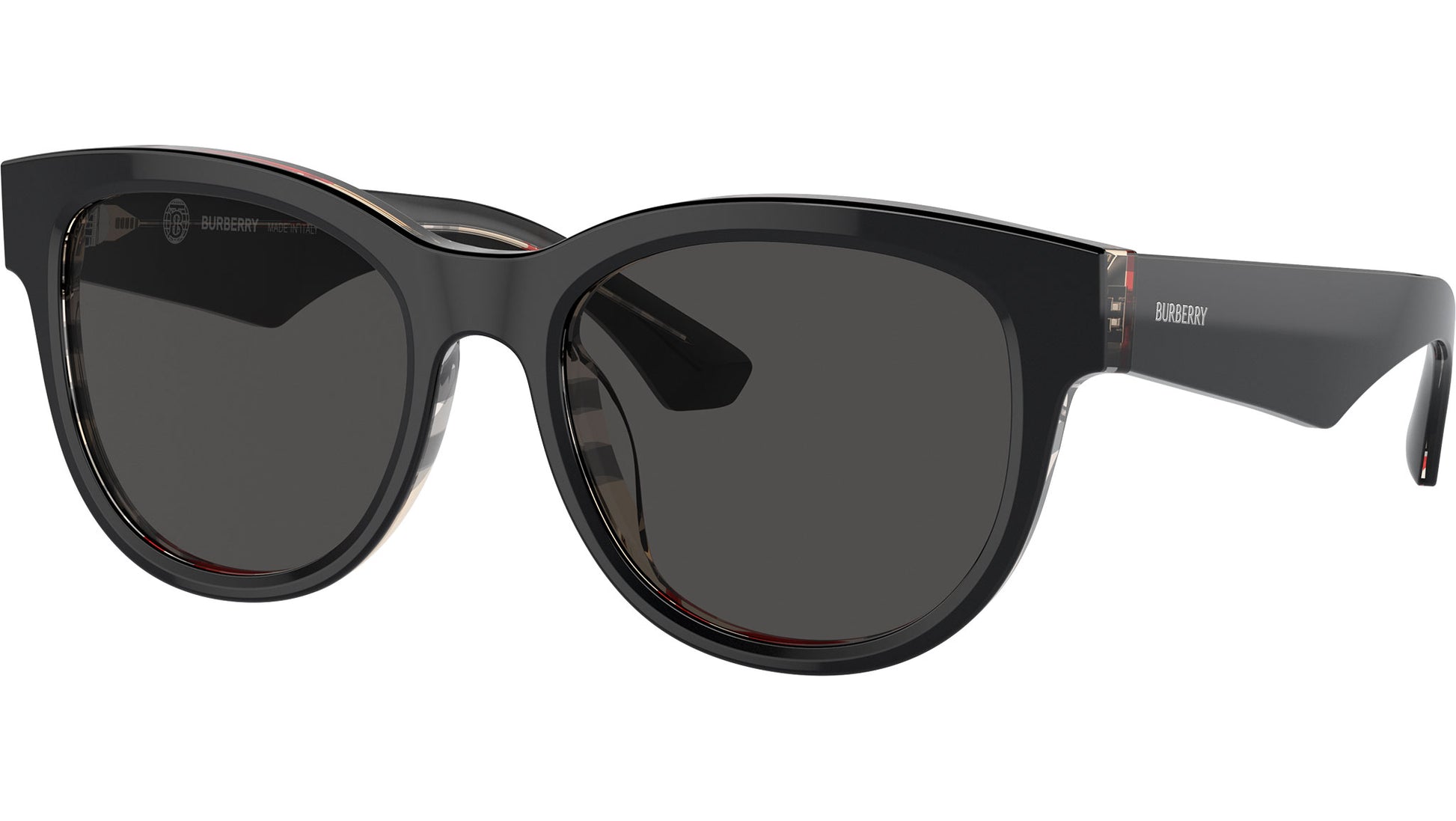 Gafas de sol Burberry para mujer modelo 4432U con parte superior negra sobre montura de acetato de borde completo a cuadros vintage y lentes de base 4 curvadas de color gris oscuro. Ajuste universal. Línea de marco: Icono de verificación. Código de marca: BE4432U. Código de color: 412187. Distribuidor online autorizado de Burberry. Tus gafas vendrán con el estuche y los accesorios originales y estarán cubiertas por una garantía global de 12 meses.