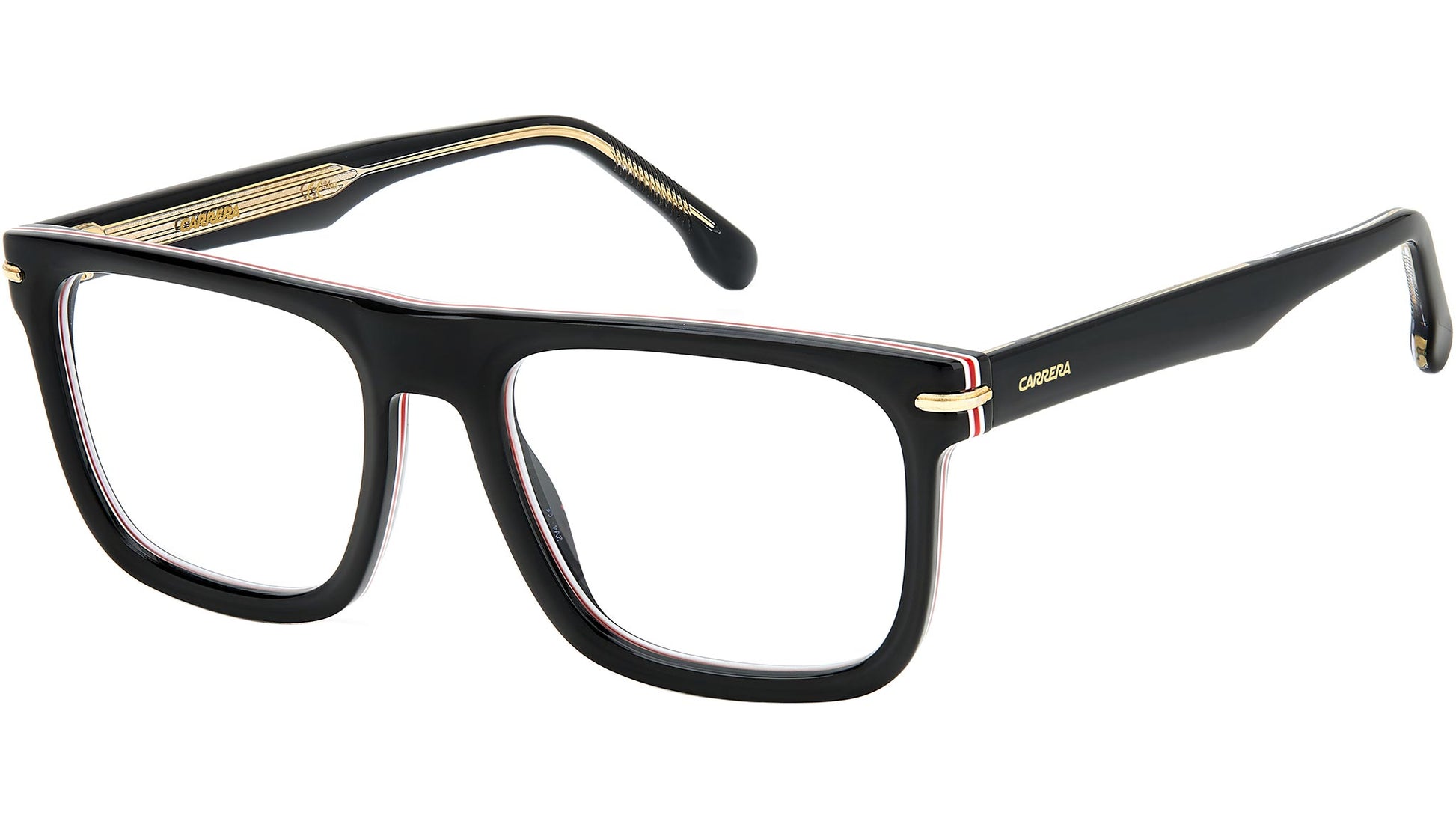 Montura óptica Carrera modelo 312 código de color M4P Negro Rayado. Destinados a reescribir las reglas, estos espejuelos yuxtaponen referencias vintage con monturas atrevidas y contemporáneas. Plana a lo largo de la línea de las cejas, la estructura 100 % de acetato está disponible incluso en una versión con frente multicapa. Los tonos atemporales crean un contraste con los detalles metálicos en las esquinas exteriores para dar un verdadero impulso a los looks cotidianos. Las varillas son un homenaje a la historia de la marca, con su silueta en forma de aleta, que se hace aún más notable gracias al núcleo visible y al logotipo de Carrera.