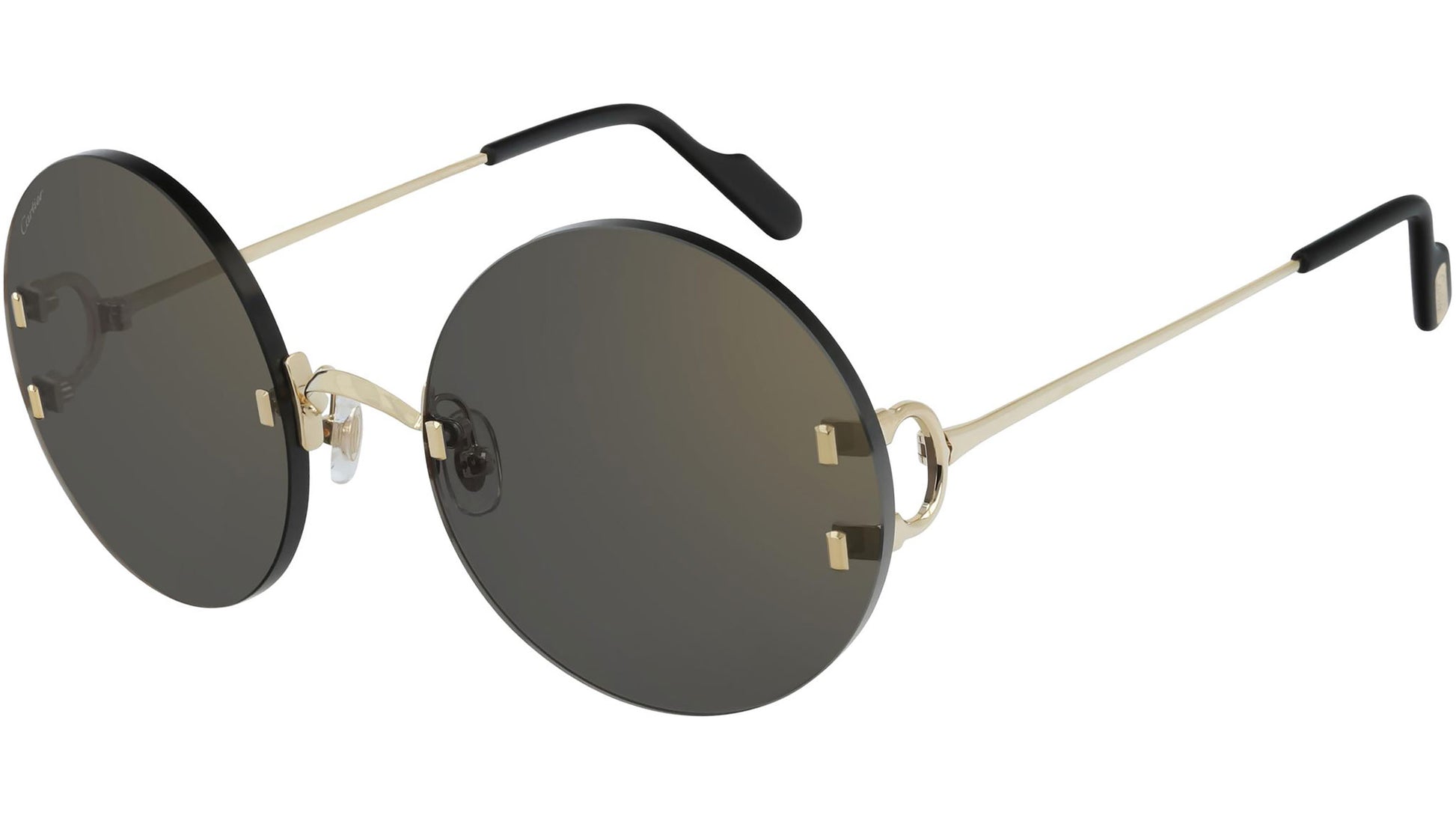 Cartier CT0152S 001 sunglasses with smooth champagne golden frame and grey with a golden flash lens.