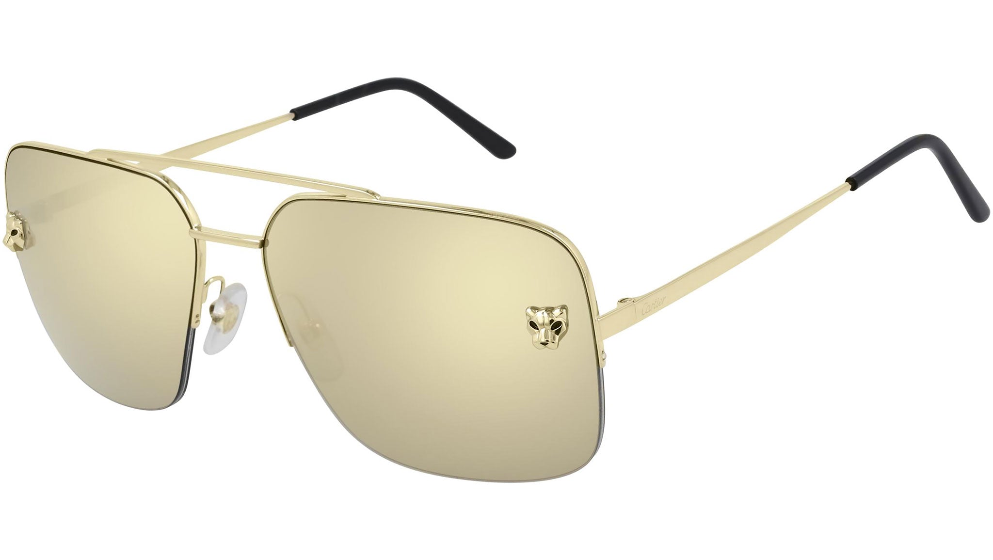Cartier CT0244S 003 sunglasses with smooth golden frame and grey with a bronze mirror lens.